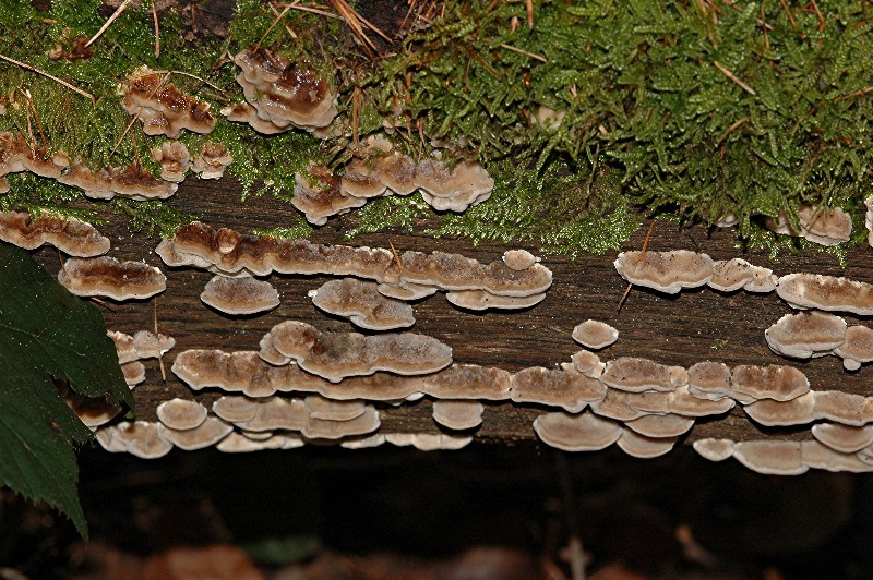 Was anderes als Schmetterlings-Tramete (Trametes versicolor), die zugegebenermaßen in diesem Fall schon recht reihig wächst, fällt mir nicht ein.