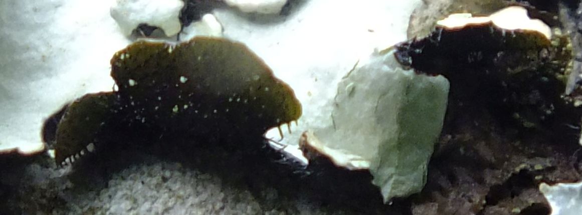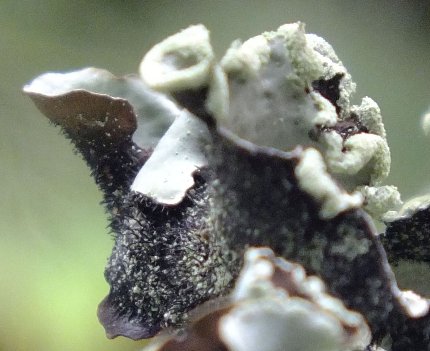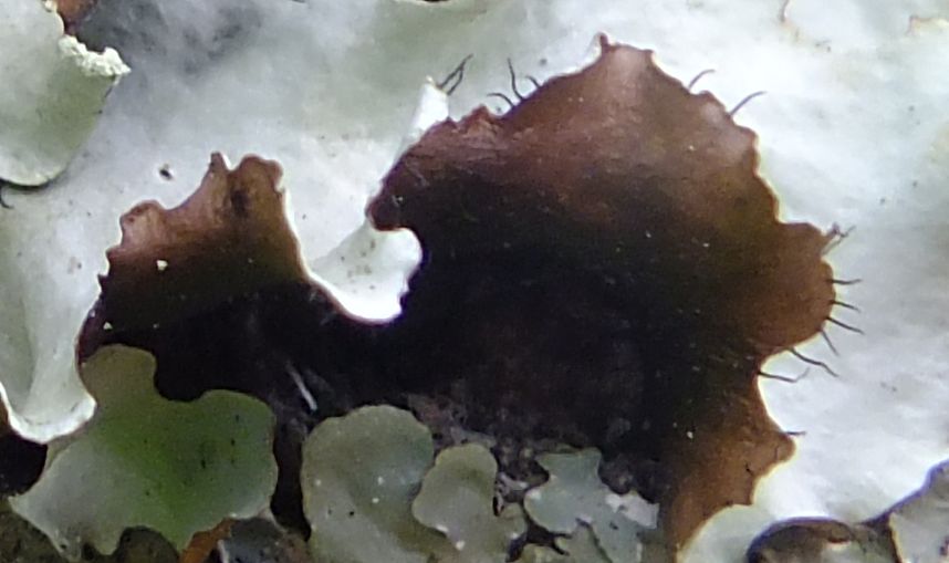An den Lappenrändern wachsen schwarze Rhizinien, die über den Rand hinaus stehen und auch von der Oberseite aus sichtbar sind (Bild 2).