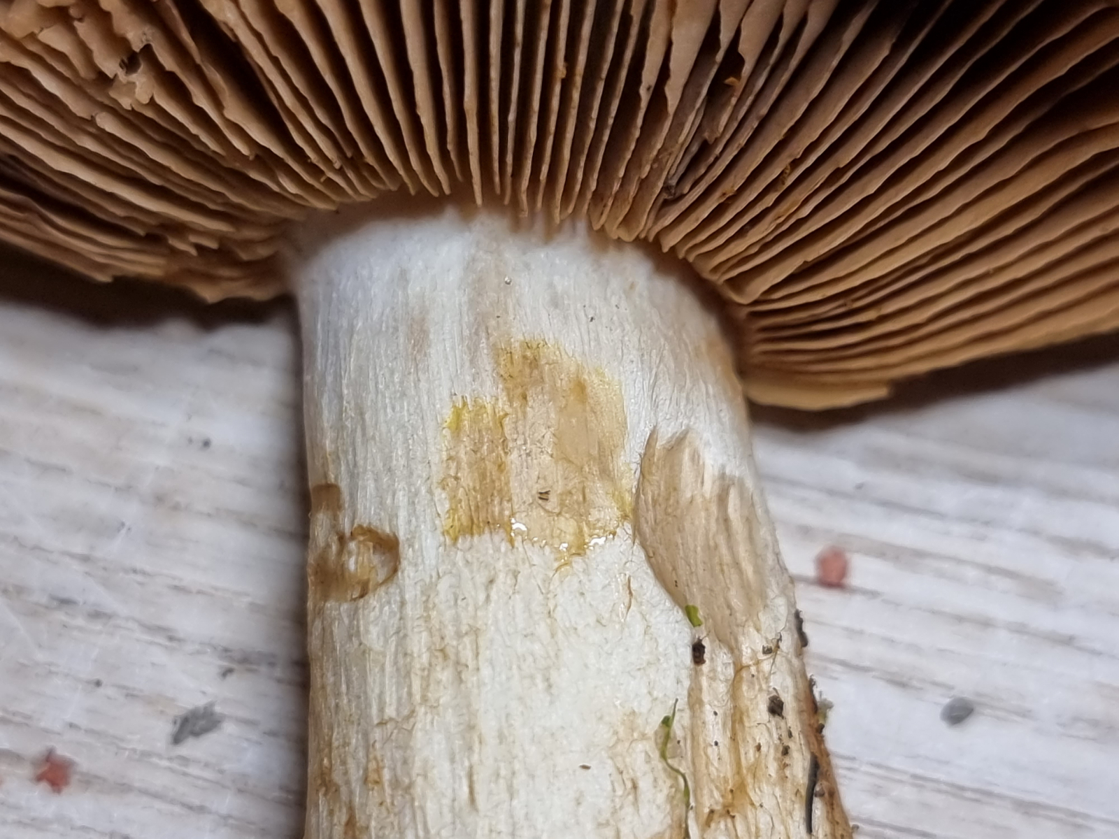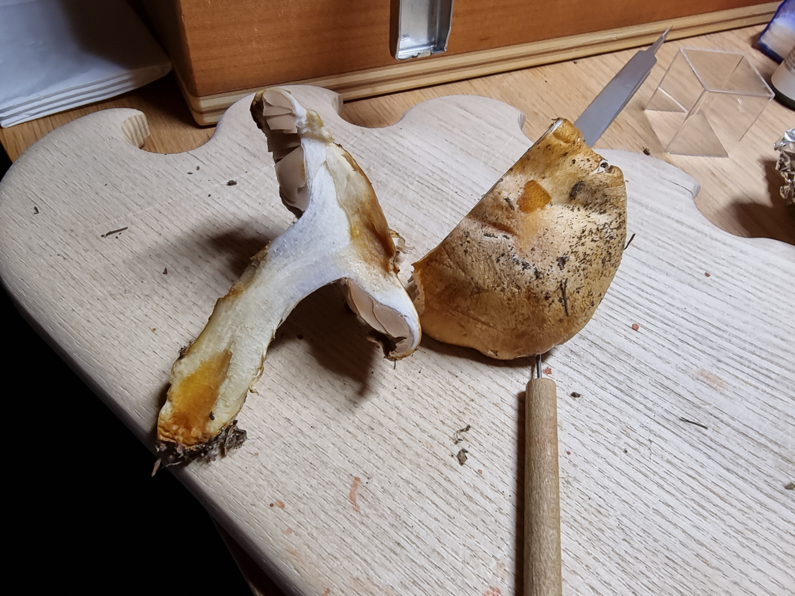Hier die KOH-Reaktion (3%): auf dem Hut, im Hutfleisch und in der Stielbasis.