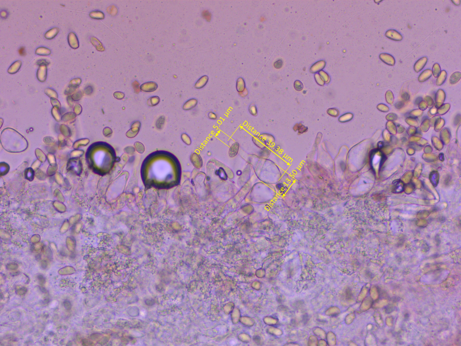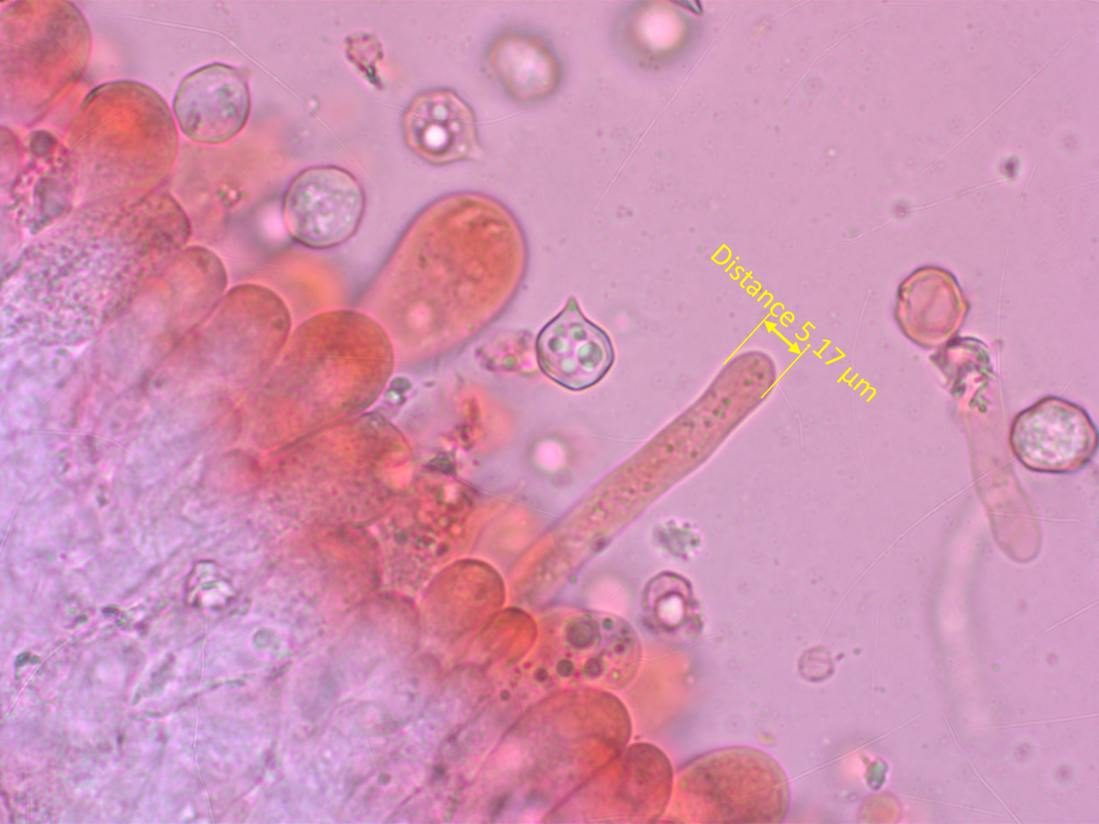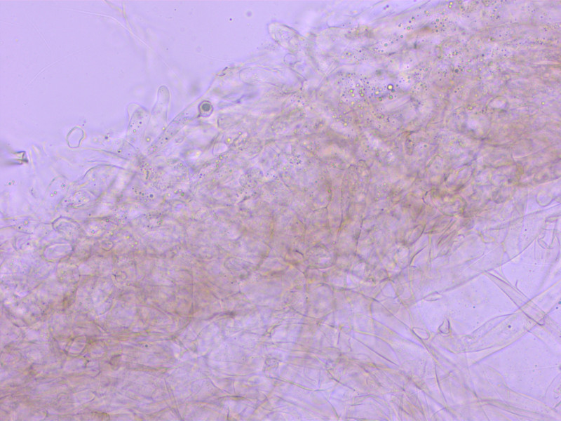 Die Frage nach Zystiden kann ich nicht eindeutig beantworten. Es gab hier und da solche schlanken, aber auffälligen Zellen, die die Basidiolen deutlich überragten.