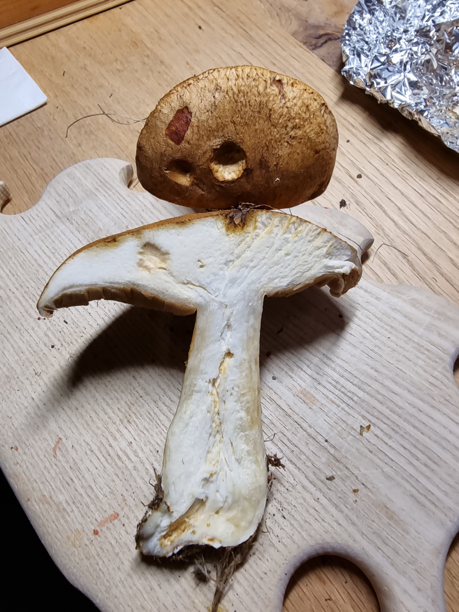Hier die KOH-Reaktion (3%): auf dem Hut, im Hutfleisch und in der Stielbasis.