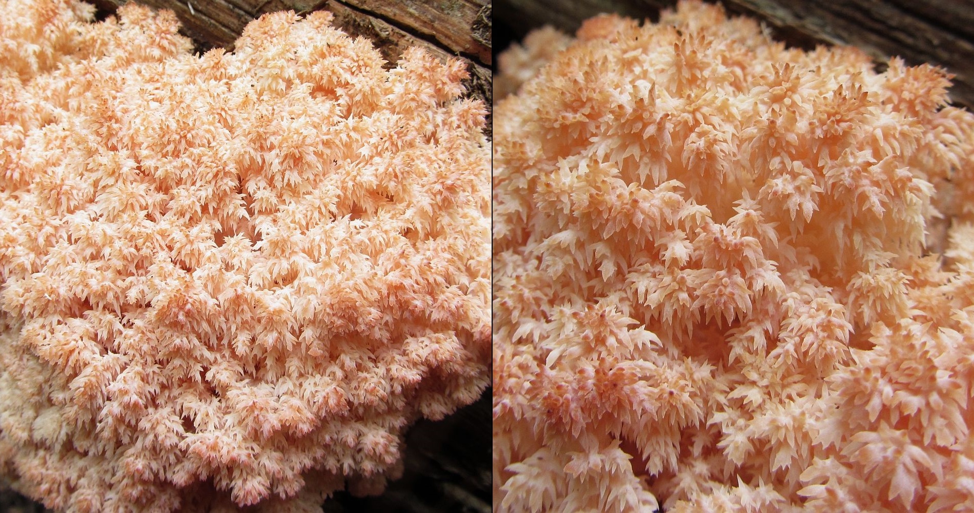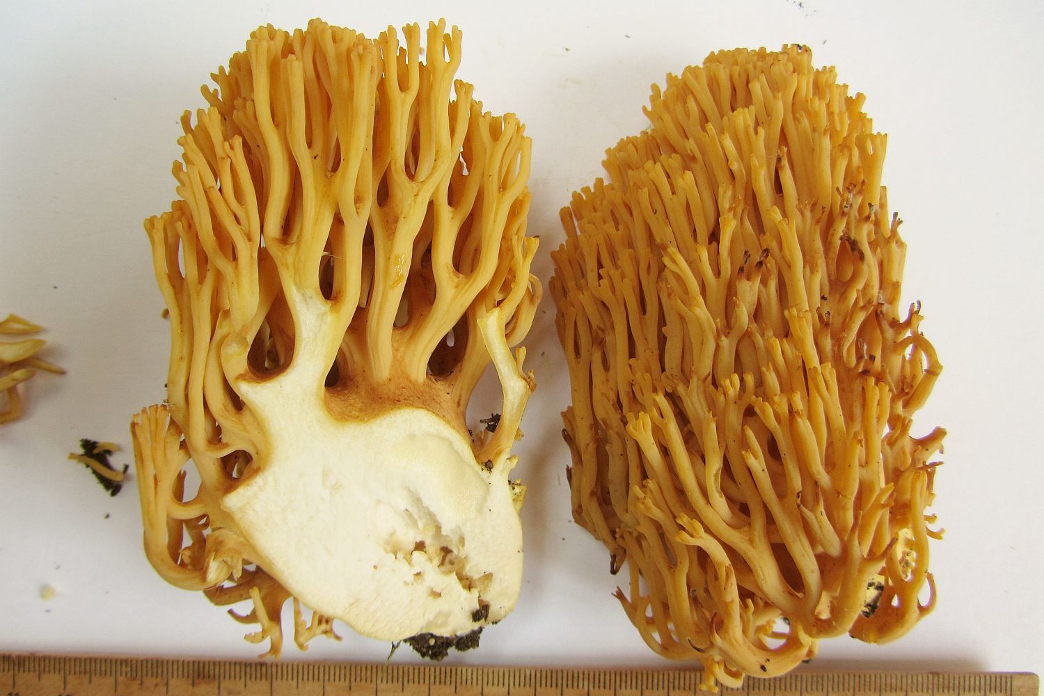 Diese vermutete R. largentii war schon verblüffend (nach einer Nacht im Gemüsefach einfach nur noch gelb, aber die Folgende Koralle war noch viel krasser, wie die ihre ursprünglichen Farben verloren hat. Aus "herrlich bunt" war am nächsten Tag bei dem älteren Fruchtkörper ein "ziemlich matschiges Ockergelb" geworden. Und das liegt nicht (nur) an den Farben der Aufnahmen. ![]()
