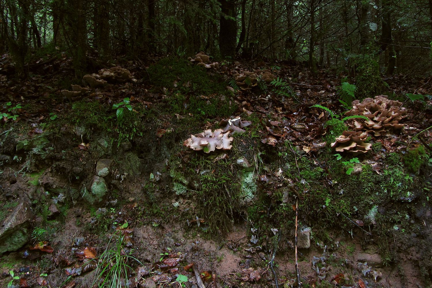 ...zahlreich an einer Wegböschung, da stand ich mittenmang in den Fruchtkörpern, ohne die anfangs gesehen zu haben, weil: Im nächsten Bild wäre dann die Stelle zu sehen.