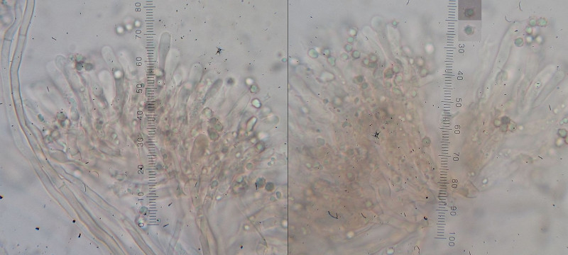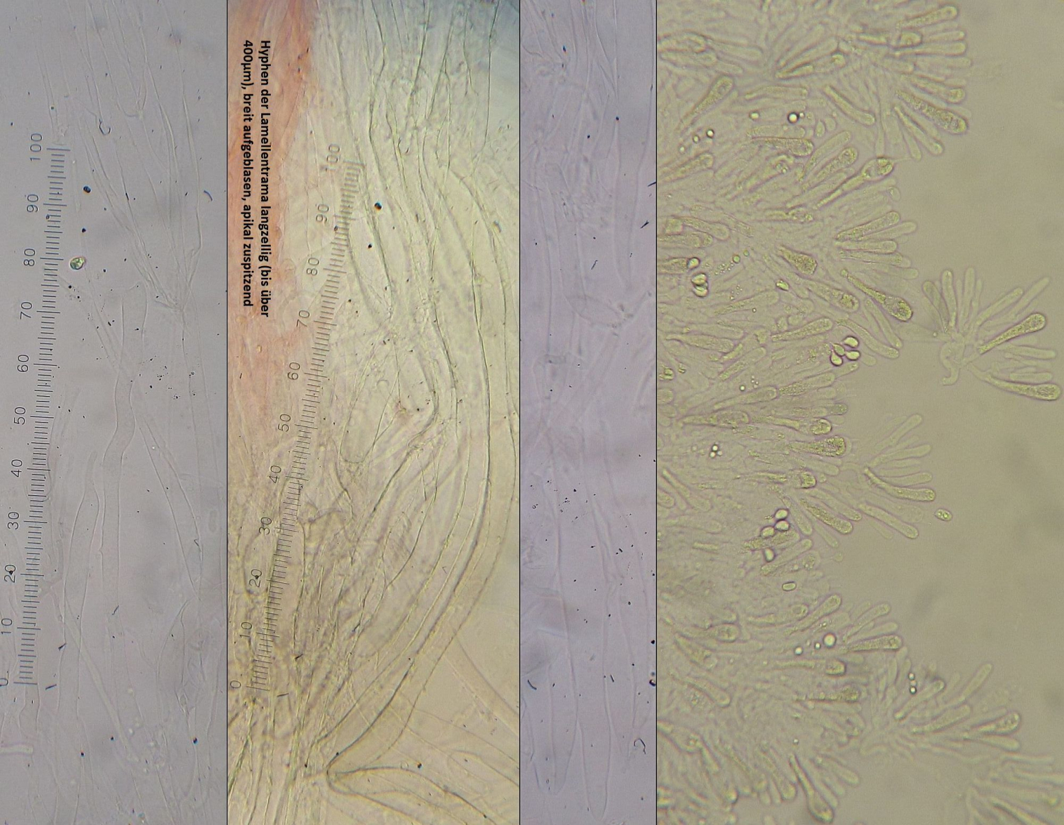 Schön wie Du die langen Hyphen in der Lamellentrama von H. helobia zeigst. Den Knoblauchgeruch habe ich nur einmal erahnen können, als ich eine kleine Dose mit mehreren Fruchtkörpern geöffnet und direkt die Nase drangehalten habe.