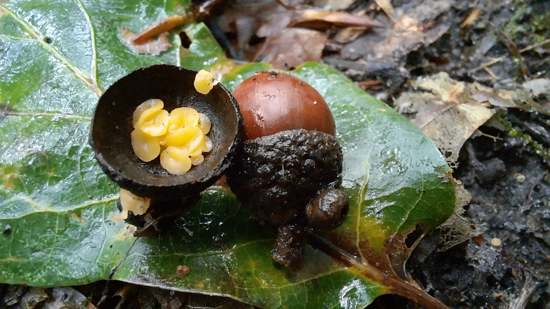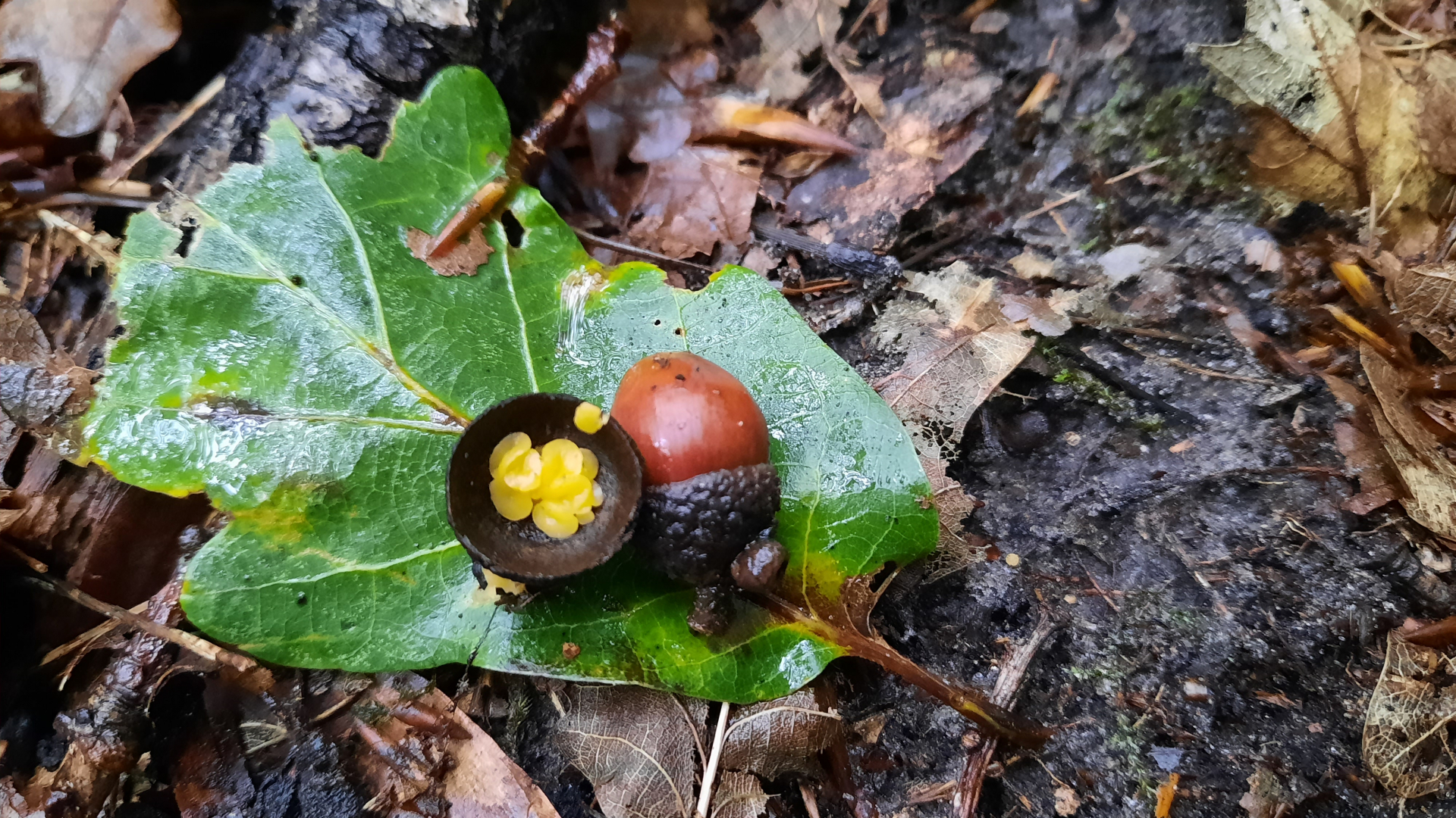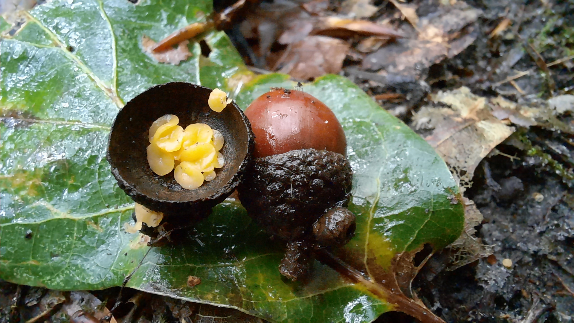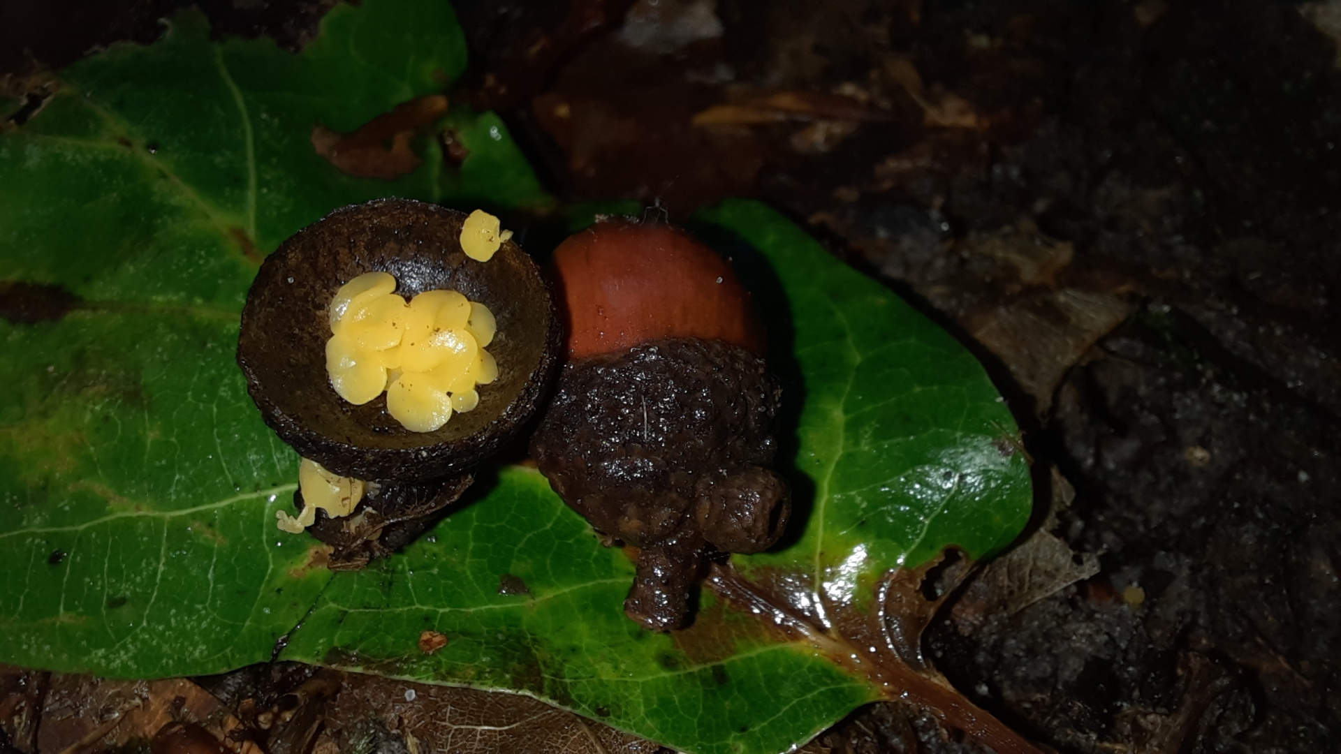 ich habe heute in einer Eichelfruchtschale diese interessanten kleinen gelben Becherchen gefunden.