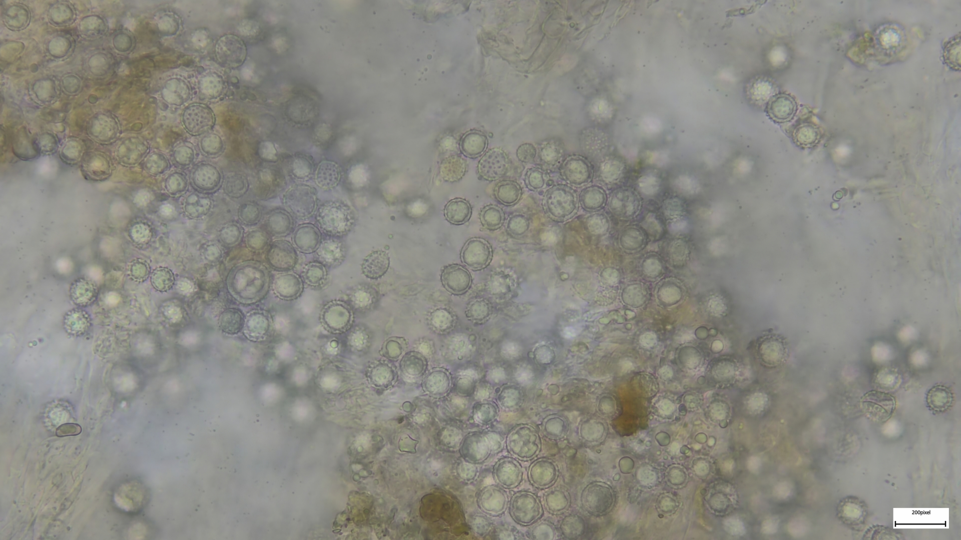 01 Laccaria tortilis mit sehr großen, stark ornamentierten globosen Sporen (heißt ja auch der großsporige, oder auch Zwerglacktrichterling ... beides passt gut). Einzelne Sporen gemessen um die 14µm, sehr variabel, viele wahrscheinlich noch nicht reif.
