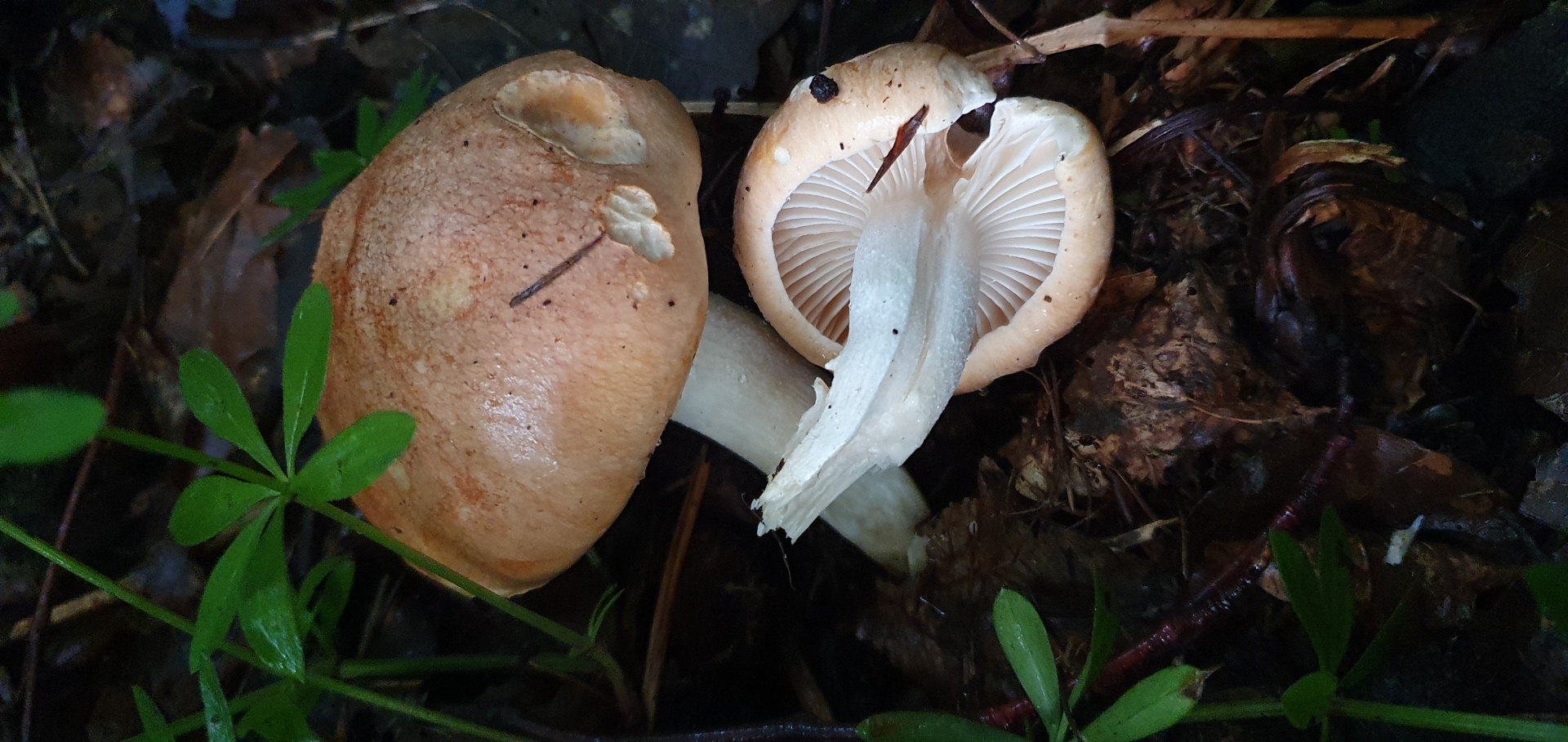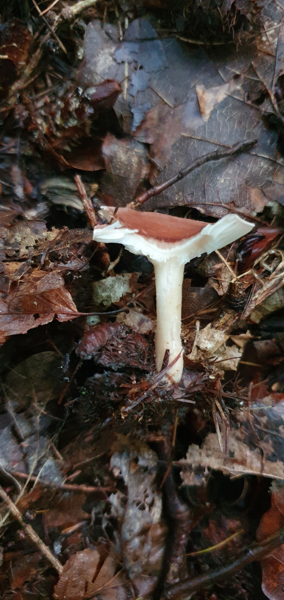 Ausserdem machte mir noch eine 18 Clitocybe spec. zu schaffen, die ich auch nicht benamst bekomme. Weisses Sporenpulver, weiße herablaufende Lamellen, vorkommen unter Buchen auf Bucheckerschale. Hut schon fast ziegelrot (auffällige Farbe), heller, nahezu weißer Rand, Hut eher flach, nicht sonderlich trichterförmig. Hut unter weiß bepudert, samtig wirkend.