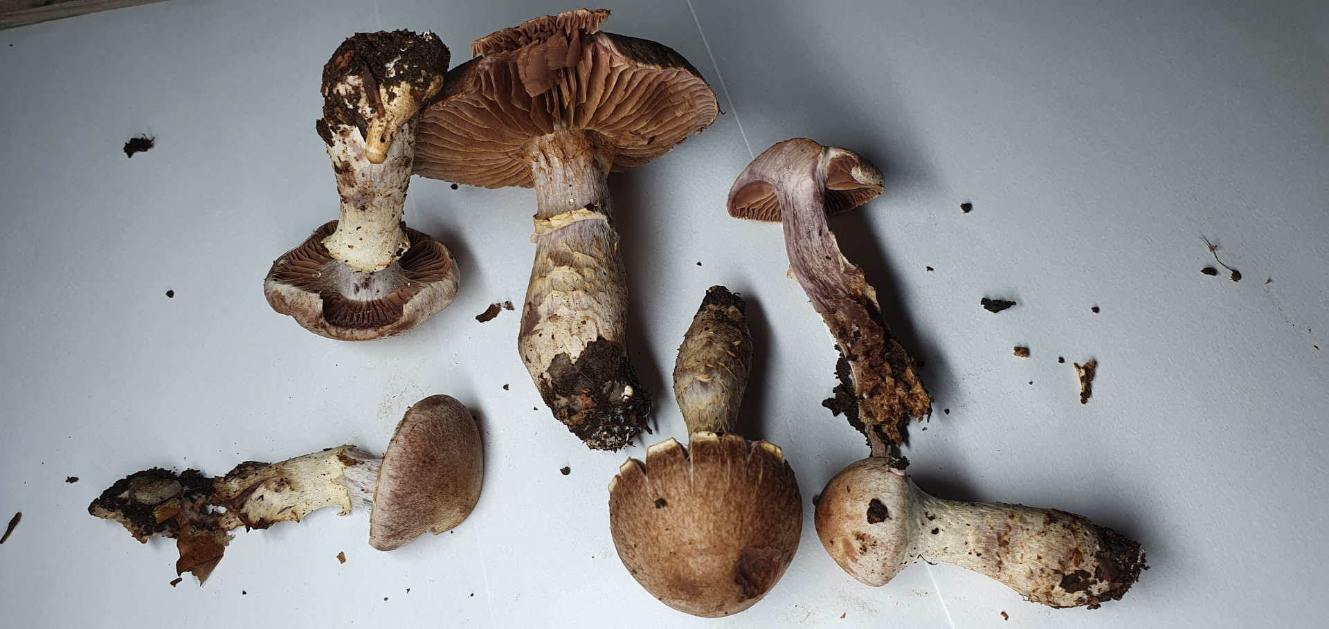 • Hallo Sebastian, deine maculatum ist klar, aber die zweite ist ganz sicher nicht tigrina. War da Hasel oder Hainbuche in der Nähe? Müsste eigentlich, denn das sind vermutlich stark durch das Wetter in Mitleidenschaft gezogene Exemplare von Inocybe haemacta. Die müsste sich an manchen Stellen verfärbt haben (rötlich am Stiel etwa, was ich zu sehen meine auf dem einen Foto und leicht dunkelgrünlich-blaulich auf der Hutmitte) und wenn es trocken gewesen wäre, hätte sie nach Pferdestall gerochen. Abgesehen vom Aussehen passt auch die eine Zystide, die ich gut sehen kann mit den welligen Wänden gut. Sporegröße ist auch okay.