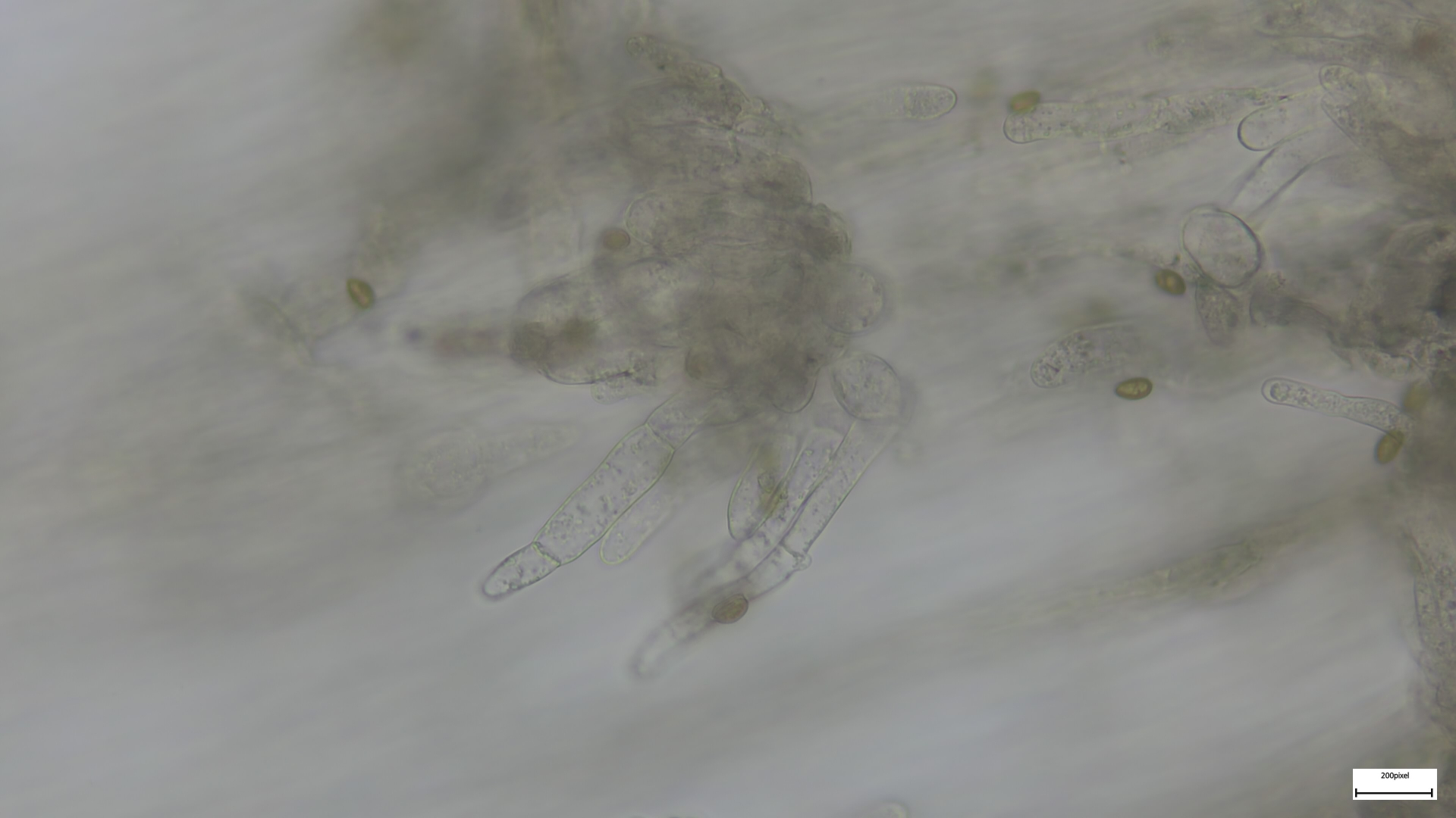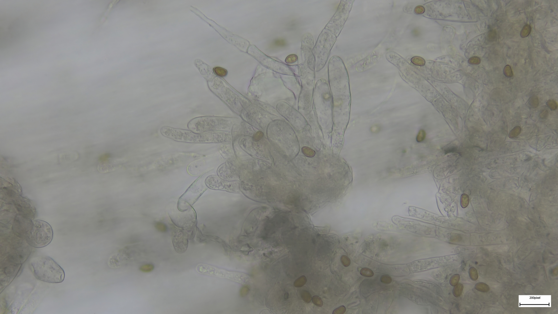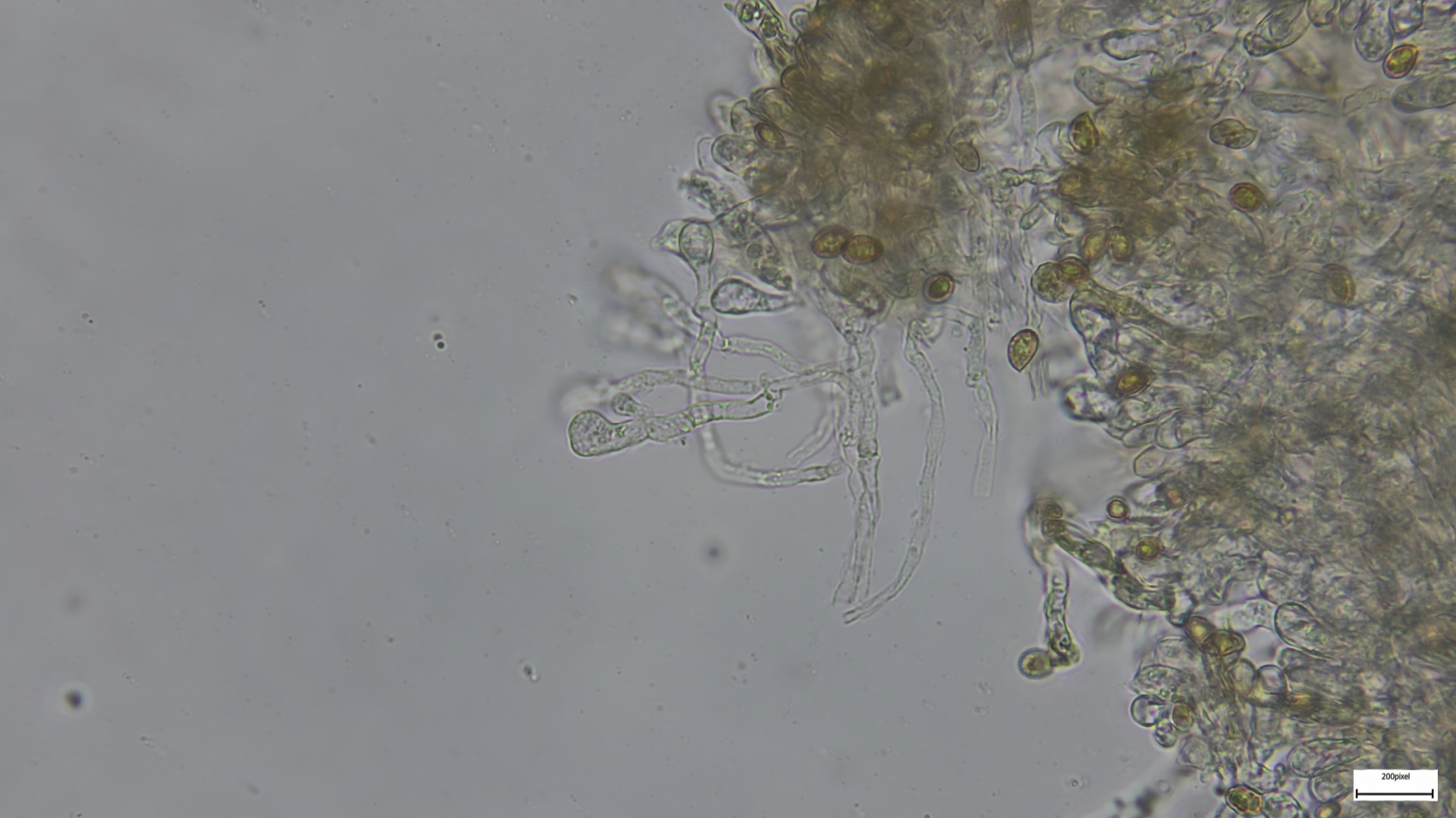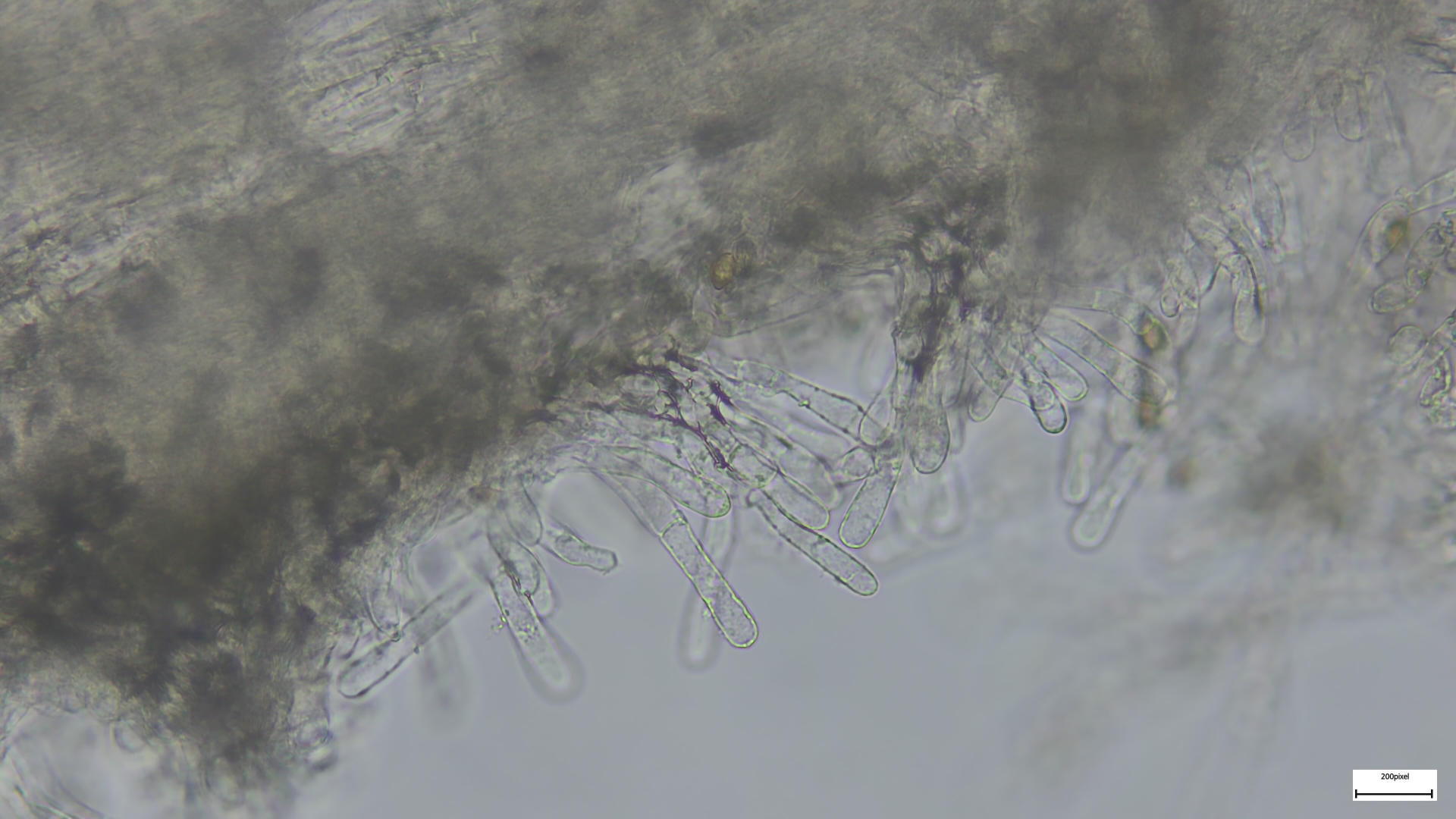 Kaulozystiden büschelig, keulig, teils septiert und dann Endzellen auch spitz auslaufend (so nur im oberen Drittel):