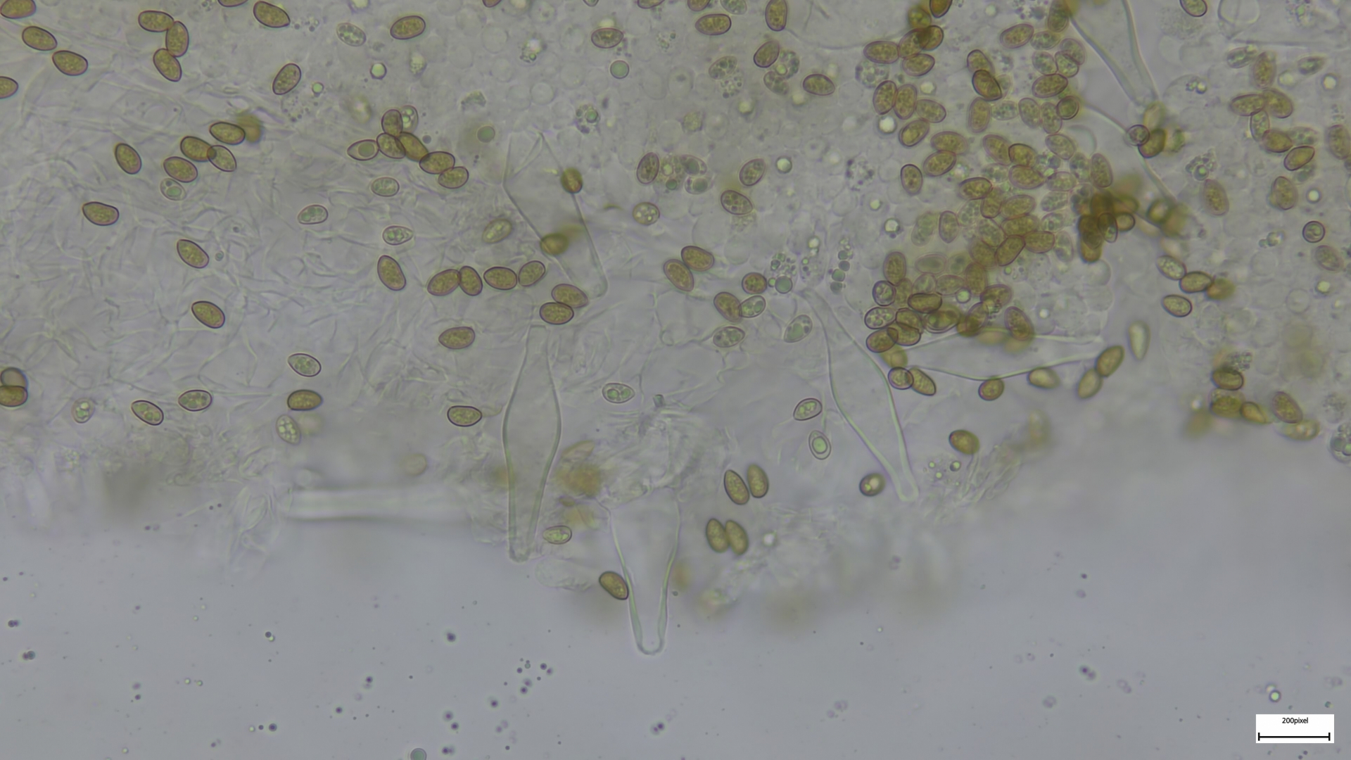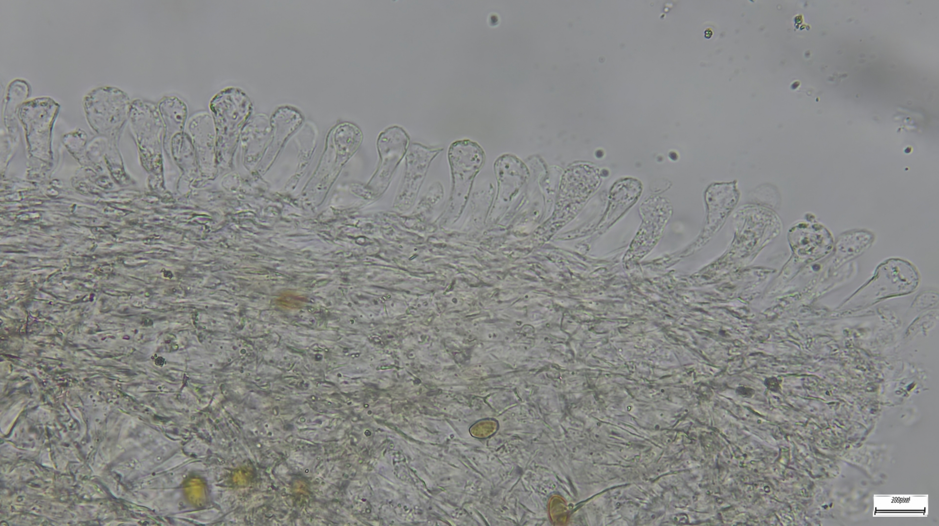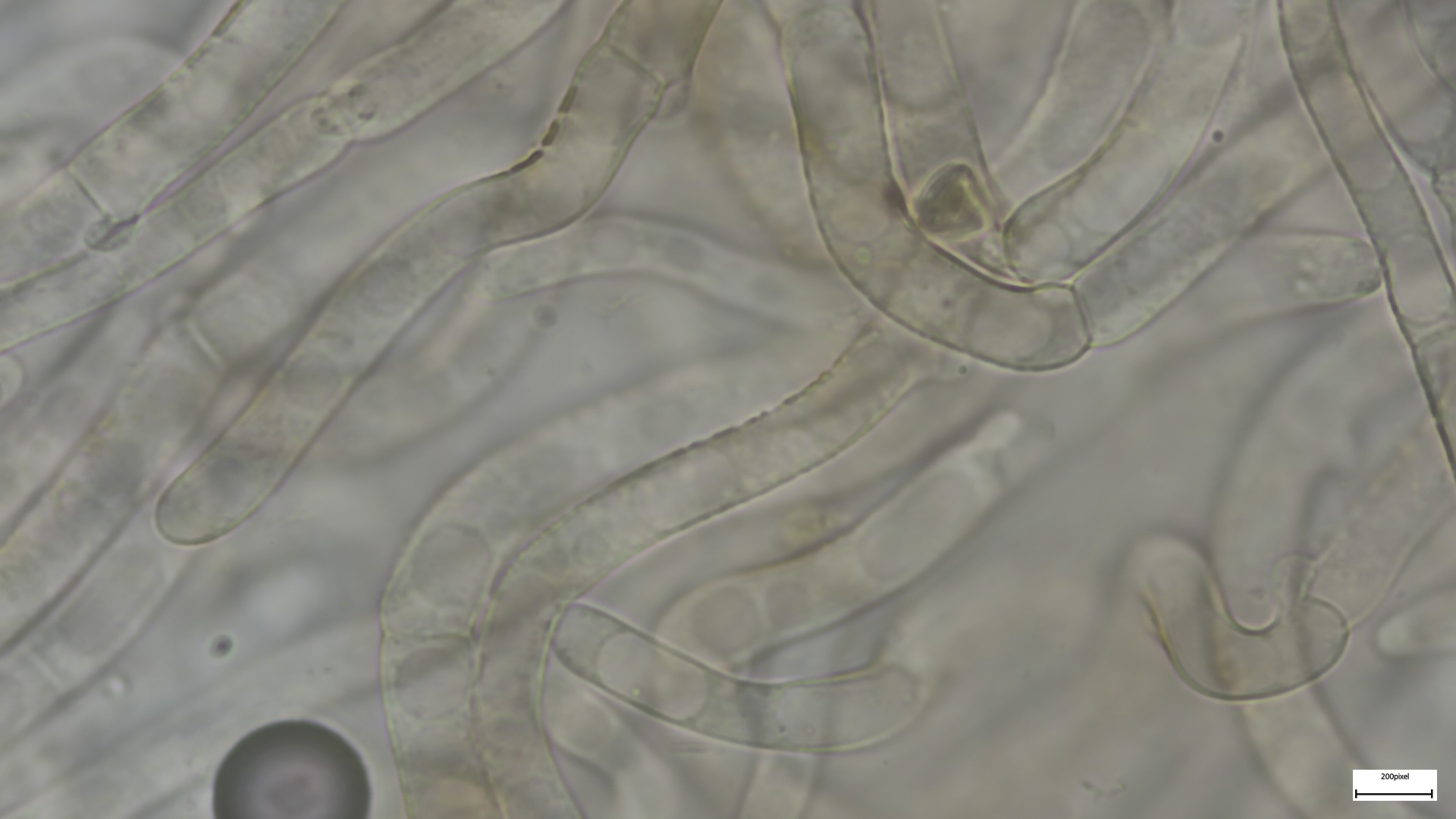 Kaulozystiden büschelig, keulig, teils septiert und dann Endzellen auch spitz auslaufend (so nur im oberen Drittel):