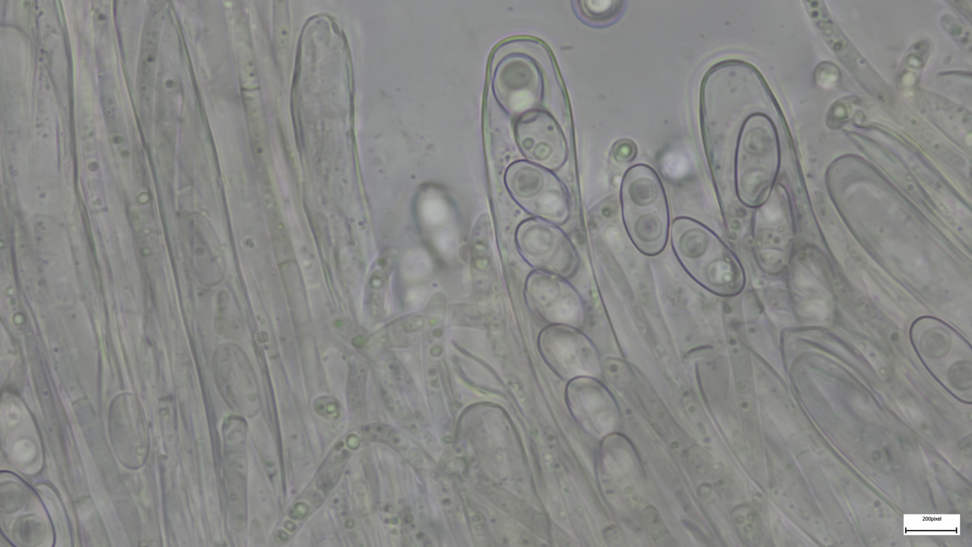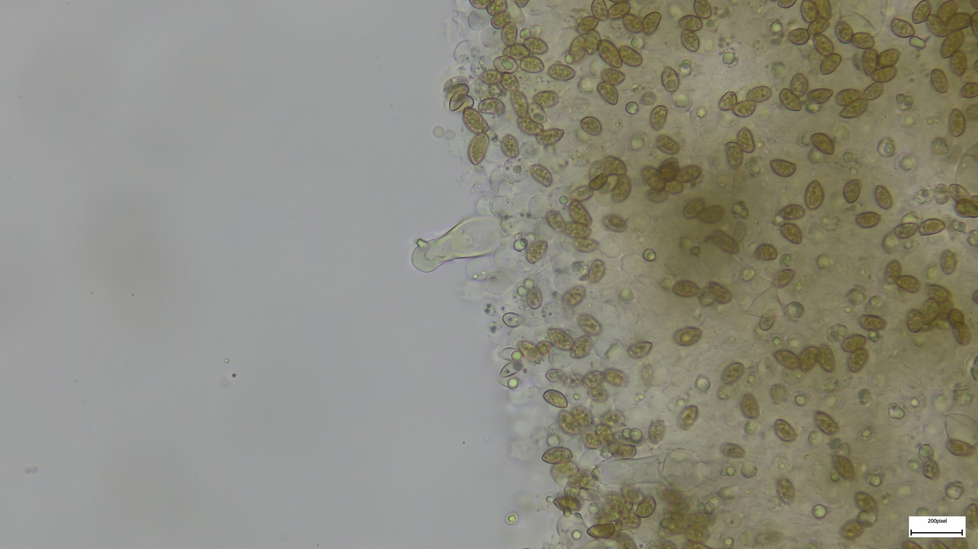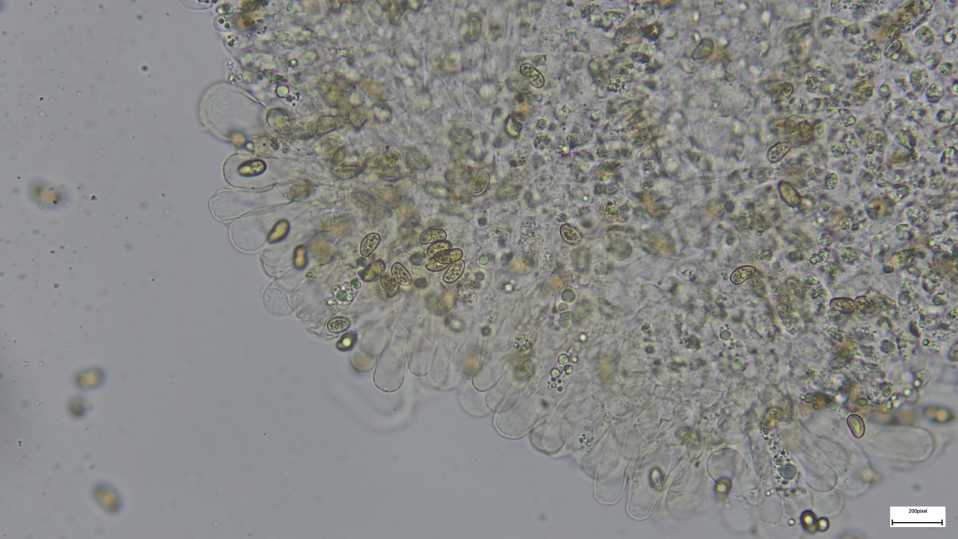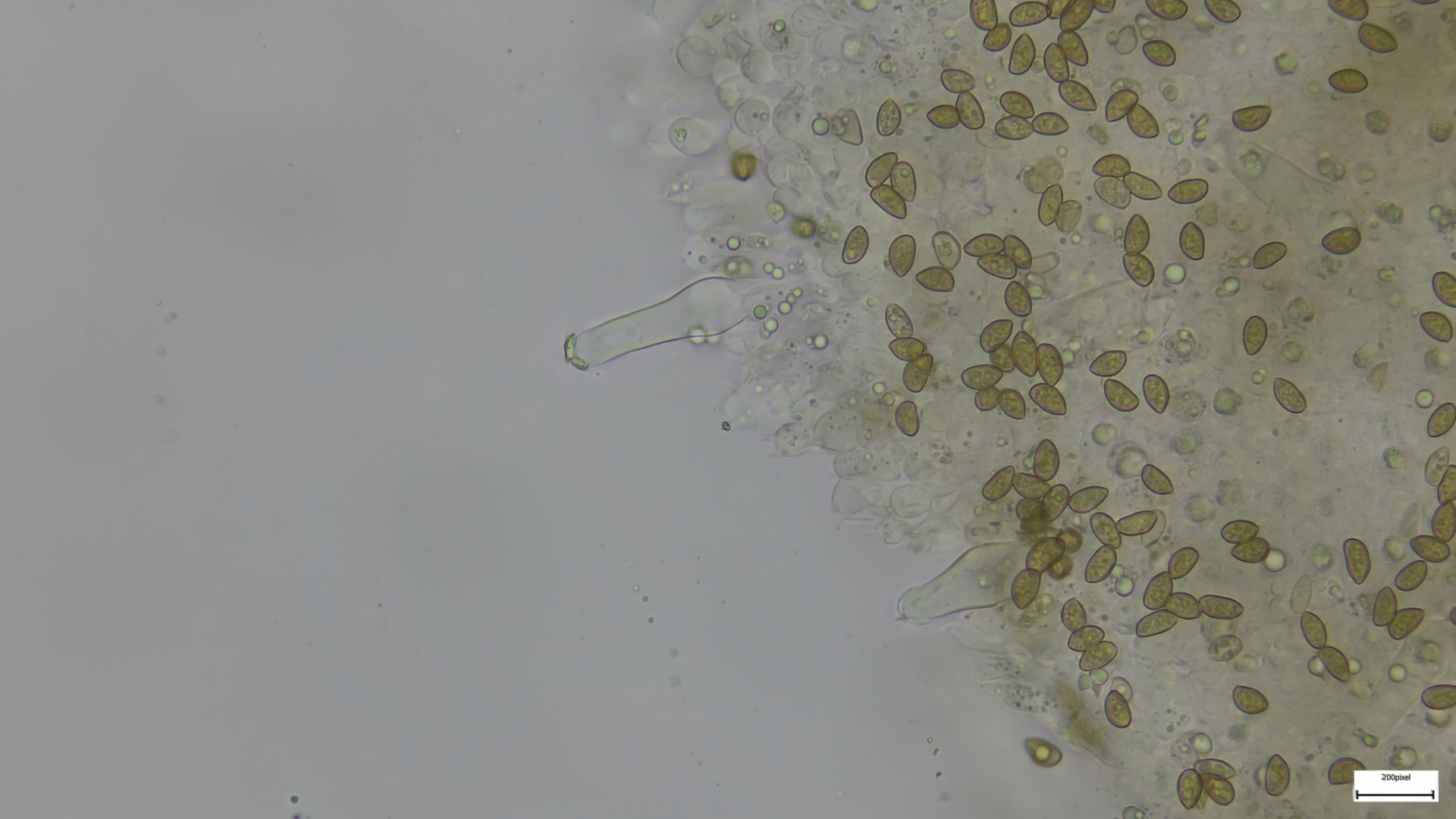 Kaulozystiden büschelig, keulig, teils septiert und dann Endzellen auch spitz auslaufend (so nur im oberen Drittel):