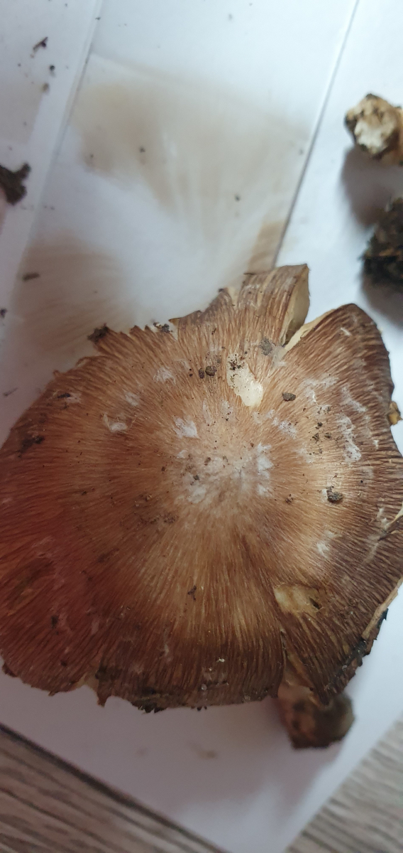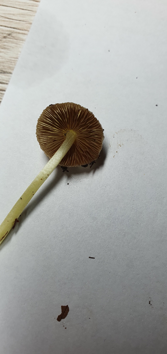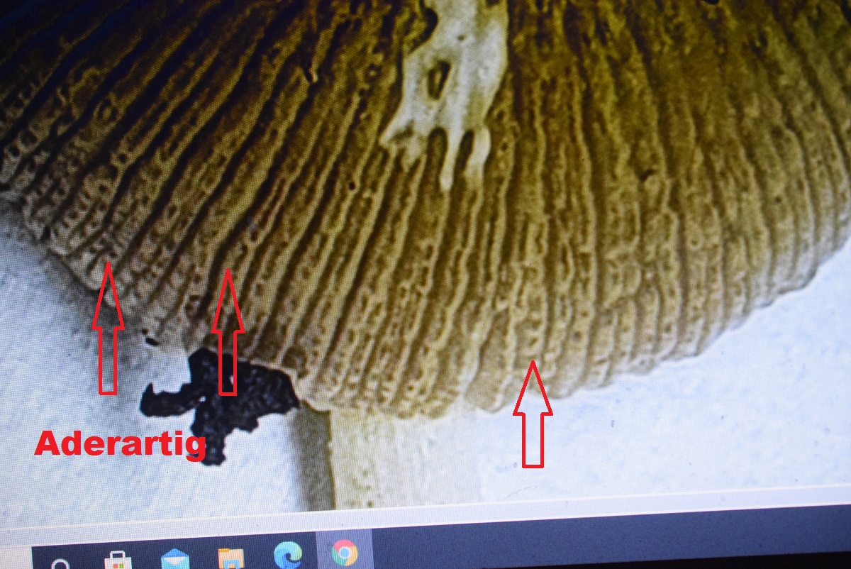 Lamellen gerade angewachsen, bräunlich (Originalfarbe? - Braunsporer):