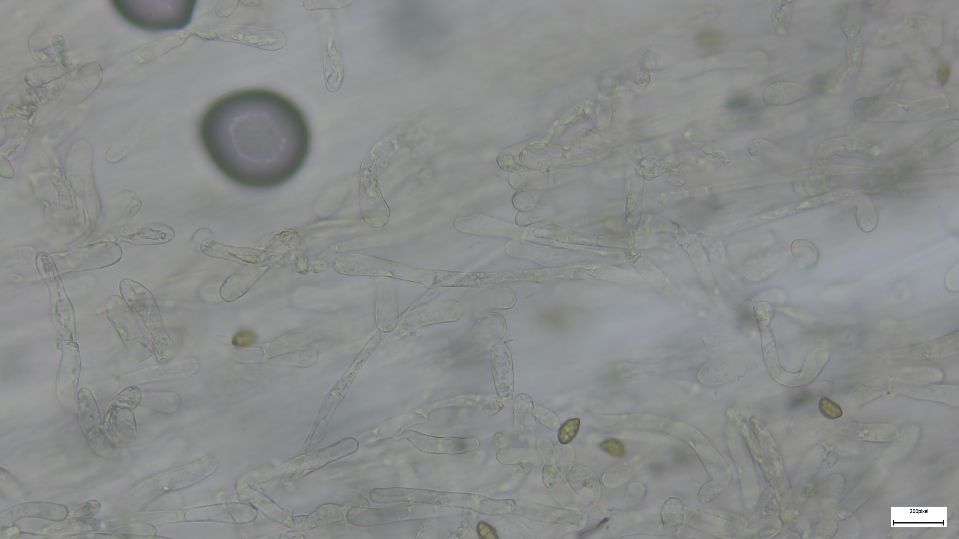 HDS mit schlauchförmigen, teils inkrustierten 7-8µm dicken (selten schlankeren) Hyphen (ohne auffällige Zebrierung):