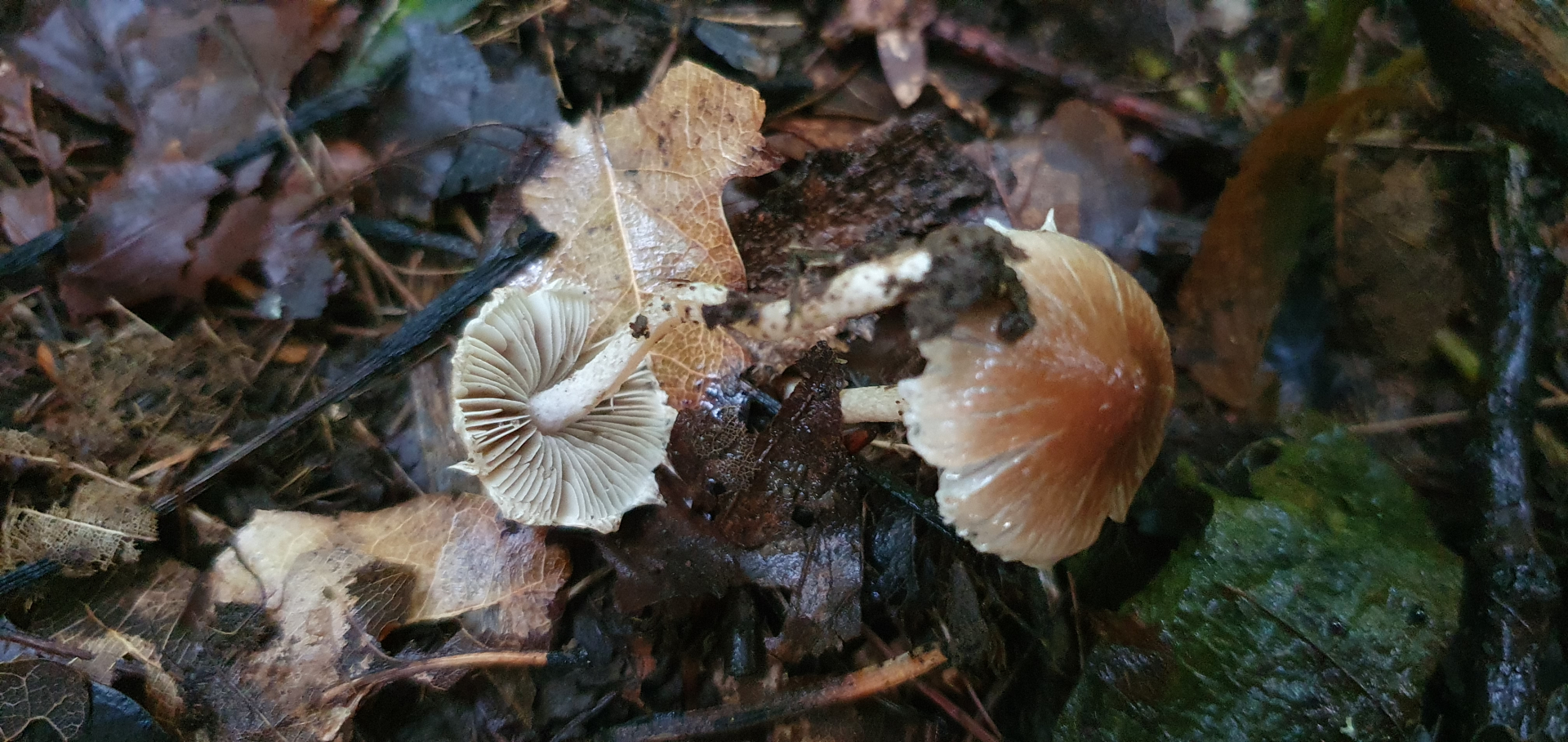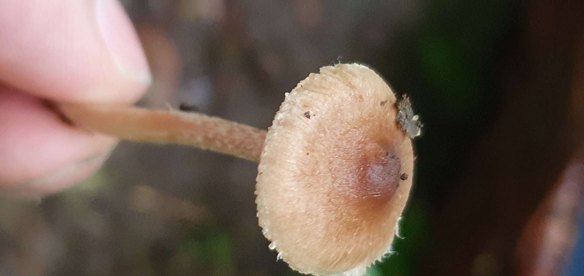 Ebenfalls sehr kleine Fruchtkörper, Hut ebenfalls 1,5cm, deutlich radialrissig (/rimos), Sehr zarte, schlanke, weiße Stiele: