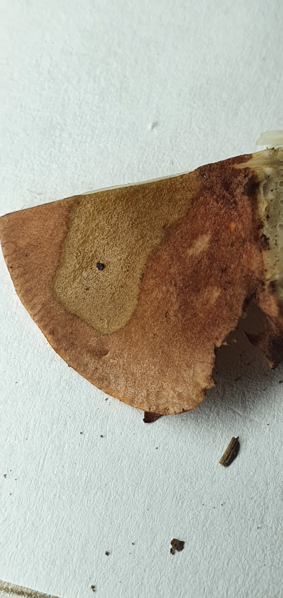 KOH negativ im Fleisch (schließt bresadolae aus) und eher gelblich auf Hut: