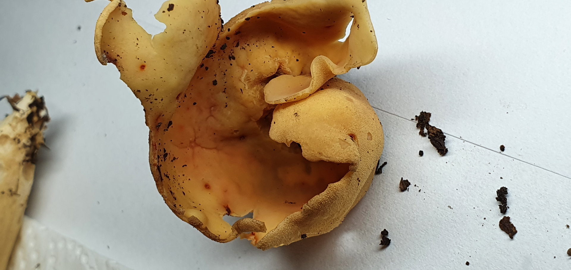 Ansonsten noch ein leichter Bestimmling: 19 Eselsohr (Otidea onotica), an einer Stelle mit großer Fruchtkörperzahl am Platz in mehreren Bücheln wachsend, typische Form, ockergelbe Farben, innen mit roten Flecken, außen kleiig. Sporen 12,2 x 6,5µm