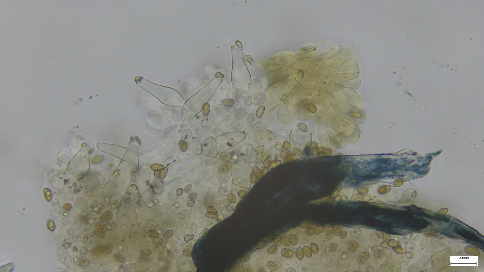 Kaulozystiden büschelig, keulig, teils septiert und dann Endzellen auch spitz auslaufend (so nur im oberen Drittel):