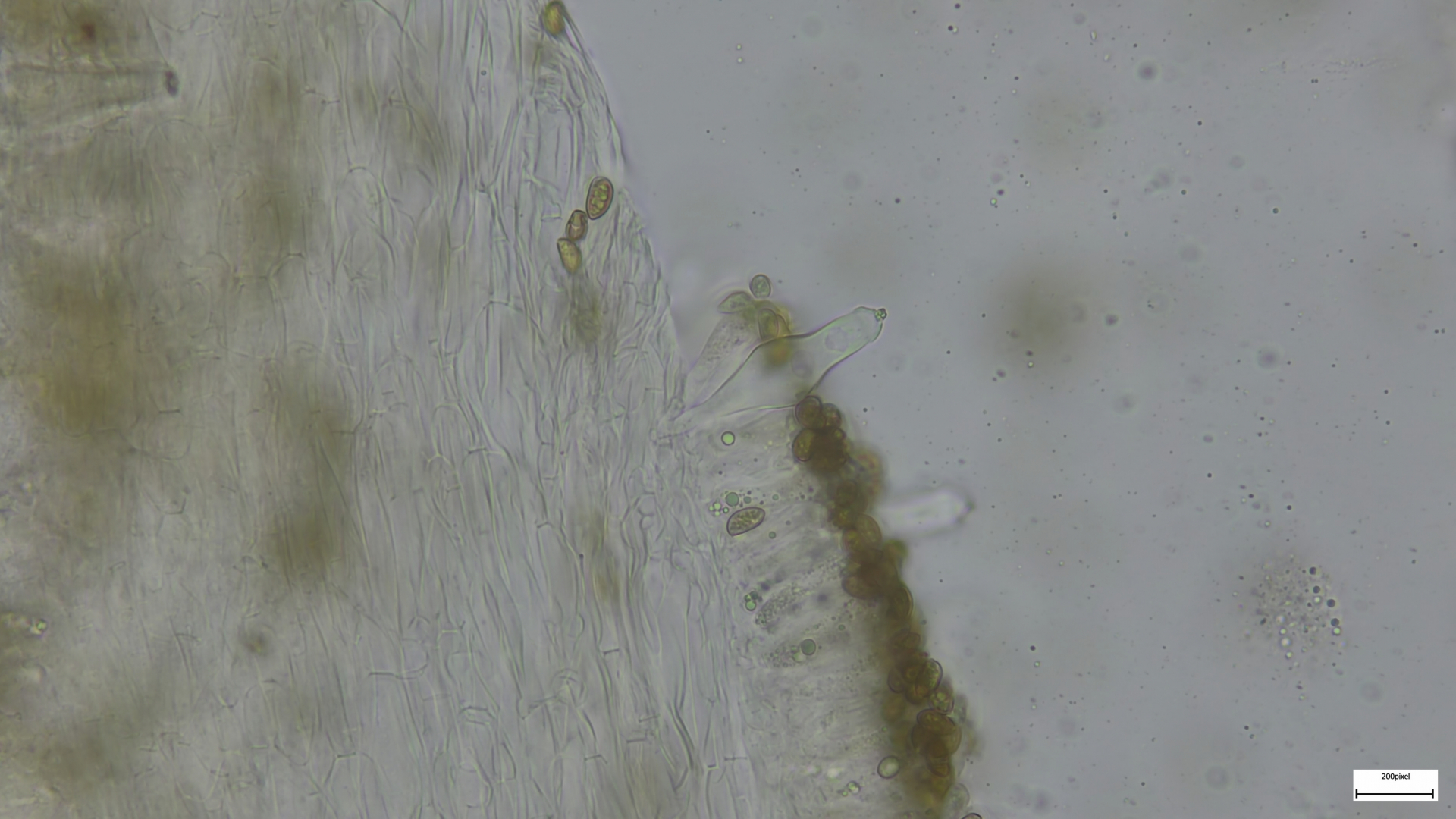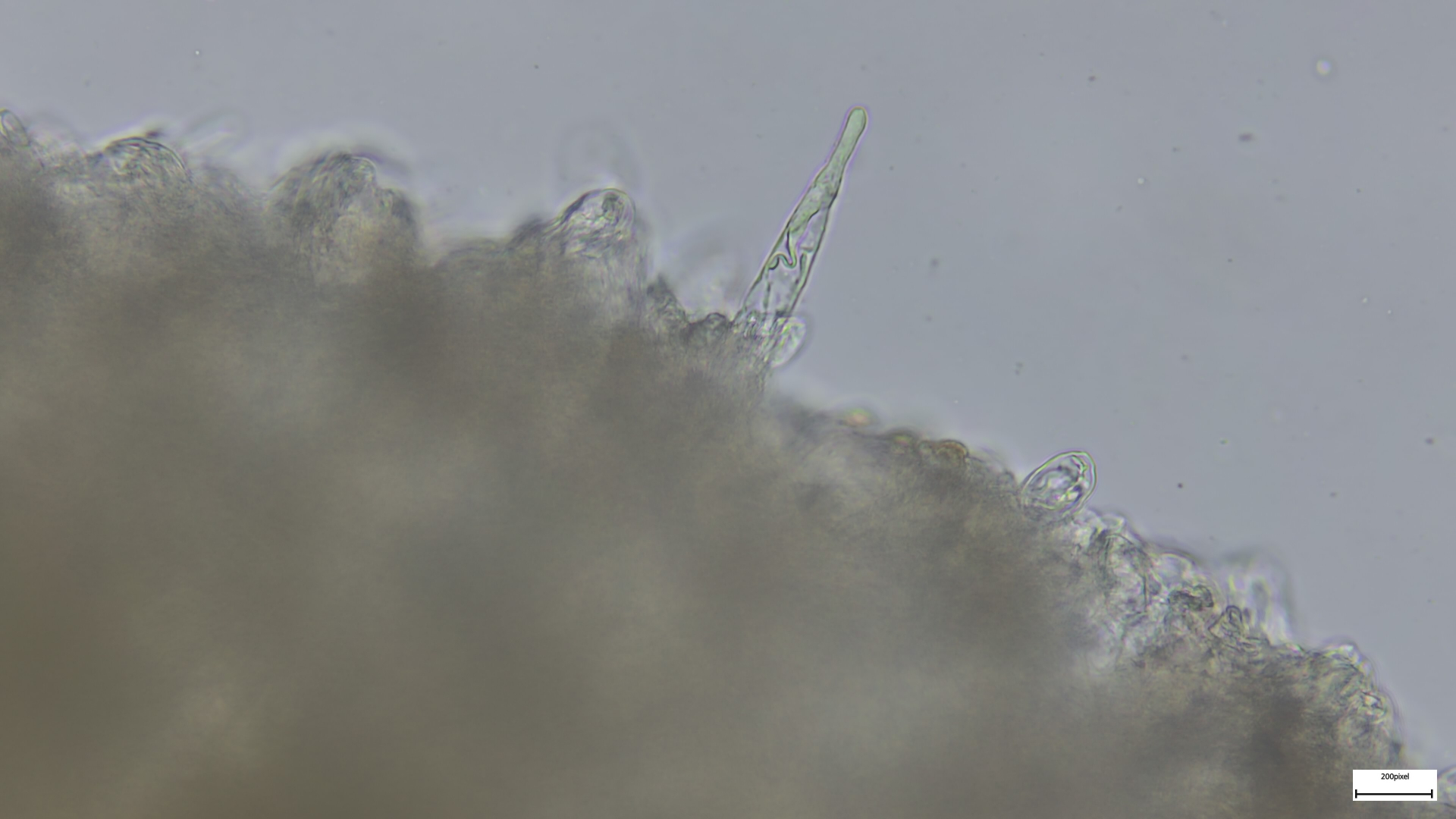 Kaulozystiden büschelig, keulig, teils septiert und dann Endzellen auch spitz auslaufend (so nur im oberen Drittel):