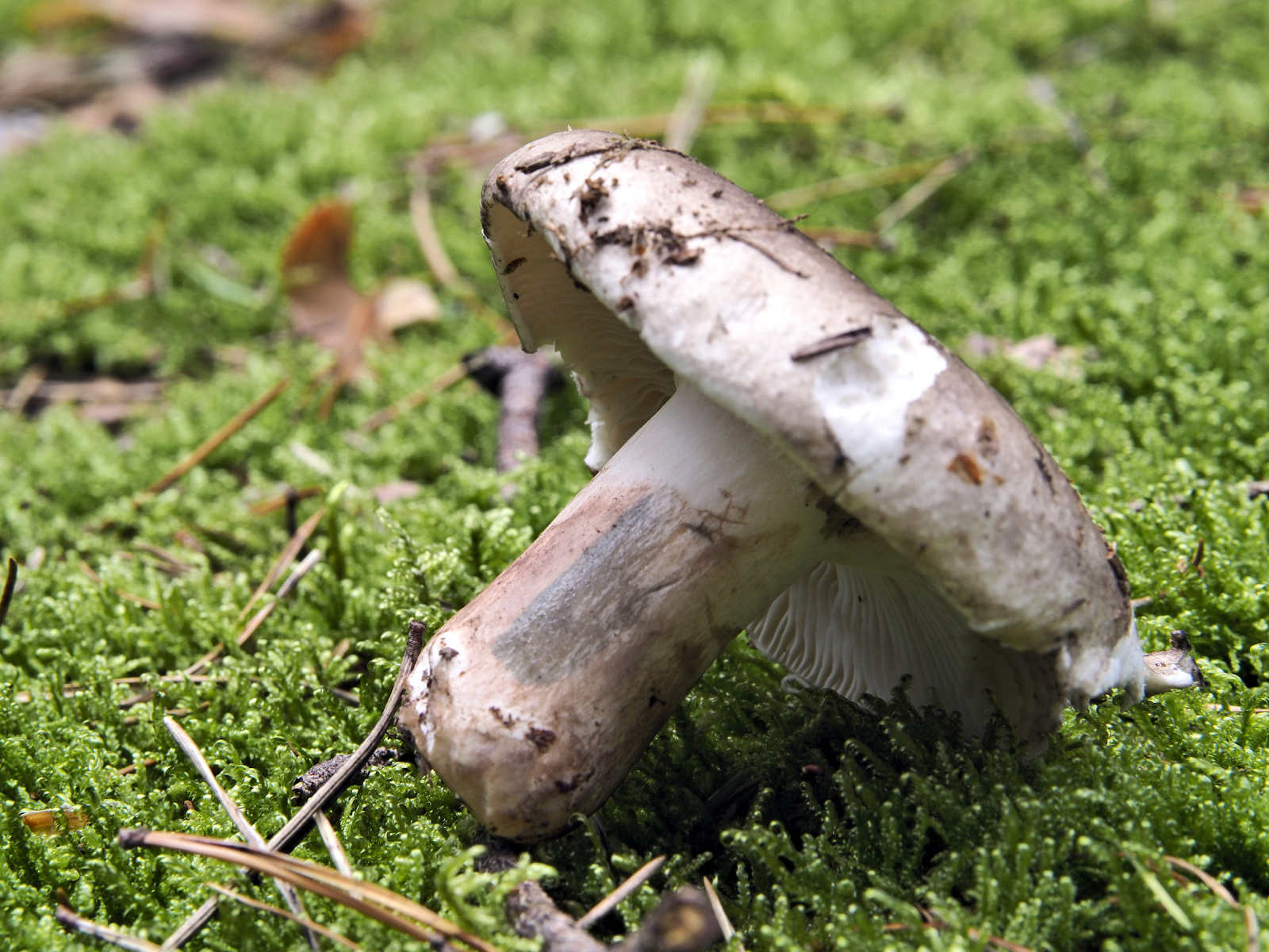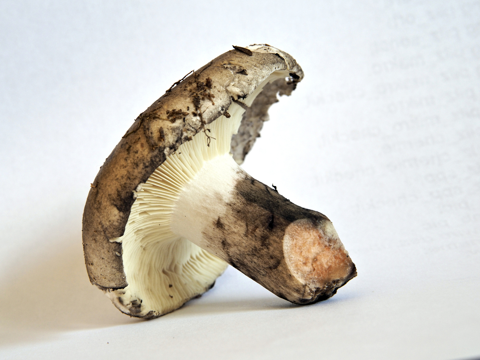 4) Hut trocken, matt, Mitte dunkler braun, Huthaut-Peeling 1/3, darunter weisslich