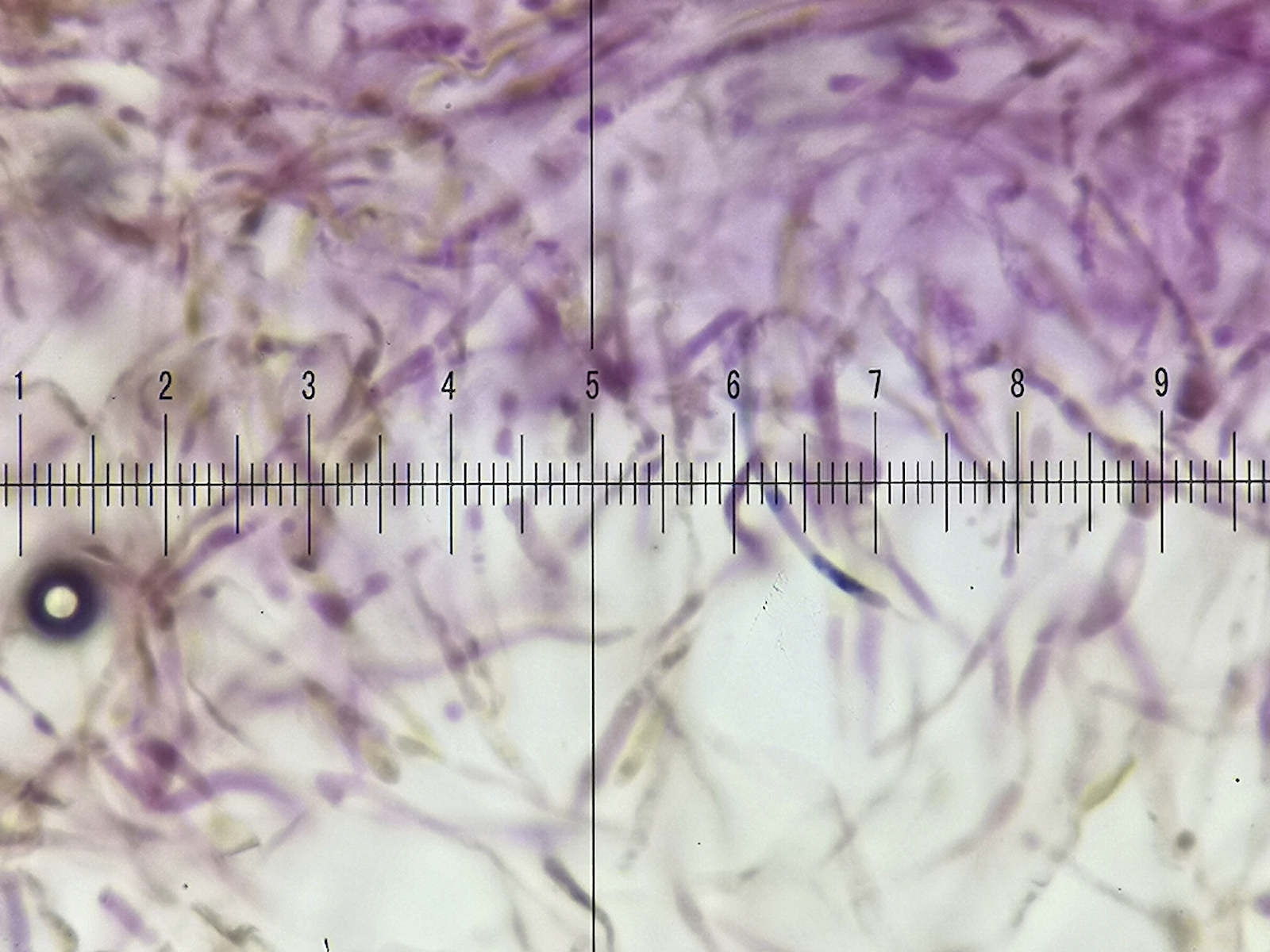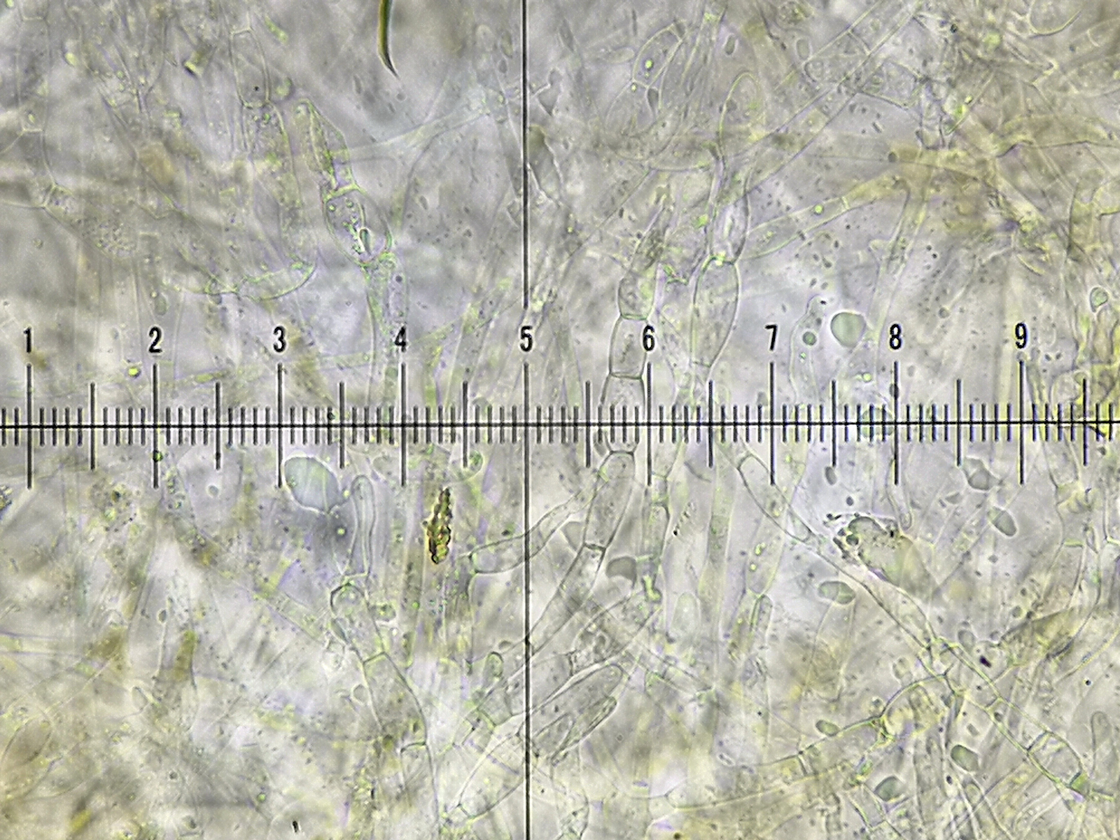 13) in H2O sind kurzgliedrige und aufgeblasene Hyphen schon erkennbar (1 Teilstrich = 2,5µm)