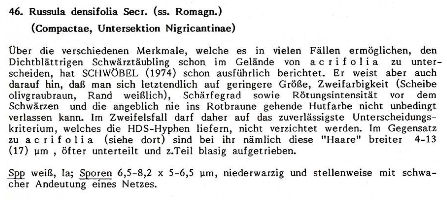 - R. densifolia (Dichtblättriger Schwarztäubling) – passte nach Literatur, Größe, Geschmack, HDS Aufbau