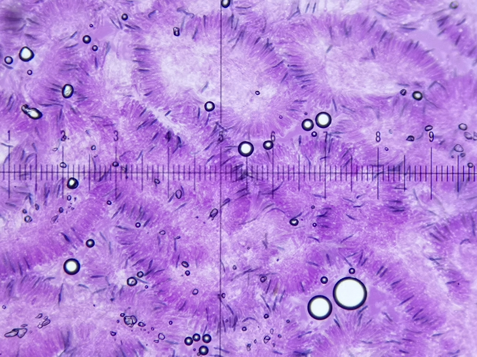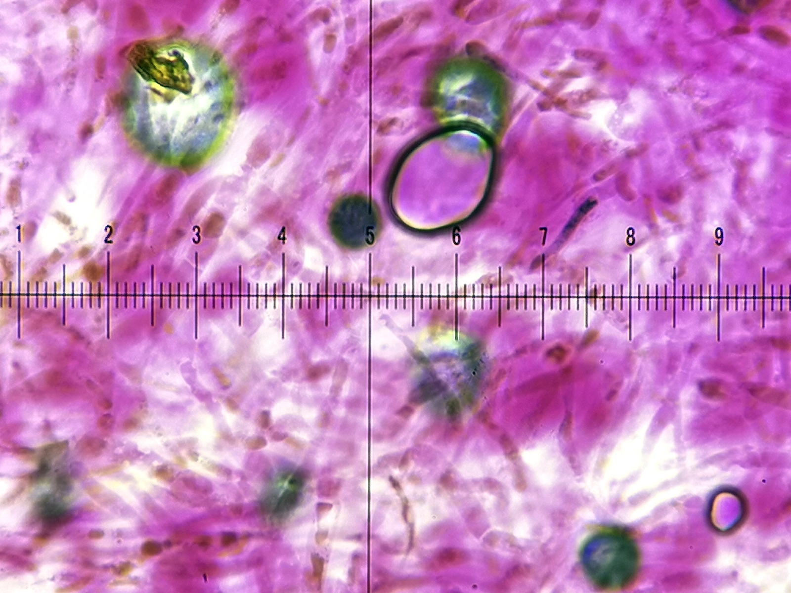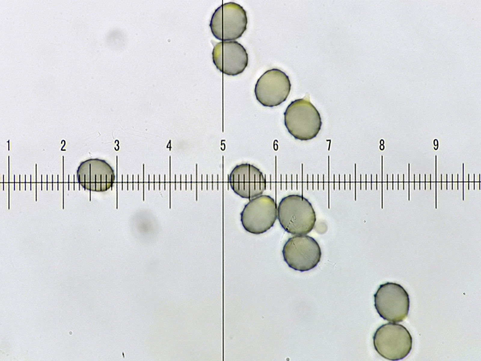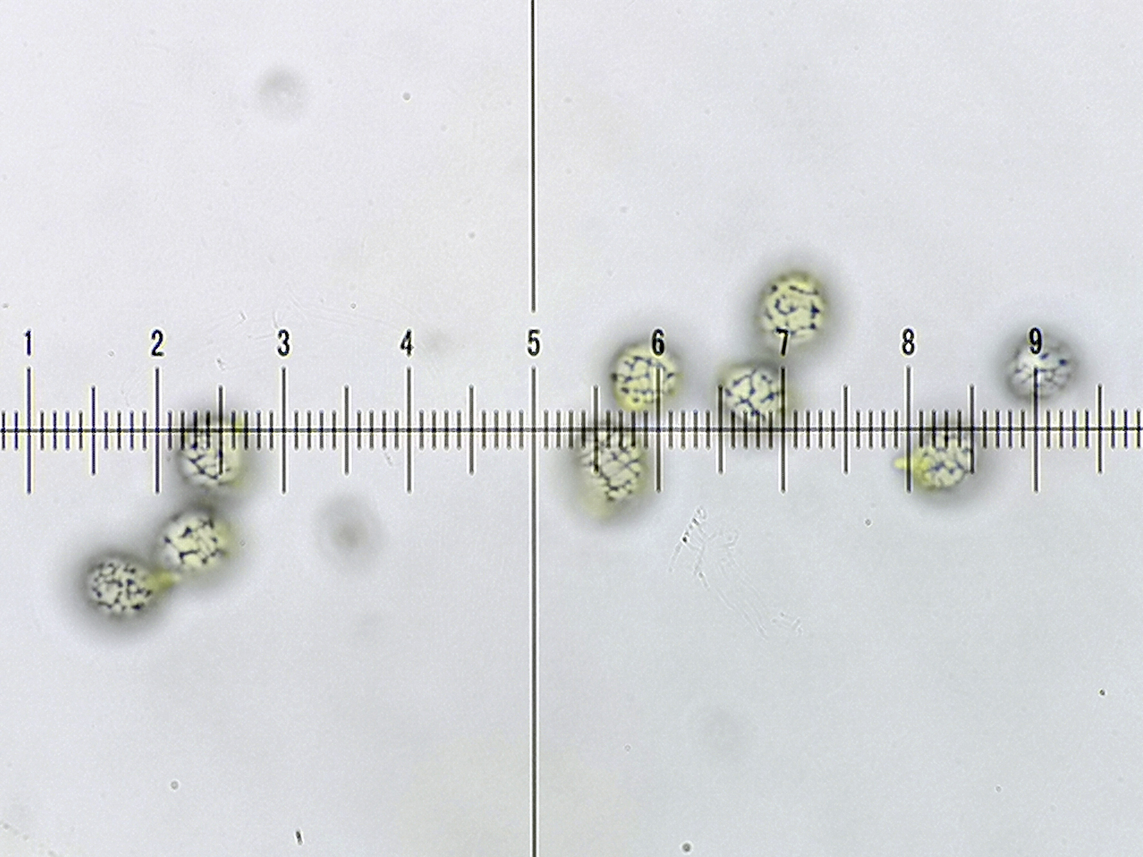 17) Melzer, Sporenform rundlich-oval mit sehr niedrigen Warzen (1 Teilstrich = 1µm)