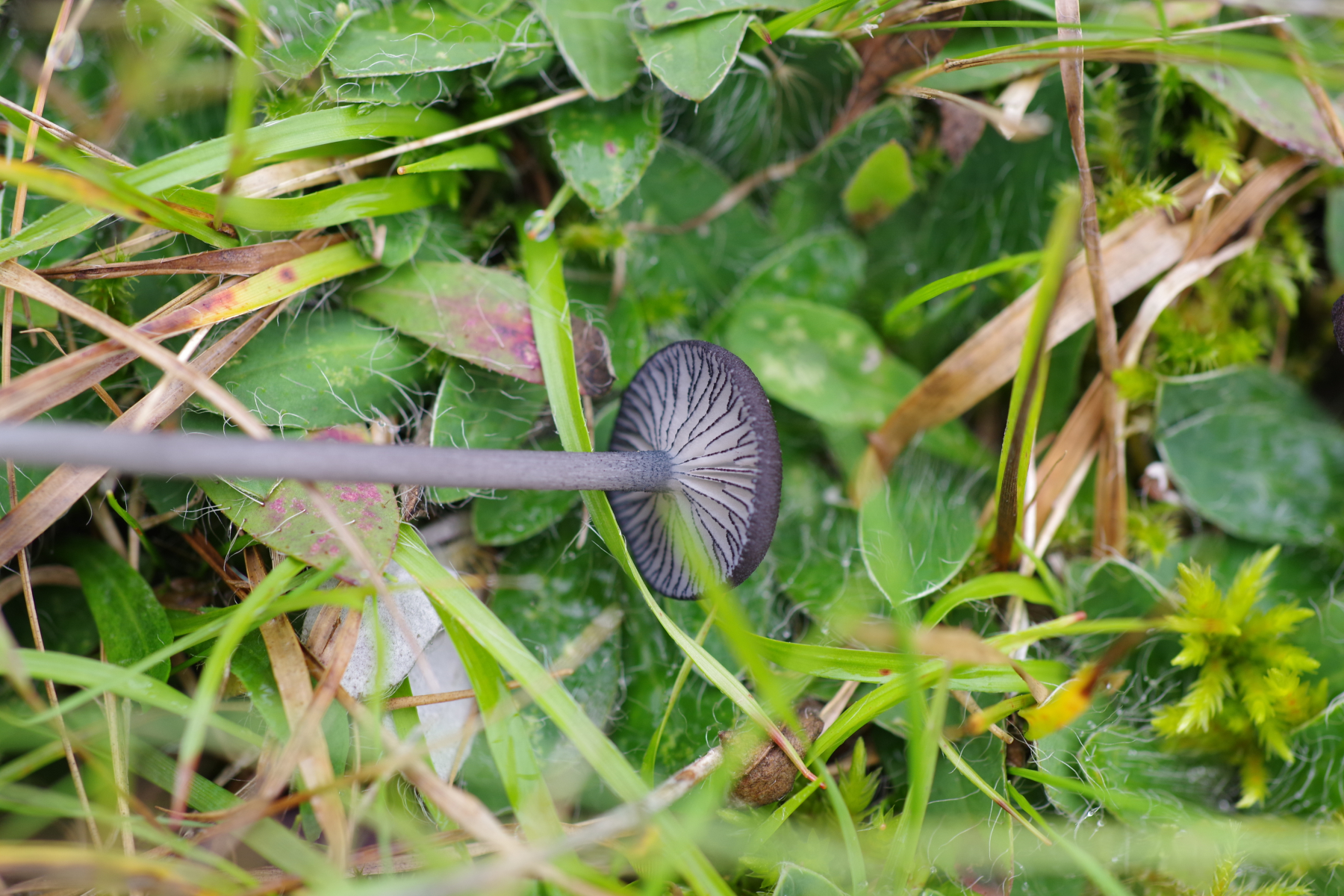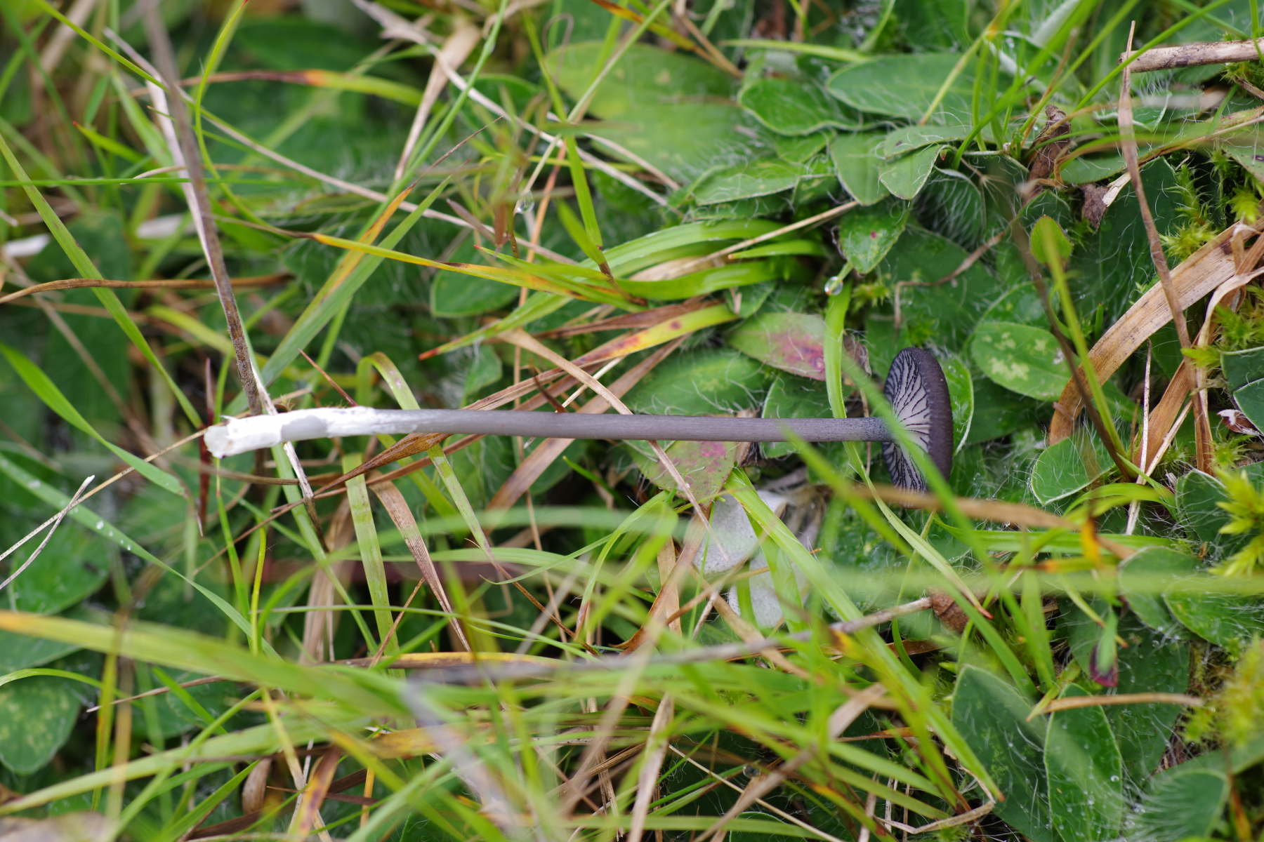 12) eine auffälig langstielige Entoloma mit blauen Lamellenkanten