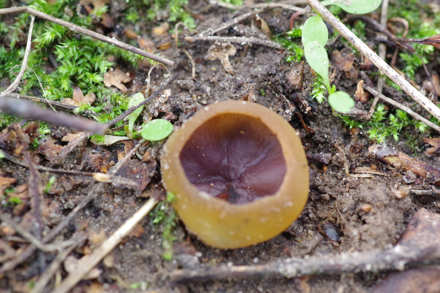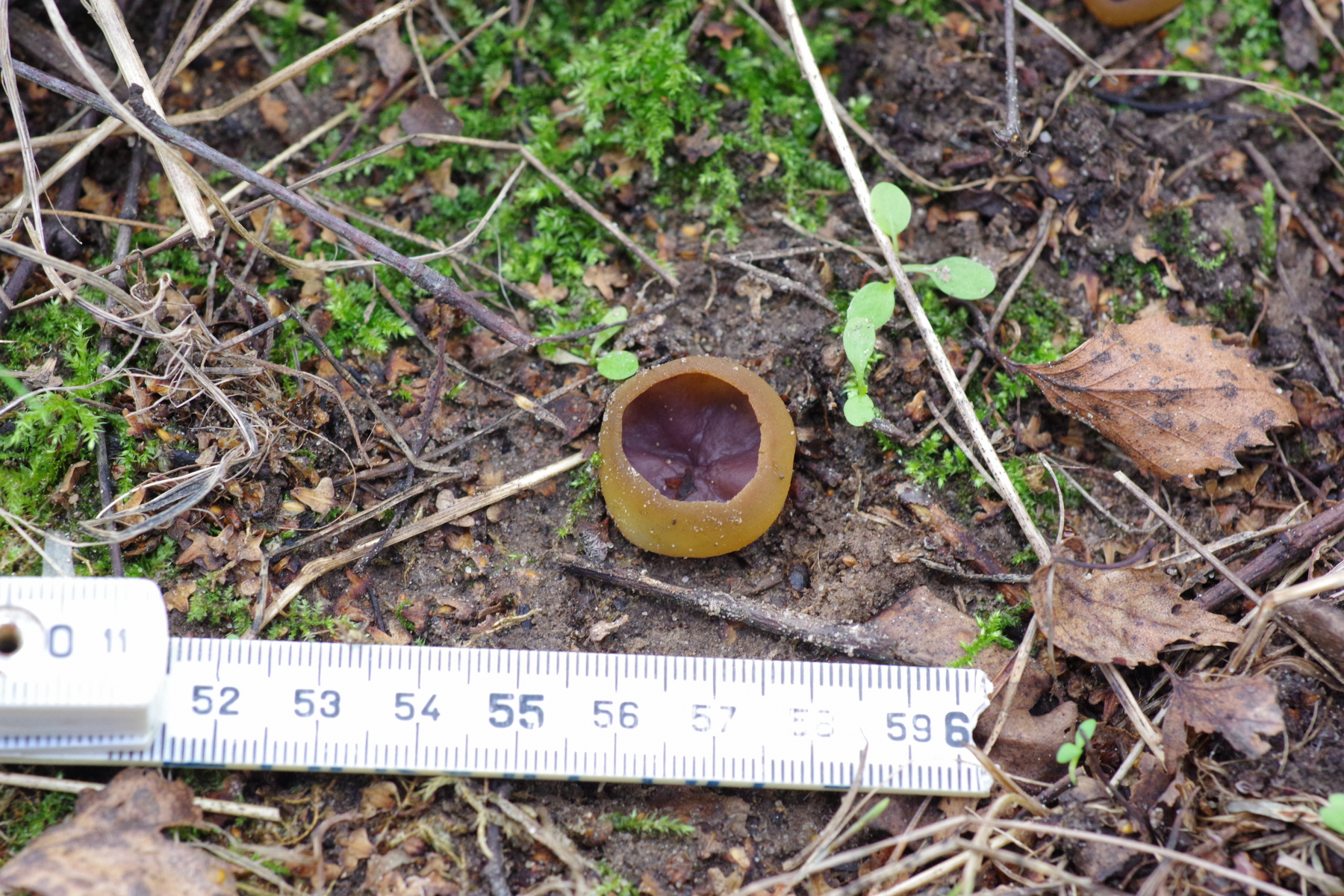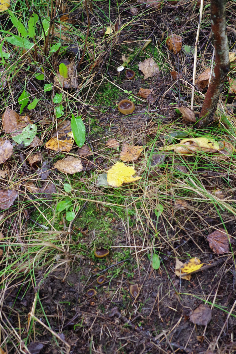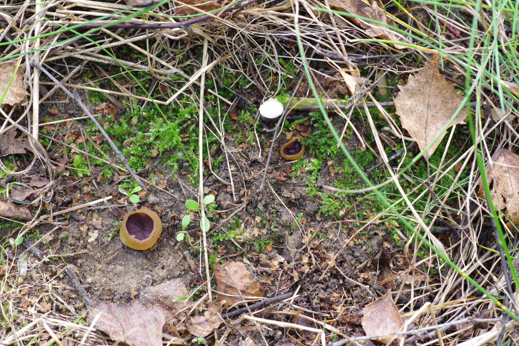 1) innen mit einem Violettschimmer auf Rohboden, aber keine Brandstelle. Unter jungen Birken und Kiefern. Vielleicht Peziza praetervisa?