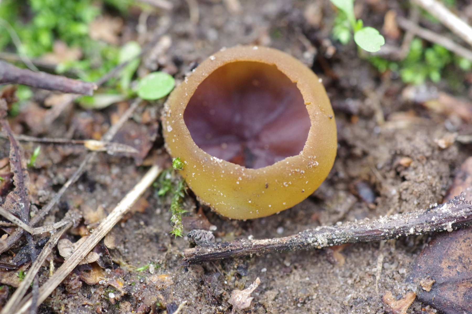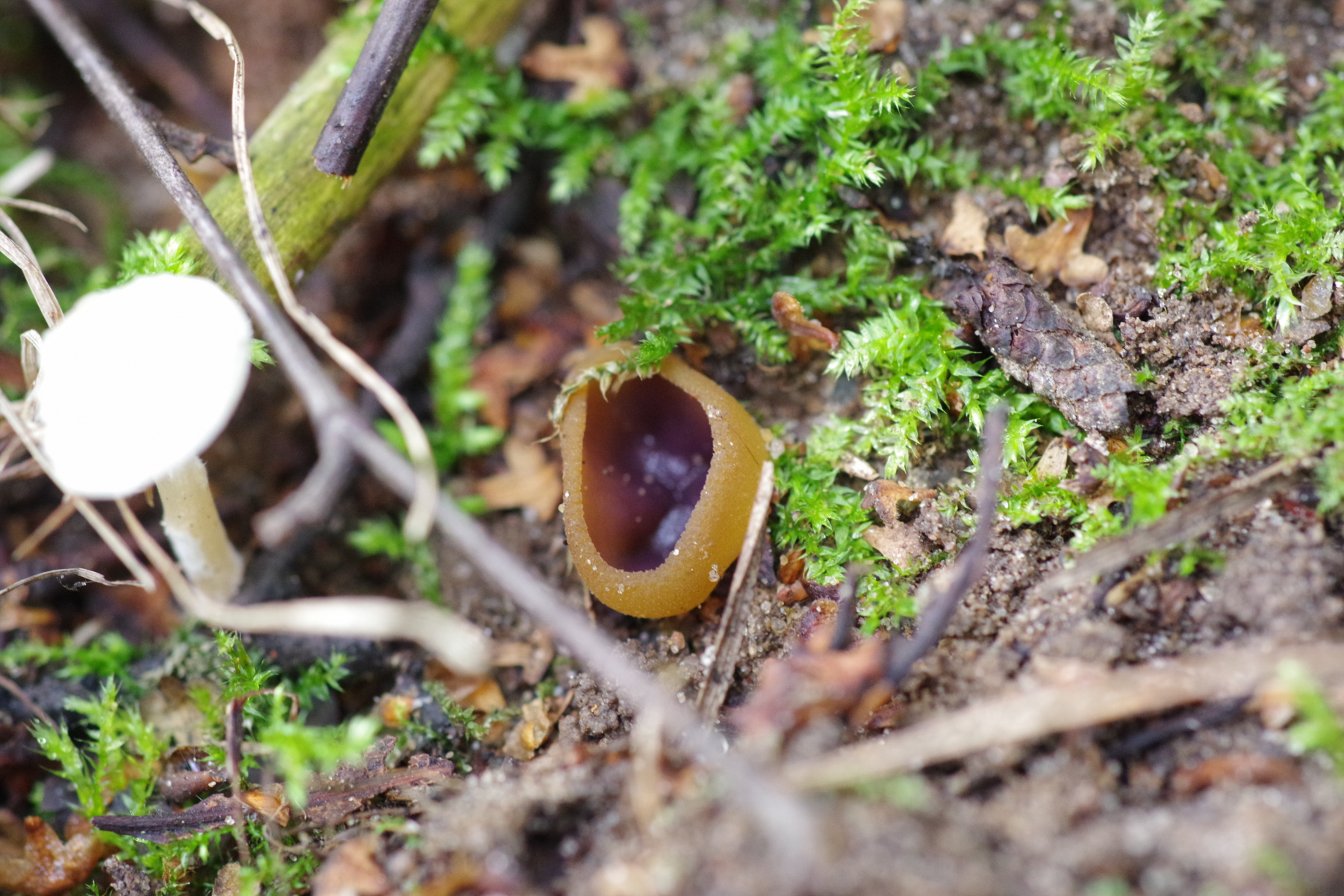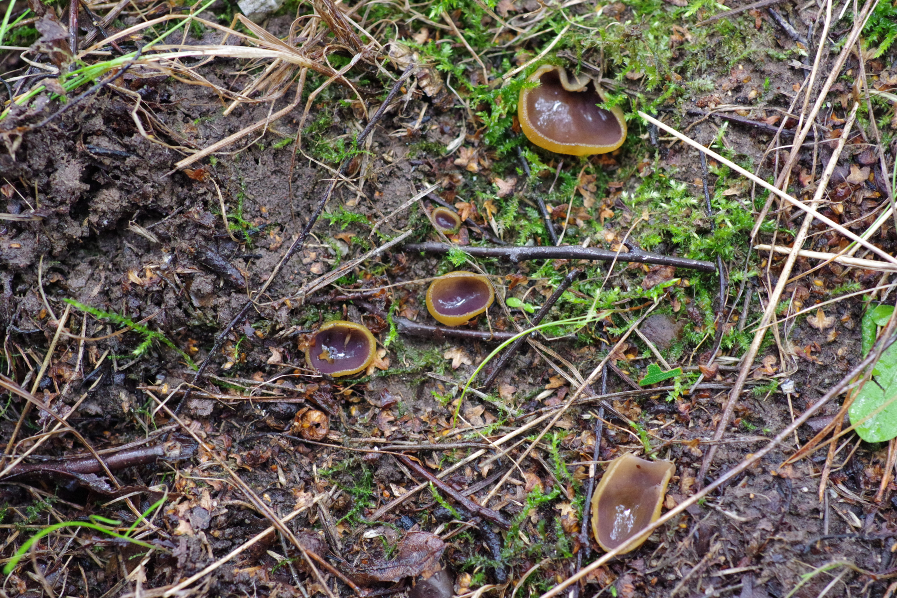 1) innen mit einem Violettschimmer auf Rohboden, aber keine Brandstelle. Unter jungen Birken und Kiefern. Vielleicht Peziza praetervisa?