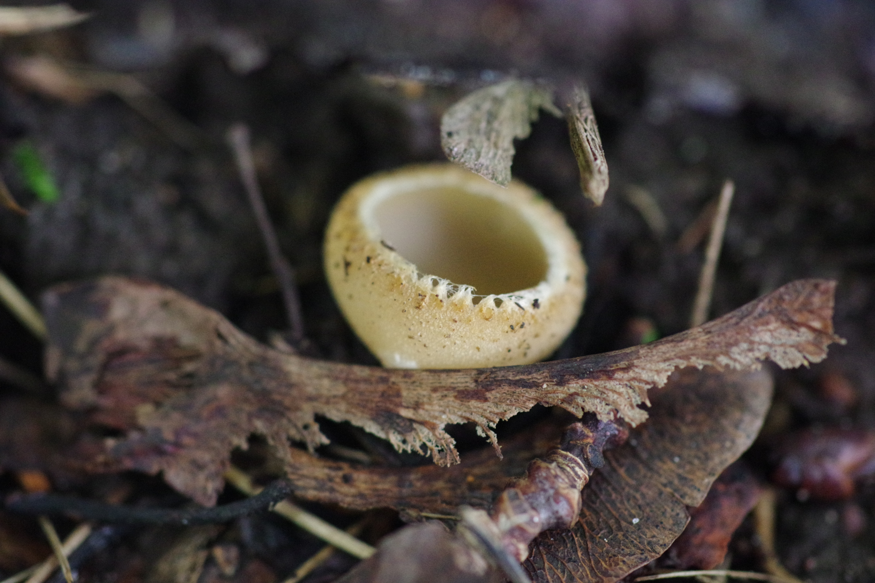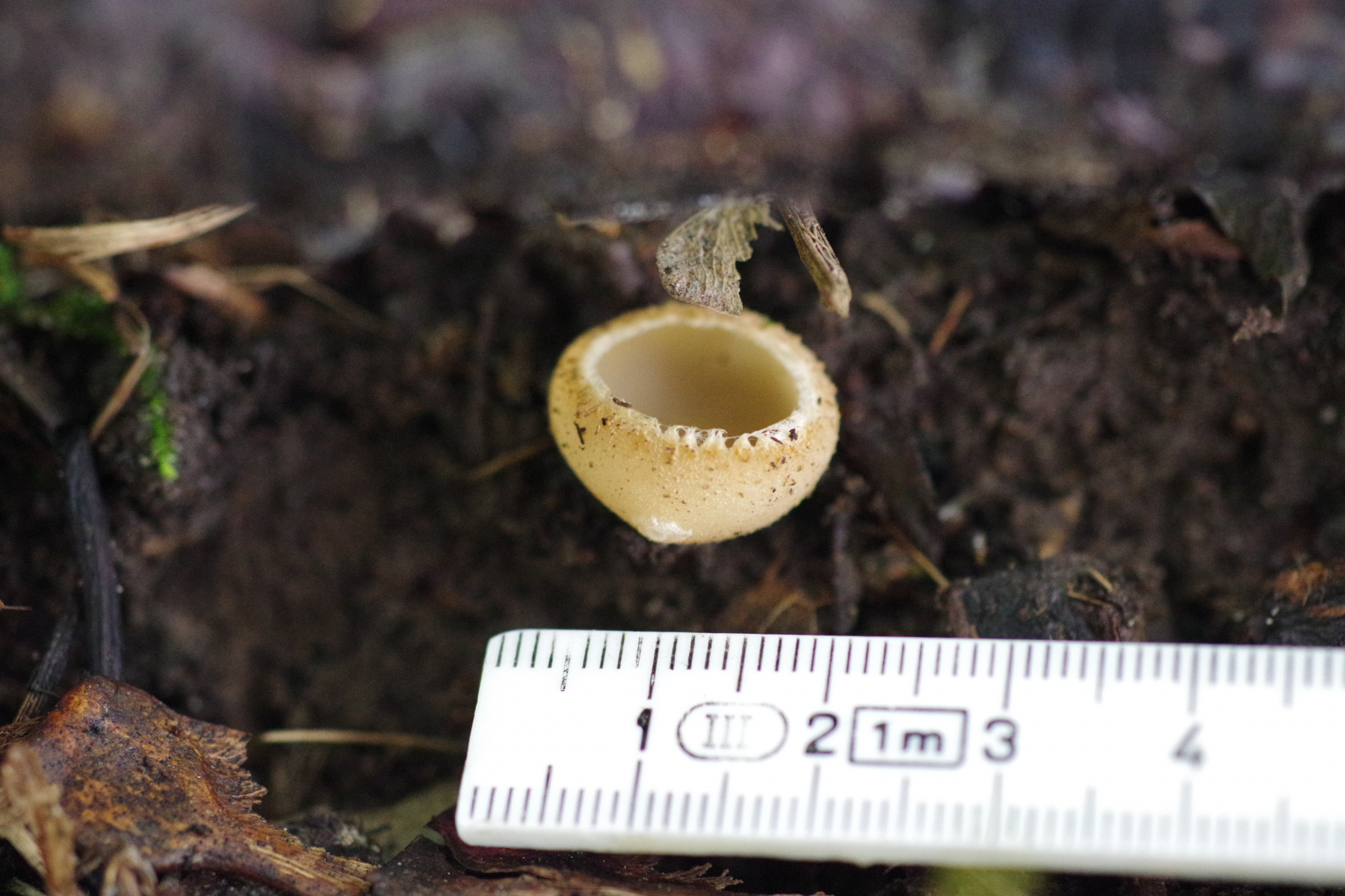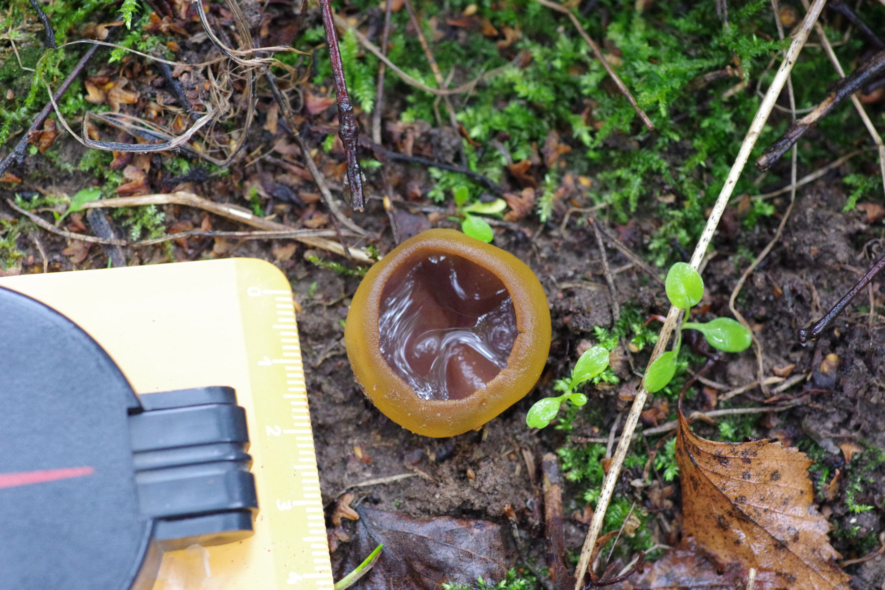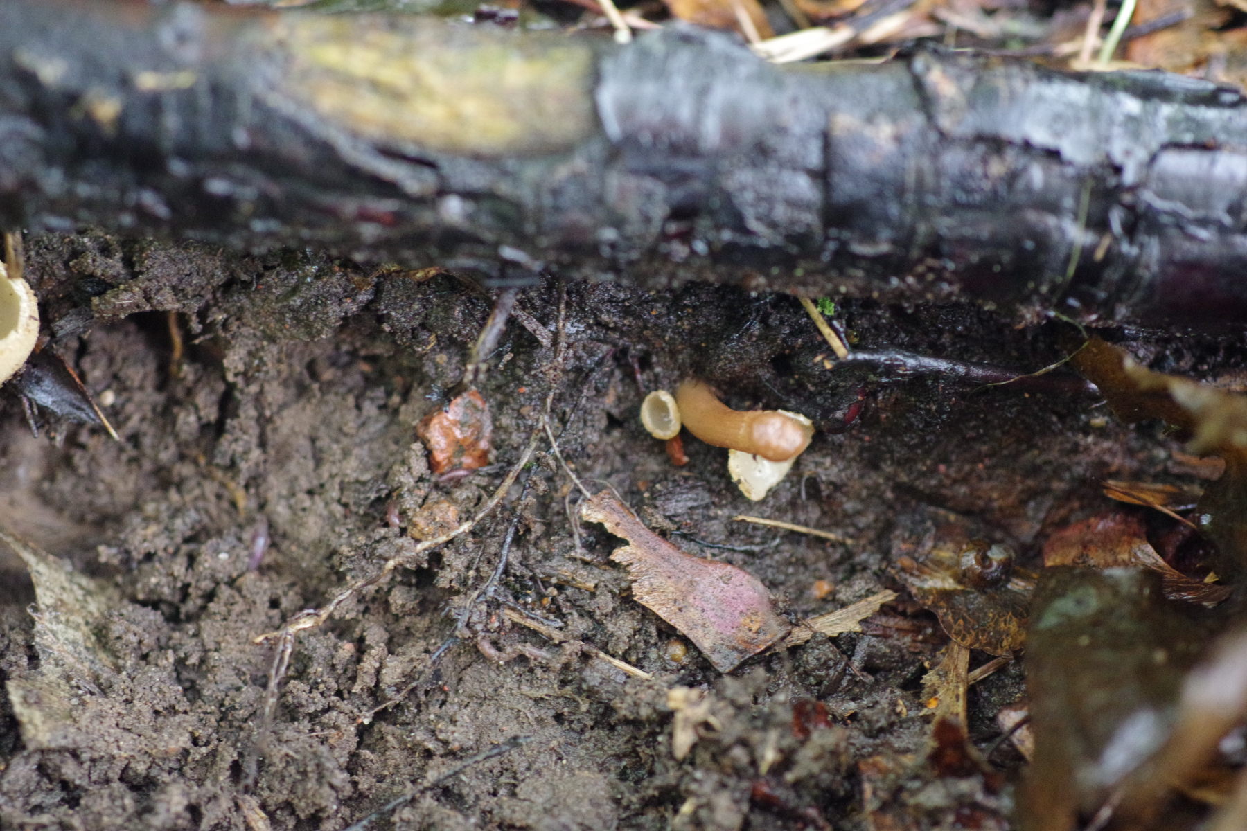 1) innen mit einem Violettschimmer auf Rohboden, aber keine Brandstelle. Unter jungen Birken und Kiefern. Vielleicht Peziza praetervisa?