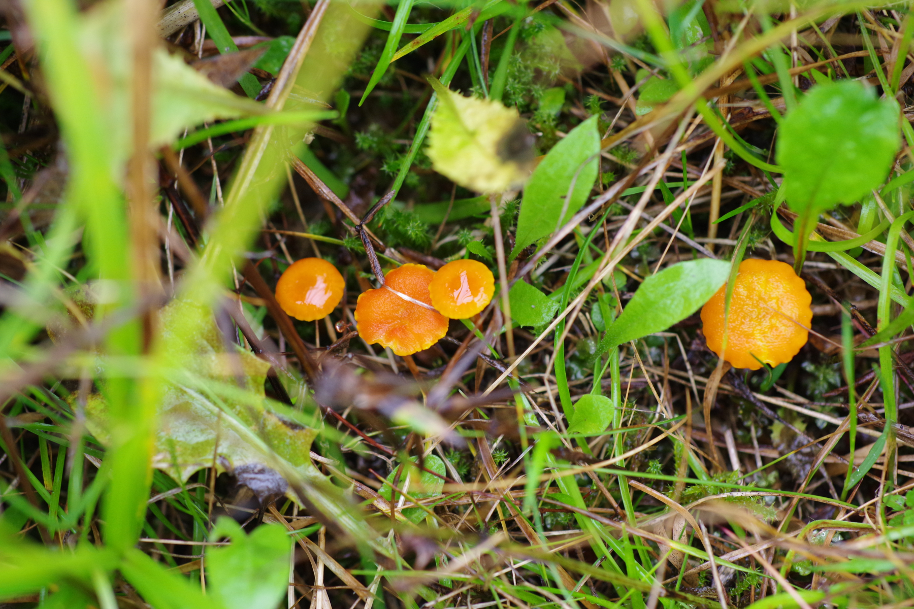 4) Grell und kein Plan (abgesehen davon, dass der erste Gedanke M. oregenensis war, den Mreul(✝) kürzlich erwähnt hatte, aber dafür sollte der Stiel wenigstens etwas transparent sein), hier war leider Schluss mit Akku, die Lamellen sind in der Farbe wie der Hut, etwas heller. Mit Zwischenlamellen und weit am Hut herunterlaufend. Also schon einige Ähnlichkeit zu Rickenella.