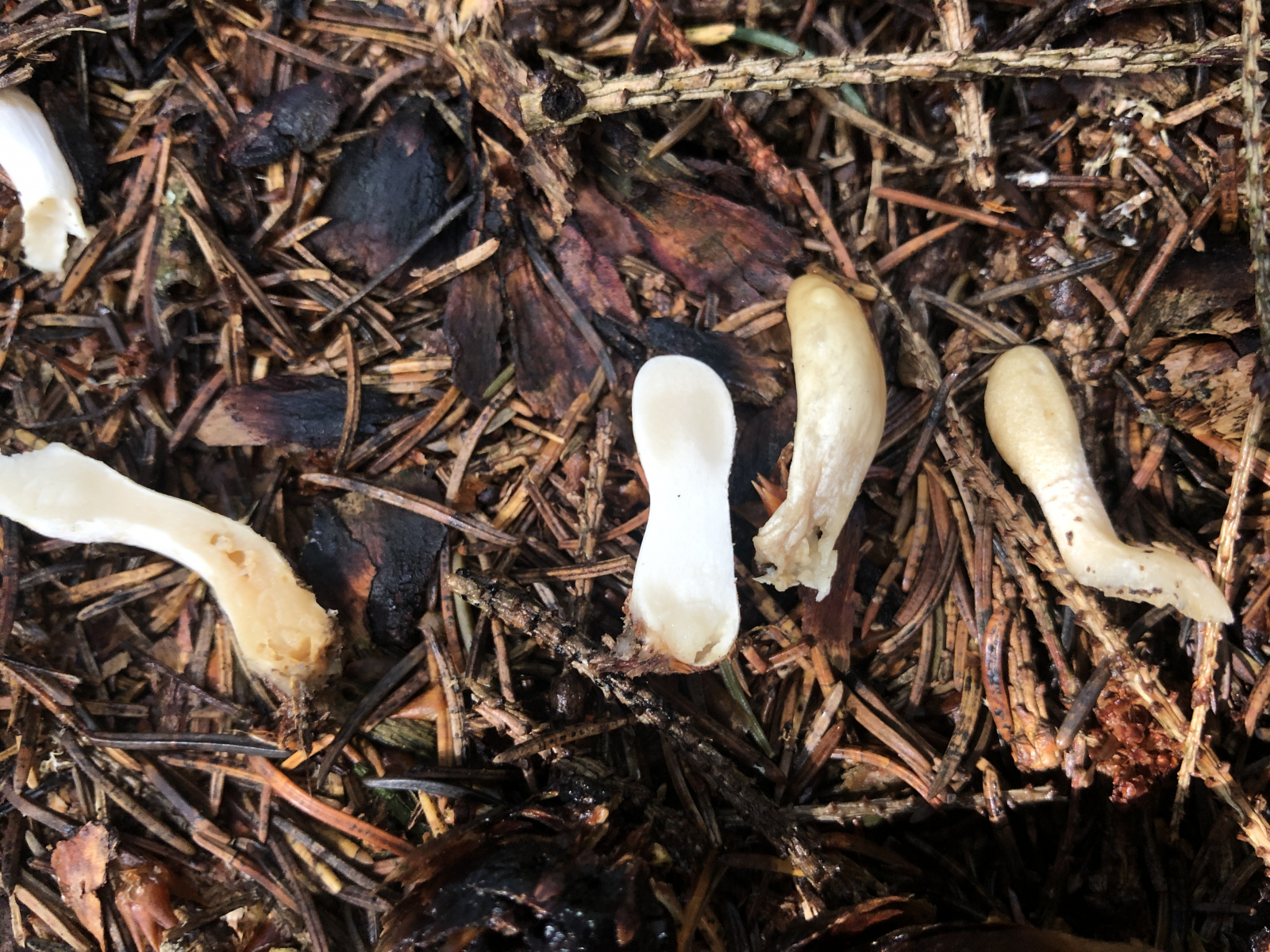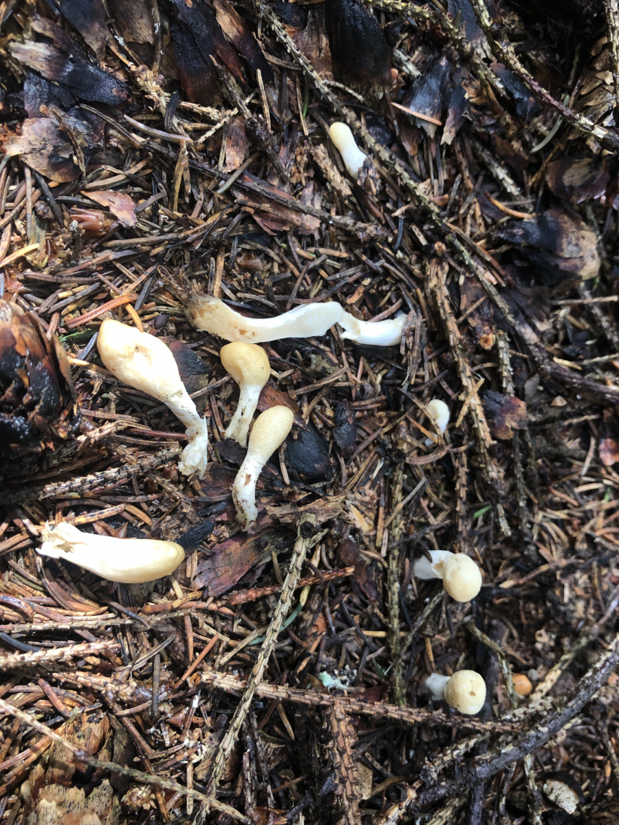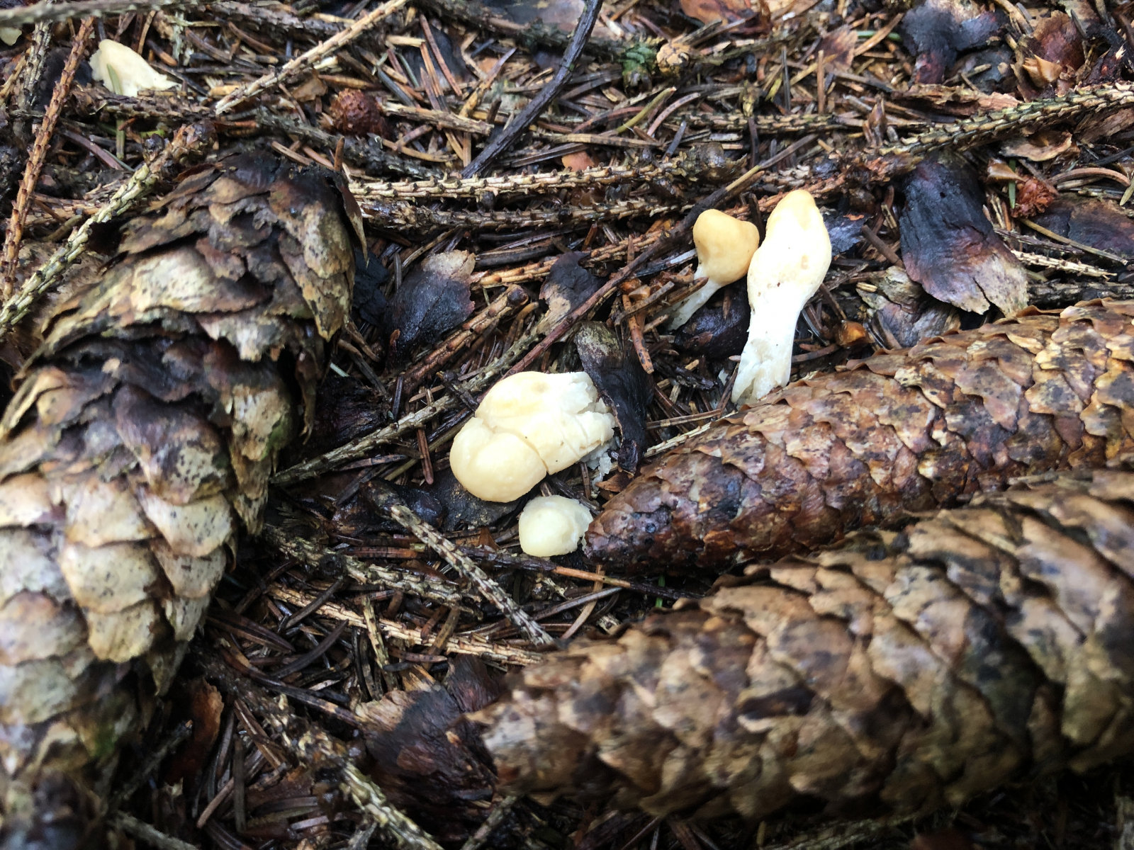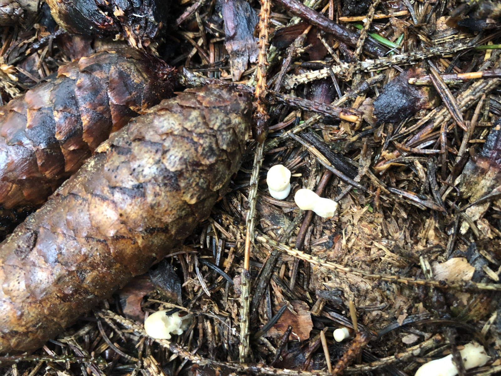 diesen Winzling fand ich gerade im montanten Fichtenwald auf einem Waldweg und nun zerbreche ich mir den Kopf ,was das ist. Zu winzig, um Geruch oder Geschmack zu ergründen. Ansonsten so wie auf den Fotos. Vielleicht noch so viel. Die ganz jungen Pilze sind fast schneeweiß, etwas älter differenziert sich ein etwas dunkler gefärbtes Kopfteil (?) heraus. Nicht weit von dieser Stelle fand ich letzten Sonnabend Cudonia circinans. Aber die sind es nicht. Die Cudonia war kleiner und schmächtiger und auch die jungen Pilze sahen anders aus. .