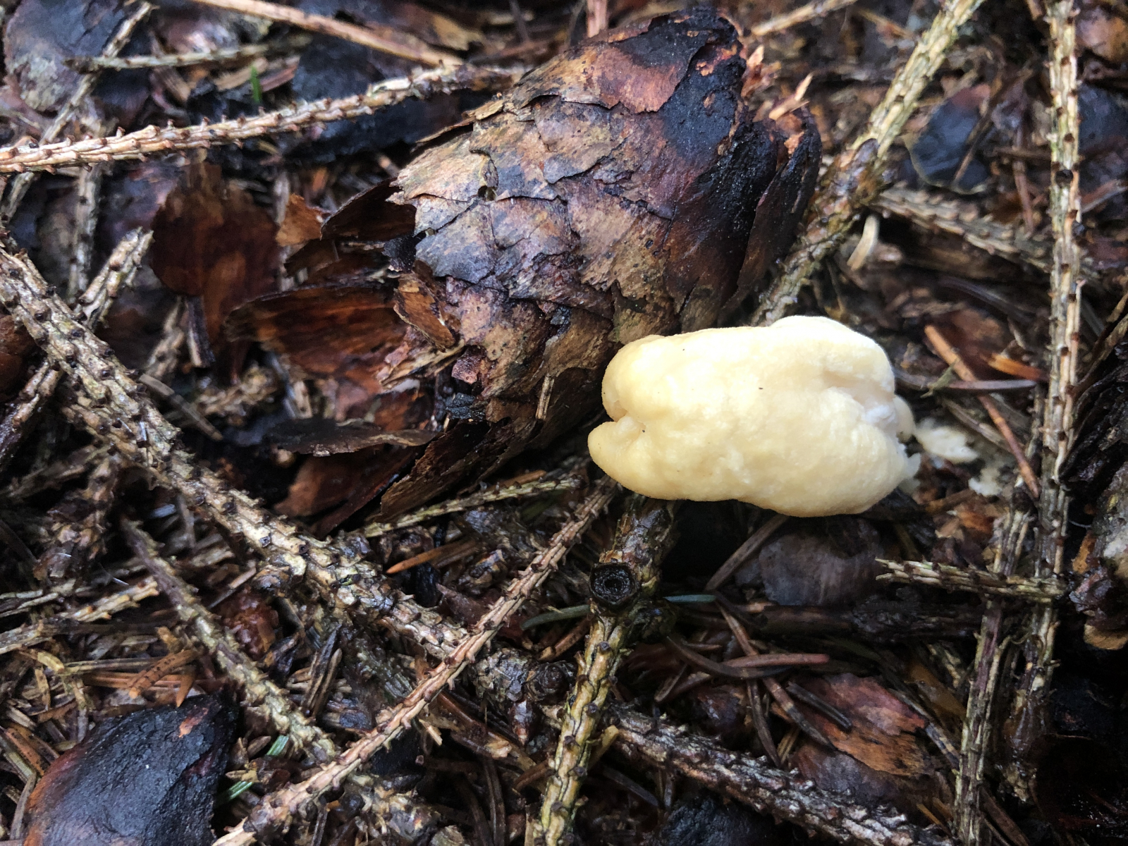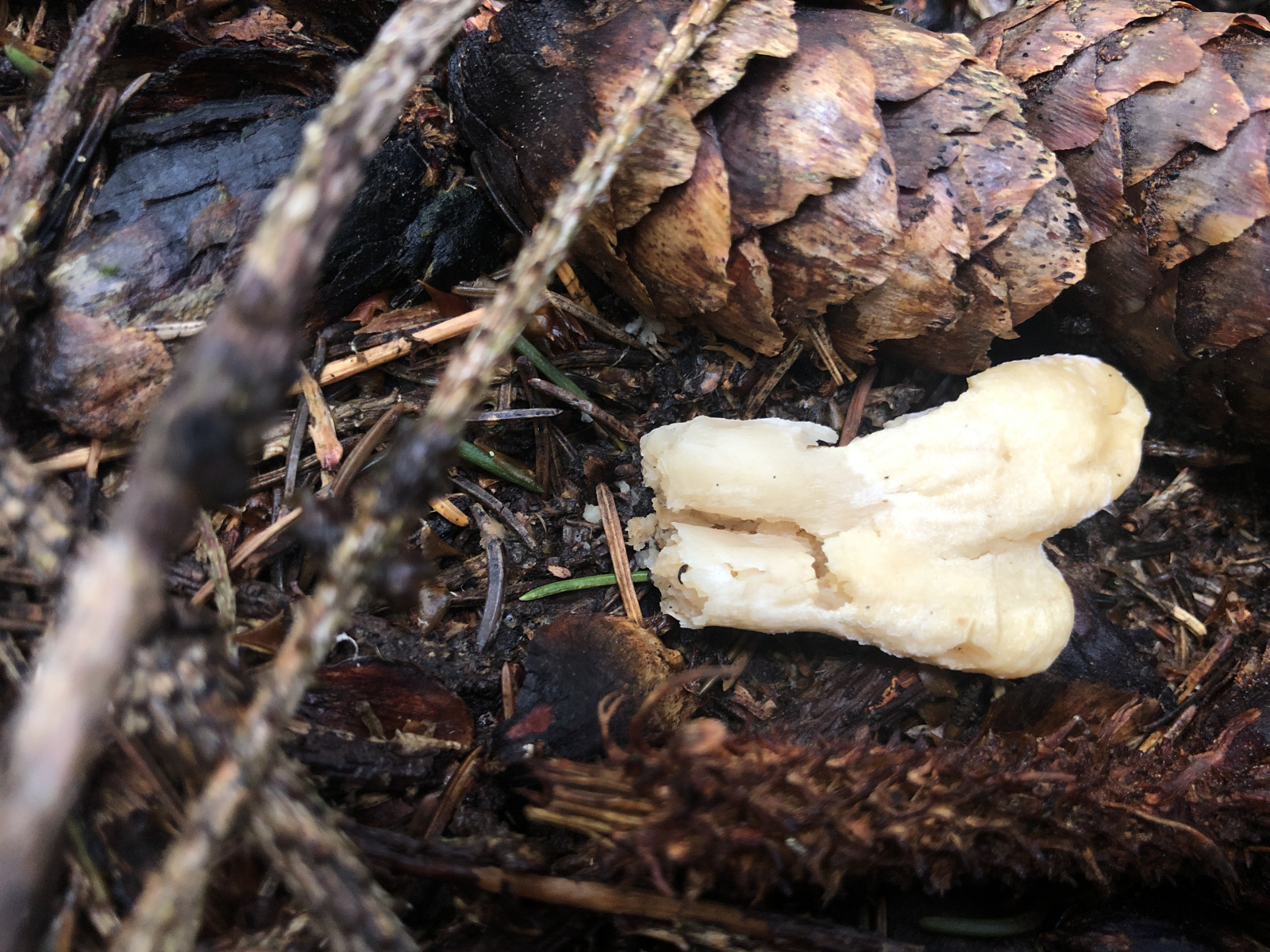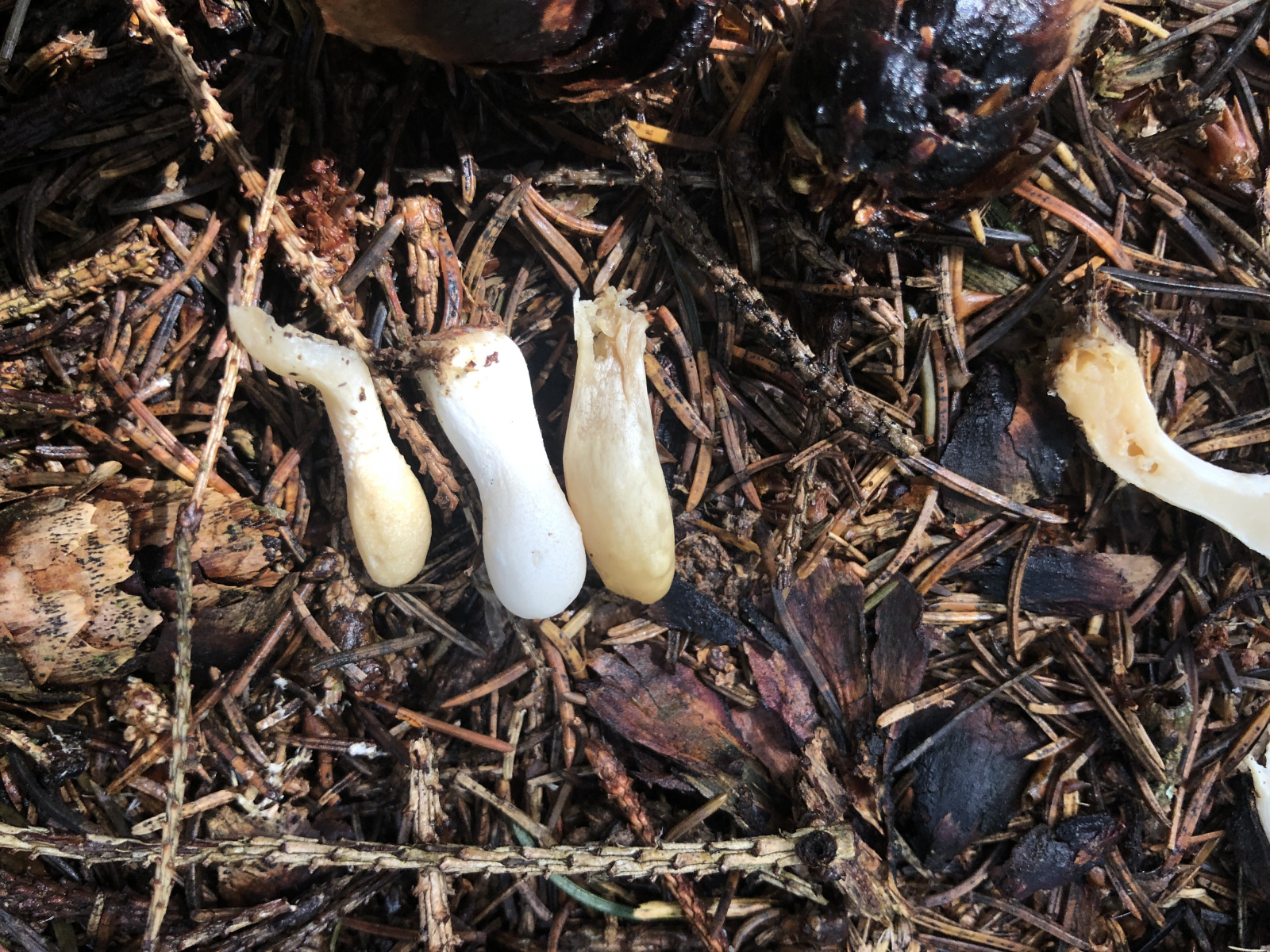 diesen Winzling fand ich gerade im montanten Fichtenwald auf einem Waldweg und nun zerbreche ich mir den Kopf ,was das ist. Zu winzig, um Geruch oder Geschmack zu ergründen. Ansonsten so wie auf den Fotos. Vielleicht noch so viel. Die ganz jungen Pilze sind fast schneeweiß, etwas älter differenziert sich ein etwas dunkler gefärbtes Kopfteil (?) heraus. Nicht weit von dieser Stelle fand ich letzten Sonnabend Cudonia circinans. Aber die sind es nicht. Die Cudonia war kleiner und schmächtiger und auch die jungen Pilze sahen anders aus. .