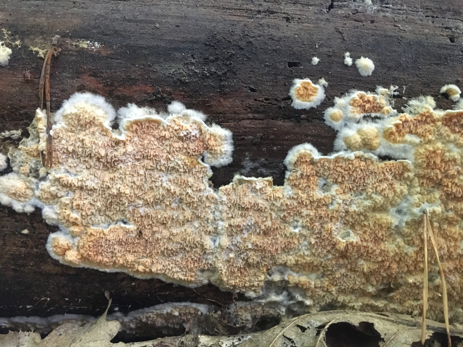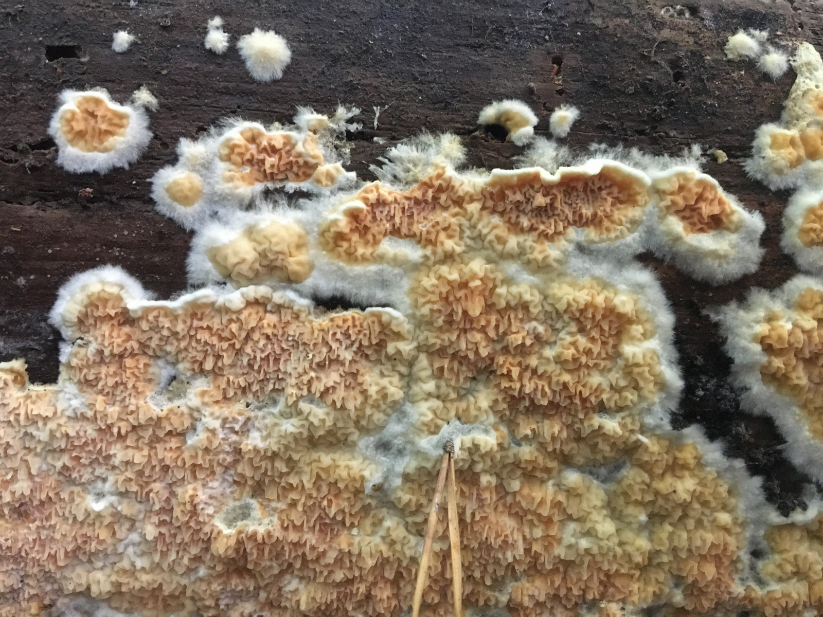 heute habe ich im Burgenland einen merullioiden Pilz an Föhre gefunden. Zuerst dachte ich an Gloeoporus taxicola, aber das passt nicht. Könnte das Pseudomerulius aureus sein oder doch eher Serpula himantioides oder was ganz anderes?