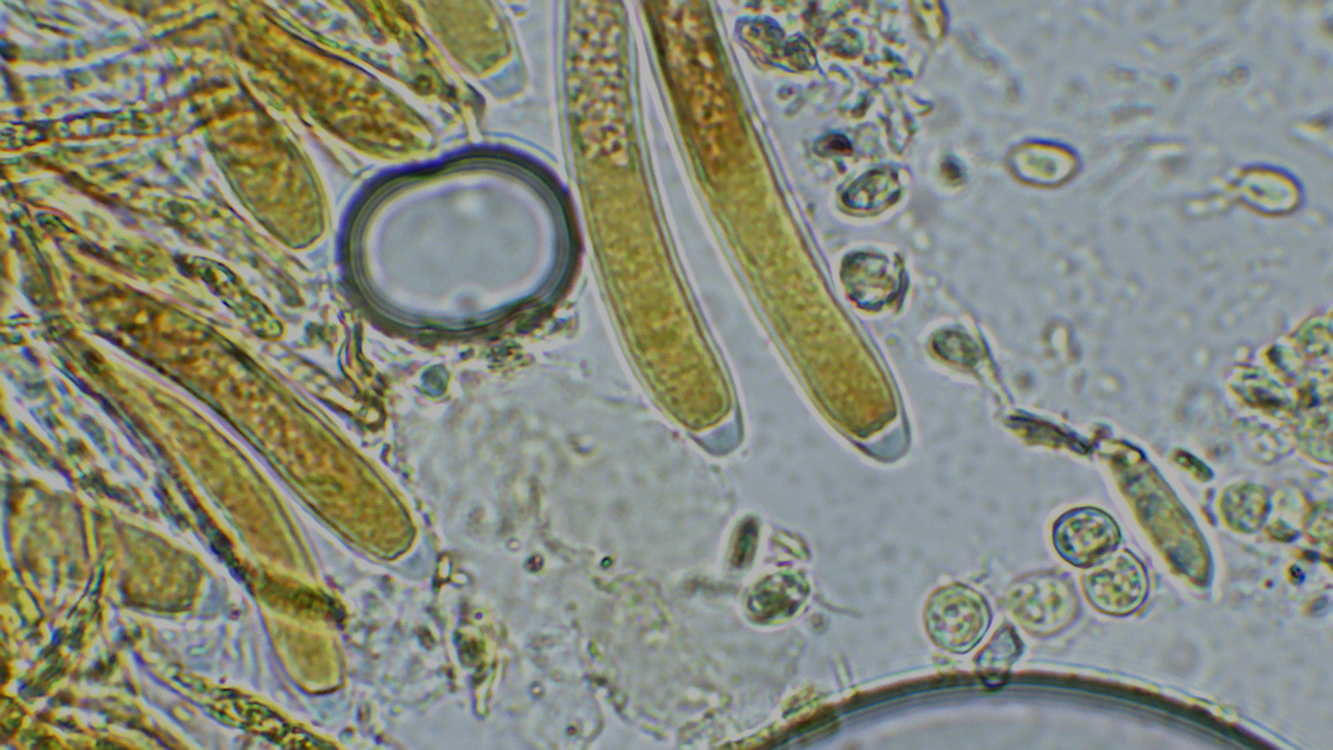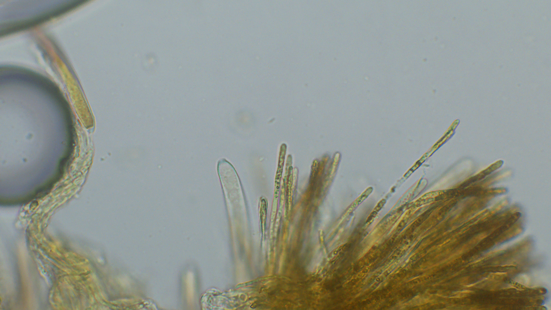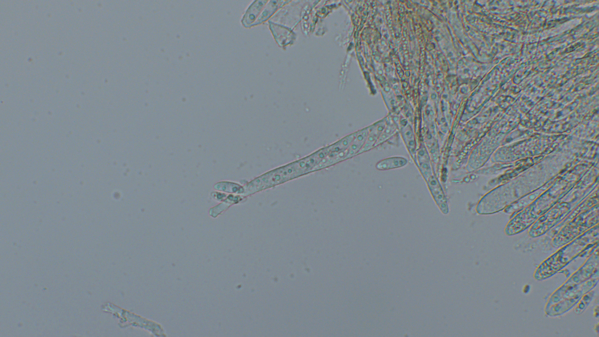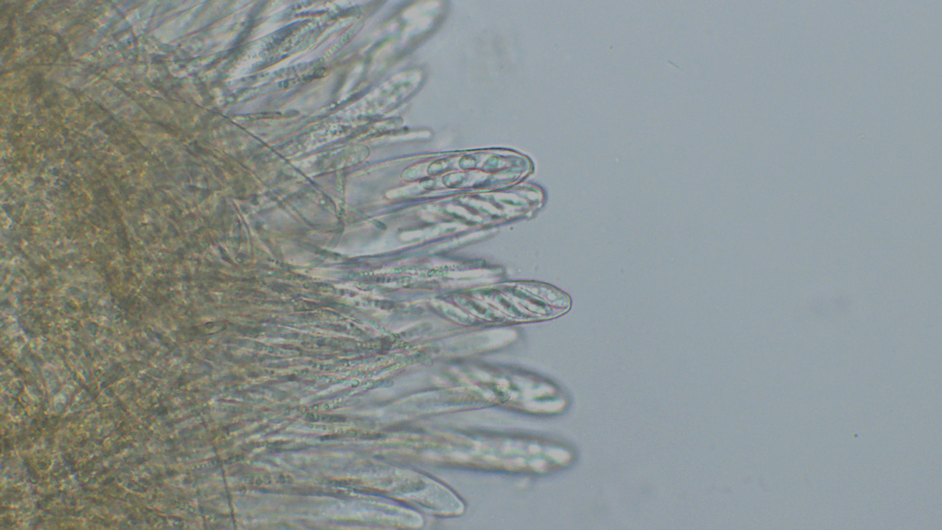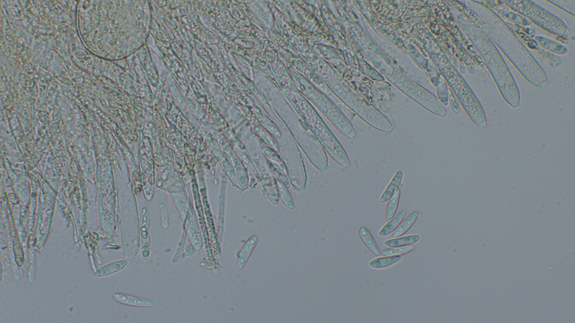 Ich hatte sie danach mikroskopiert, dann aber keine Zeit mehr gehabt mich weiter mit dem Fund zu beschäftigen. Vorhin habe ich mal geschaut, welche Arten denn da so in Frage kämen und bin bei Hymenoscyphus lutescens hängen geblieben, der m.E. ganz gut passt.