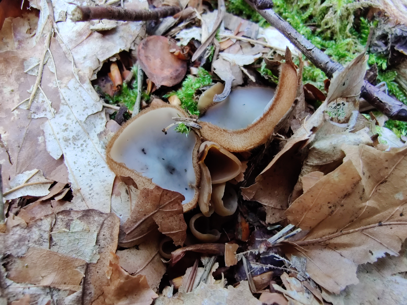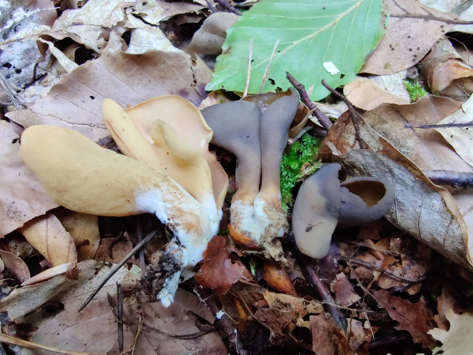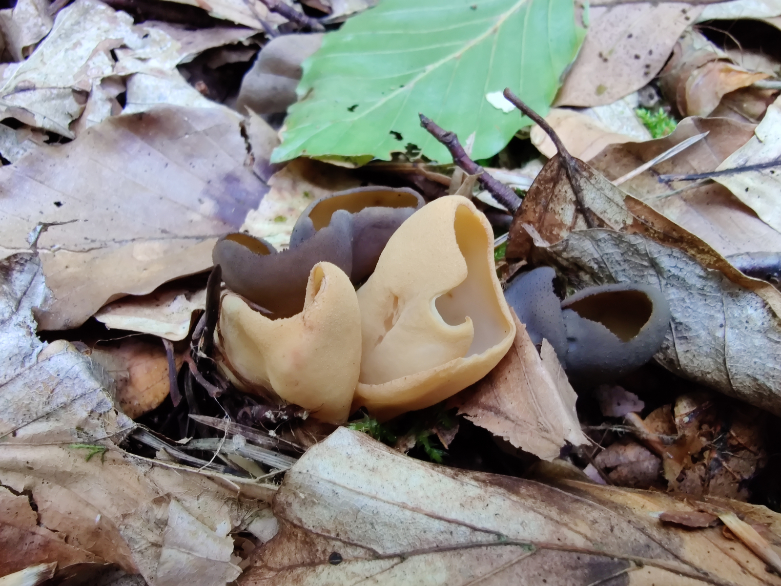 5. Ein Öhrling, das Eselsohr (Otidea onotica) könnte gut passen. Ich weiß jedoch nicht, ob man den so einfach makroskopisch festnageln kann. Einen rosa Ton des Hymeniums konnte ich lediglich erahnen. Bemerkenswert fand ich die dunklen Fruchtkörper in direkter Nachbarschaft zu den hellen. Hat da schon jemand ähnliche Beobachtungen gemacht oder kann mich aufklären?