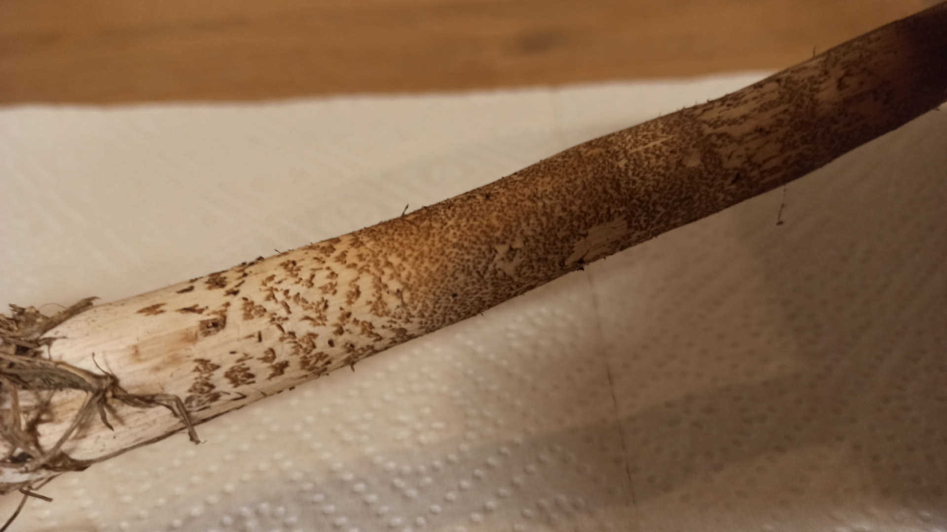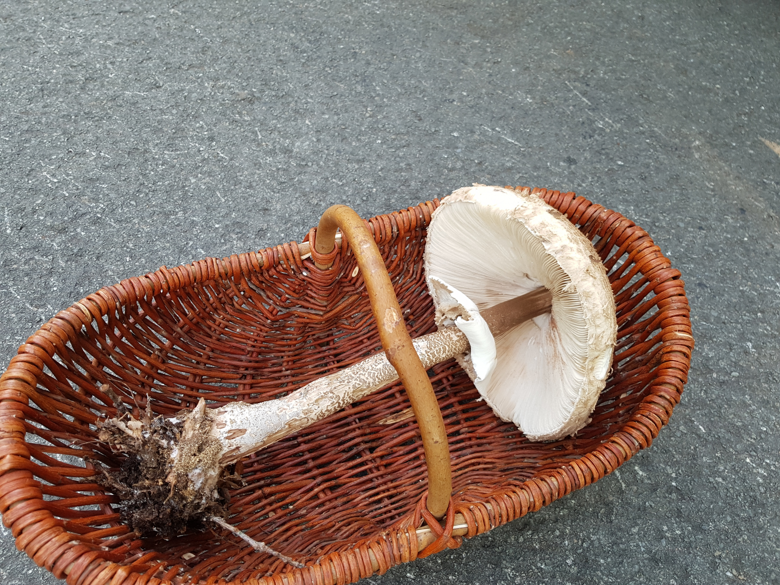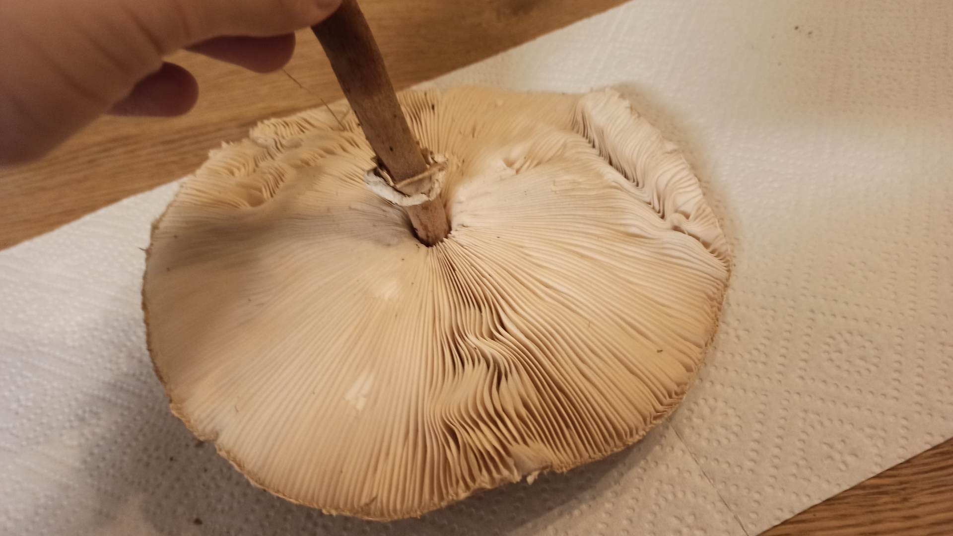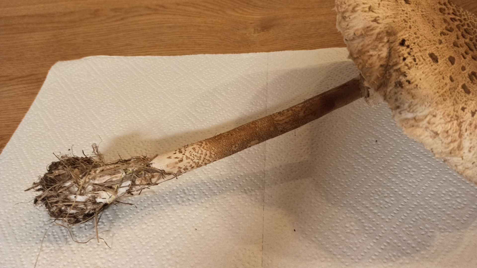 Dieses Exemplar hatte etwa einen Hutdurchmesser von etwa15 cm. Man kann gut die schuppige Haut am Hut erkennen. Der Ring war wollig, weich und verschiebbar. Der Stiel genattert, unten ist die Knolle zu sehen. Bilder vom Schnitt habe ich leider nicht mehr gemacht. Der Stiel war holzig und hohl. Er hat nicht gerötet, die Lamellen waren komplett weiß, roch weitestgehend neutral, ggf. etwas pilzig. Die Fotos sind Vorgestern entstanden und keine Glanzleistung, sie sind abends, nach dem Spazieren, gemacht worden.