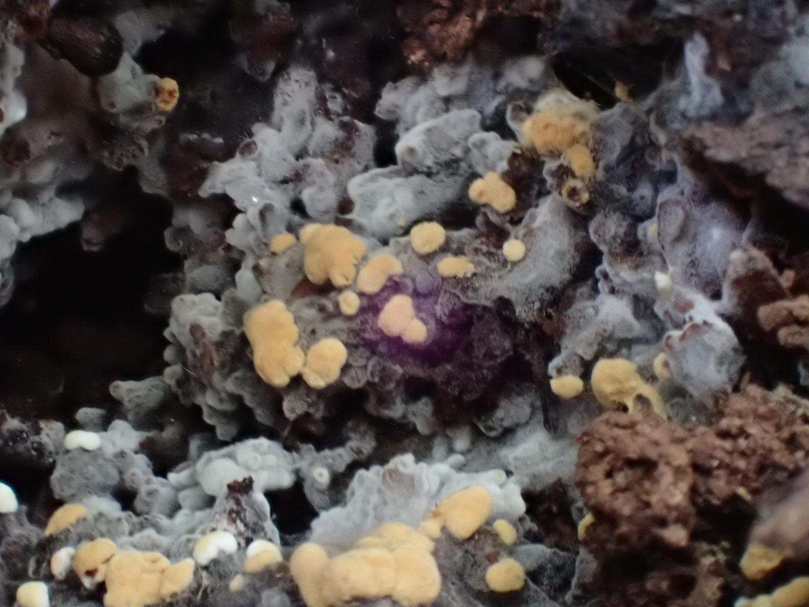 1. Ein leuchtend lilarosa hyphiger Belag auf Bucheckern, Buchenblättern und dünnen Ästchen im feuchten Mulm. Auf den rosa Belegen sitzen stellenweise kleine helle Kügelchen etwa 0,5mm groß. Die Mikros geben leider nicht viel her. Aufgrund der im Mikroskop sichtbaren hyphigen Struktur (in kurzen Abschnitten septiert) der pinken Masse im Mikroskop nehme ich mal an, es ist ein Pilz und es sind keine Bakterien/Algen. Beim Mikroskopieren der zerquetschten Kügelchen fand ich mehr blockartige Strukturen, ev. sind in kurzen Abschnitten septierte Konidien zu sehen. Bei meinen Recherchen bin ich auf Illosporopsis christiansenii gestossen. Dieser Pilz sollte aber auf Flechten wachsen eingeringelte septierte Konidien haben. Könnte es diese Anamorphe sein? Oder sitzt gar ein zweiter Pilz auf der rosa Masse?