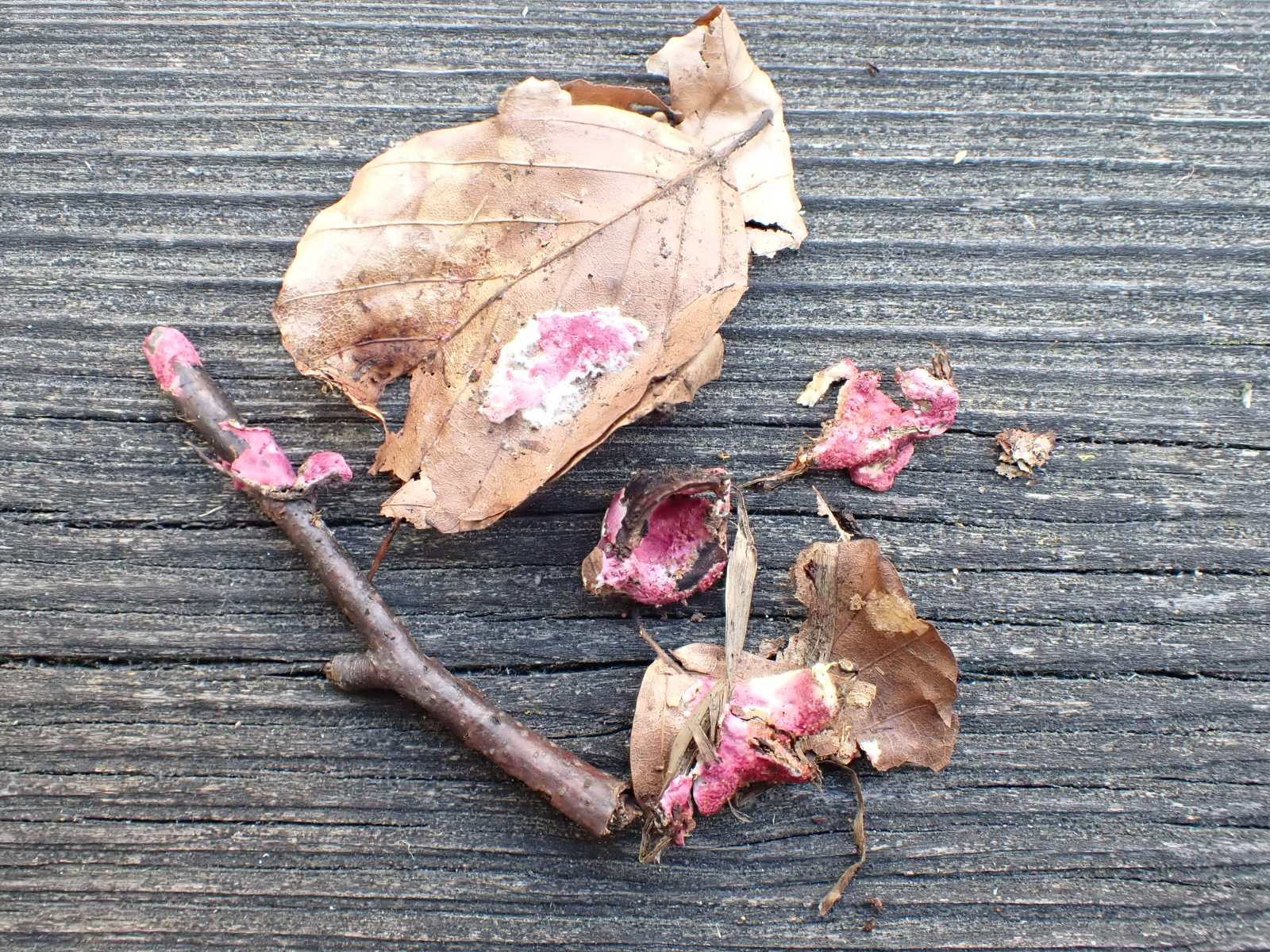 1. Ein leuchtend lilarosa hyphiger Belag auf Bucheckern, Buchenblättern und dünnen Ästchen im feuchten Mulm. Auf den rosa Belegen sitzen stellenweise kleine helle Kügelchen etwa 0,5mm groß. Die Mikros geben leider nicht viel her. Aufgrund der im Mikroskop sichtbaren hyphigen Struktur (in kurzen Abschnitten septiert) der pinken Masse im Mikroskop nehme ich mal an, es ist ein Pilz und es sind keine Bakterien/Algen. Beim Mikroskopieren der zerquetschten Kügelchen fand ich mehr blockartige Strukturen, ev. sind in kurzen Abschnitten septierte Konidien zu sehen. Bei meinen Recherchen bin ich auf Illosporopsis christiansenii gestossen. Dieser Pilz sollte aber auf Flechten wachsen eingeringelte septierte Konidien haben. Könnte es diese Anamorphe sein? Oder sitzt gar ein zweiter Pilz auf der rosa Masse?