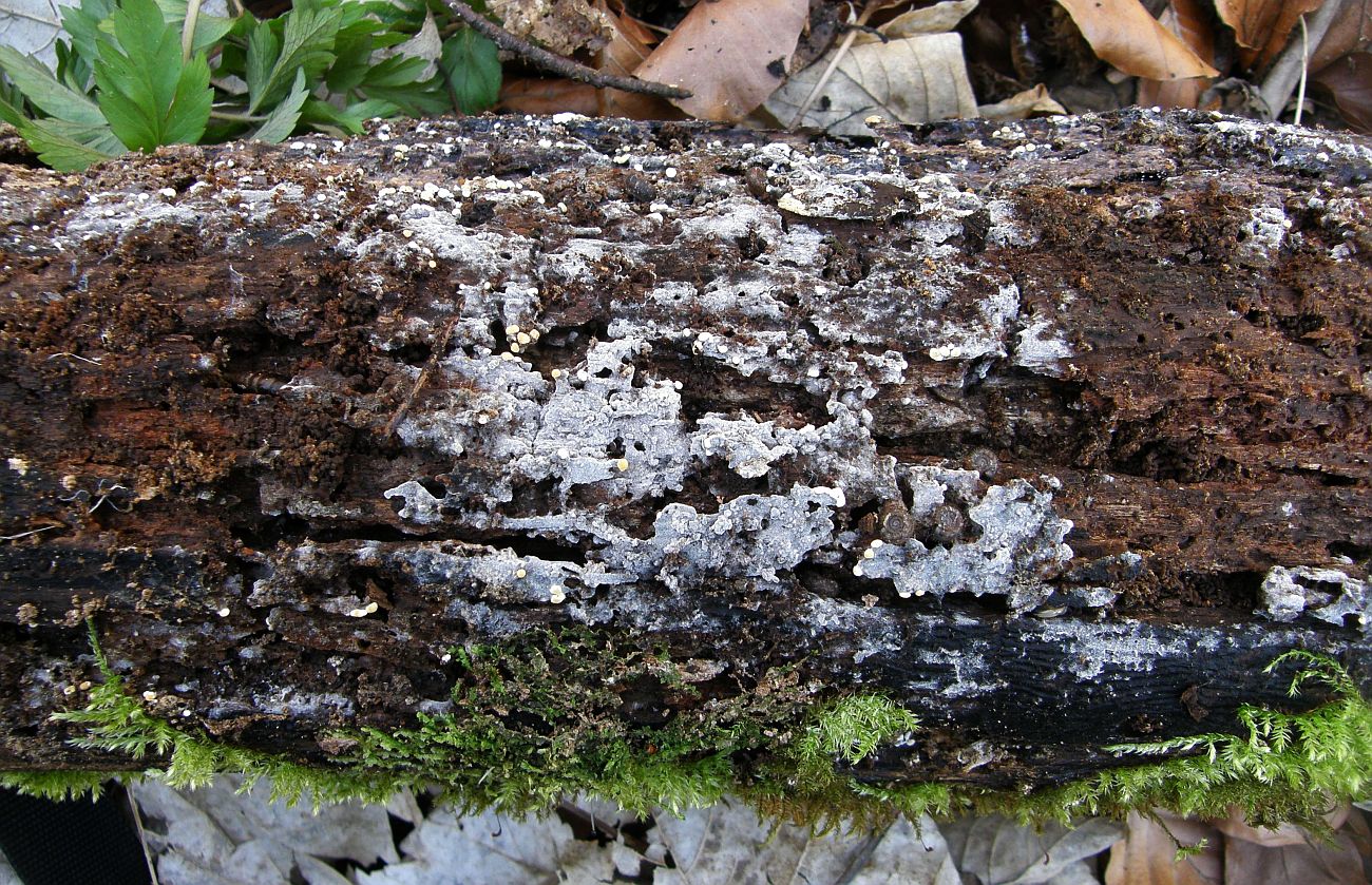 3. Diesen Pilz konnte ich bestimmen. Wenn mich nicht alles täusche ist es Botryobasidium aureum. Ich zeige ihn vor allem wegen der formschönen zitronenförmigen Konidien, das ist die gelbe Masse auf dem filigranen weissen Belag.