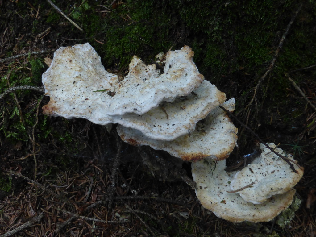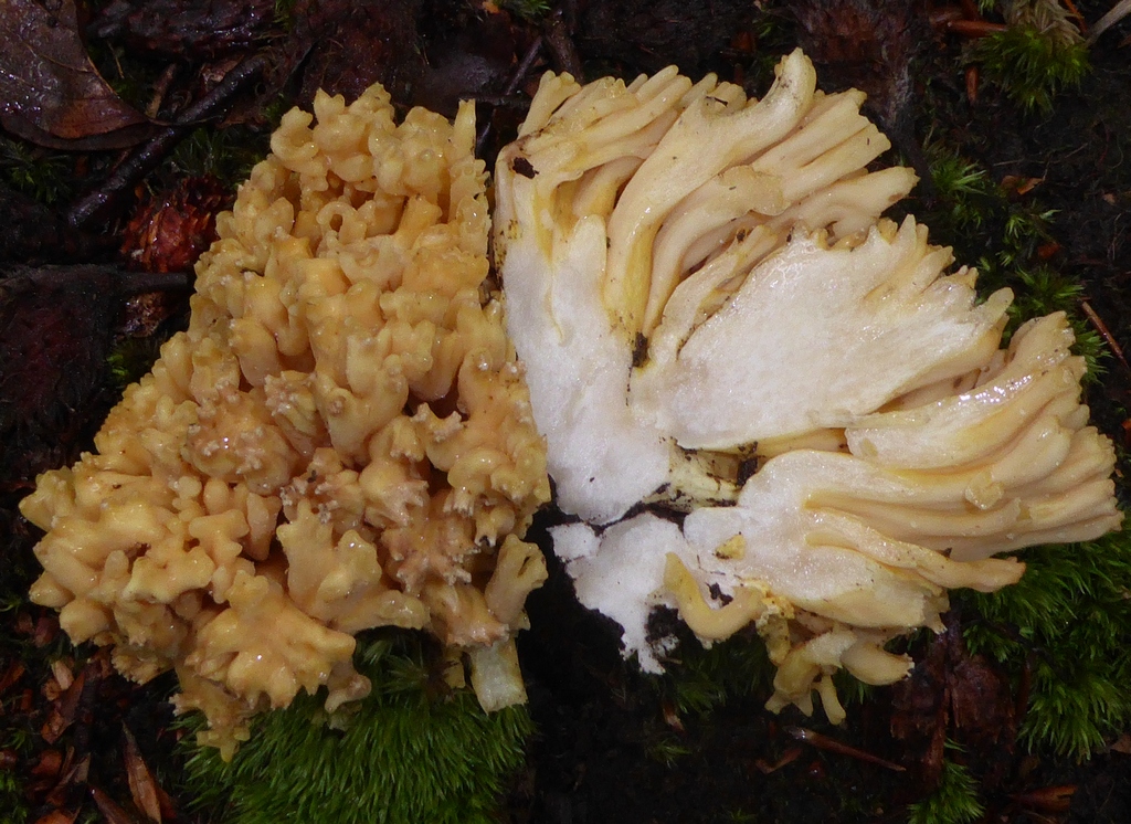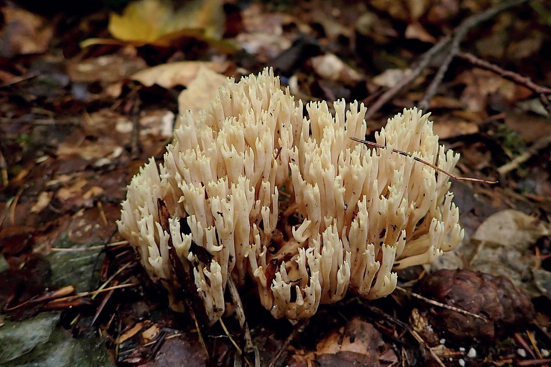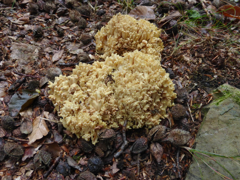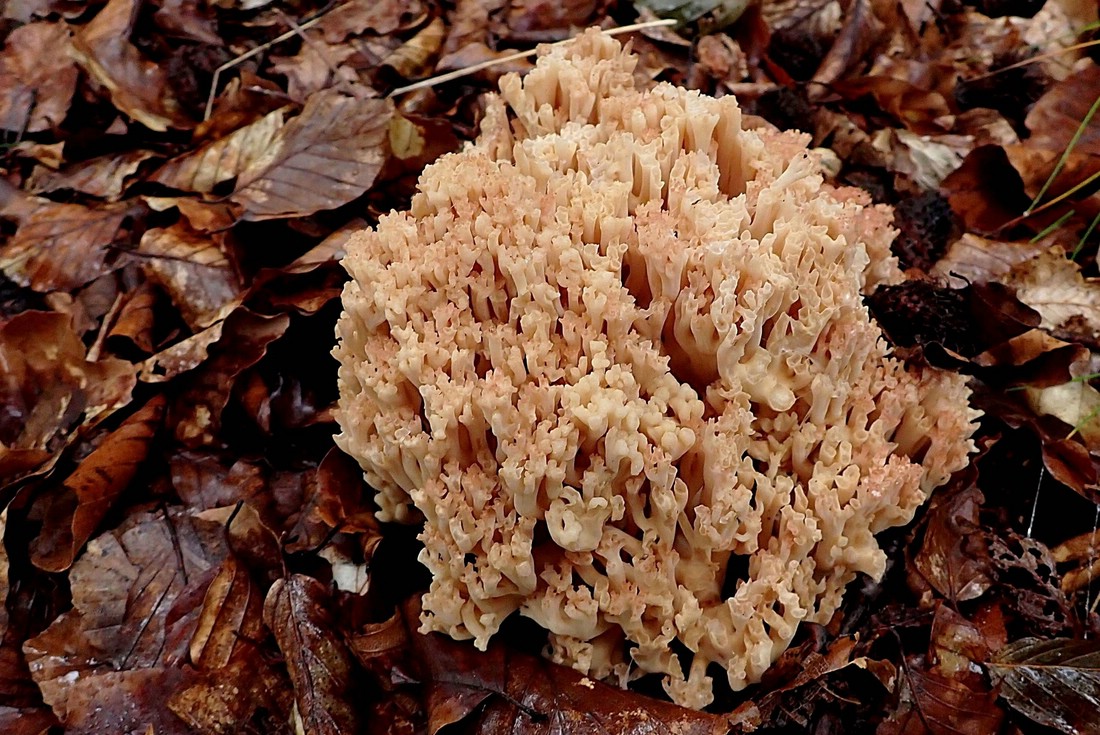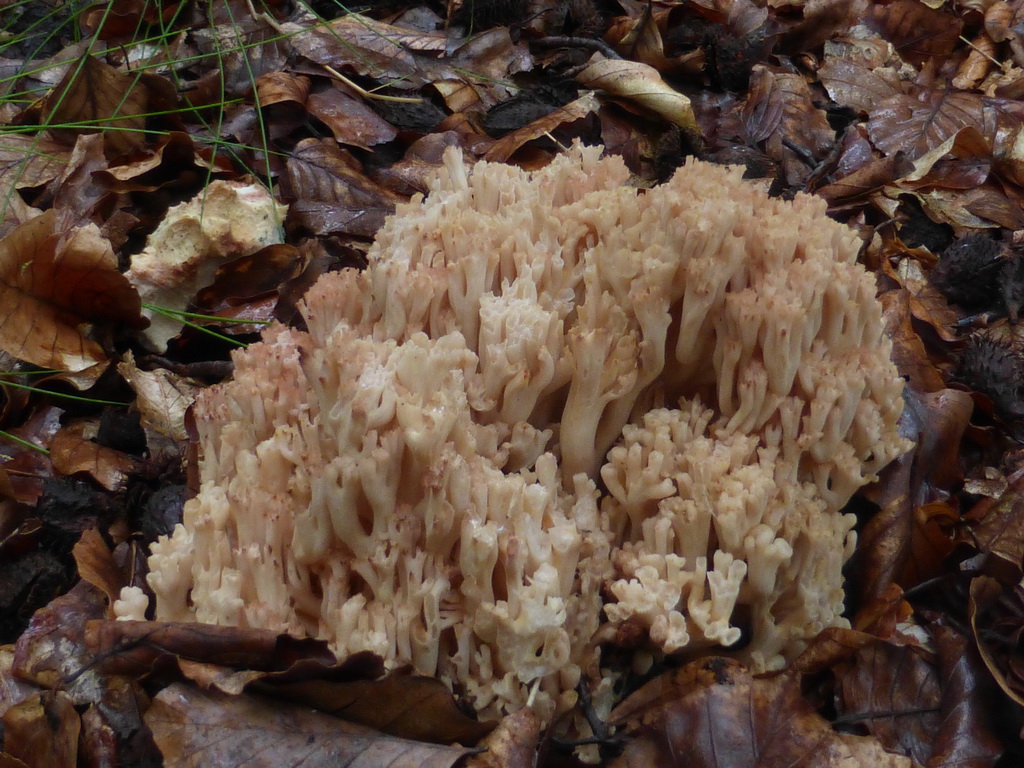 In unmittelbarer Nähe wuchs eine ganze Gruppe Rosaspitziger Korallen (Ramaria rubripermanens), eine recht seltene, dem Hahnenkamm ähnelnde Art.