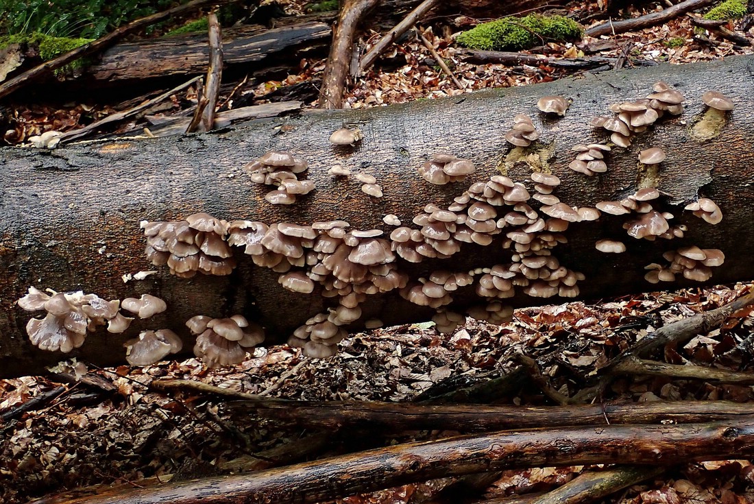 An einem umgestürzten Buchenstamm konnten bereits die ersten Vorboten des nahenden Winters entdeckt werden. Austernseitlinge (Pleurotus ostreatus) im Optimalstadium.