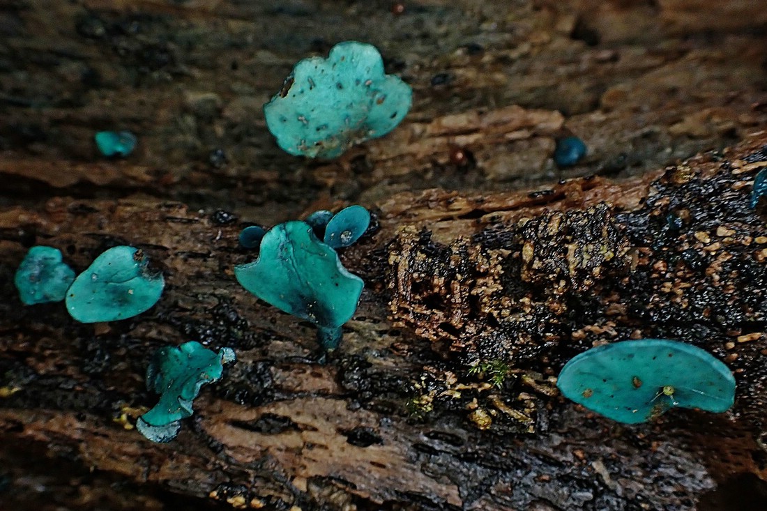 Dann gab es noch diese bizarren Grünspanbecherlinge, vermutlich Chlorociboria aeruginascens, eine Art, die ich nach gut 20 Jahren erstmals wiederfand.