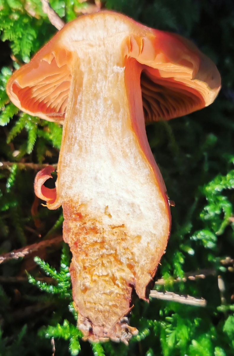 Sieht für mich aus wie einer der Cortinarius-Rauköpfe, wegen der augenscheinlich fehlenden Streifenzeichnung auf dem Stiel eher in Richtung C. orellanus als rubellus.