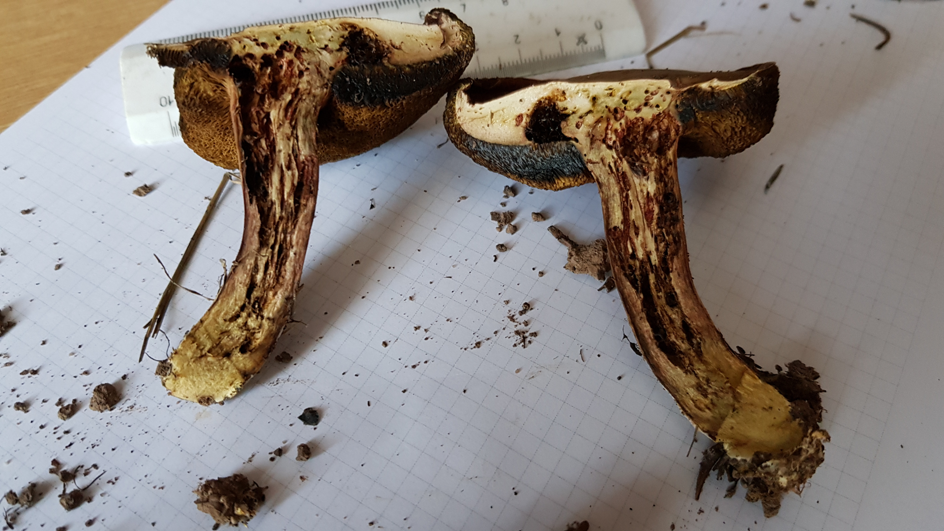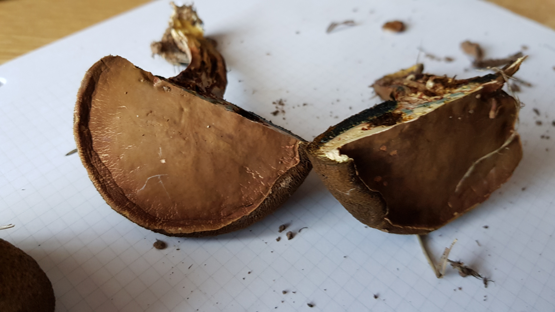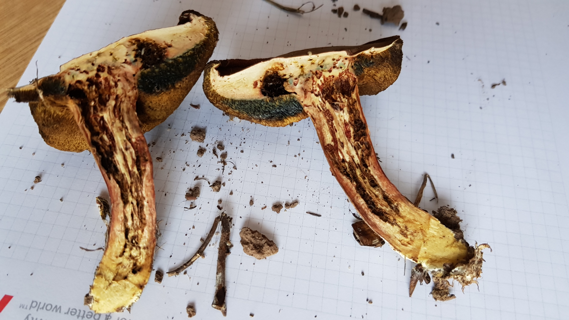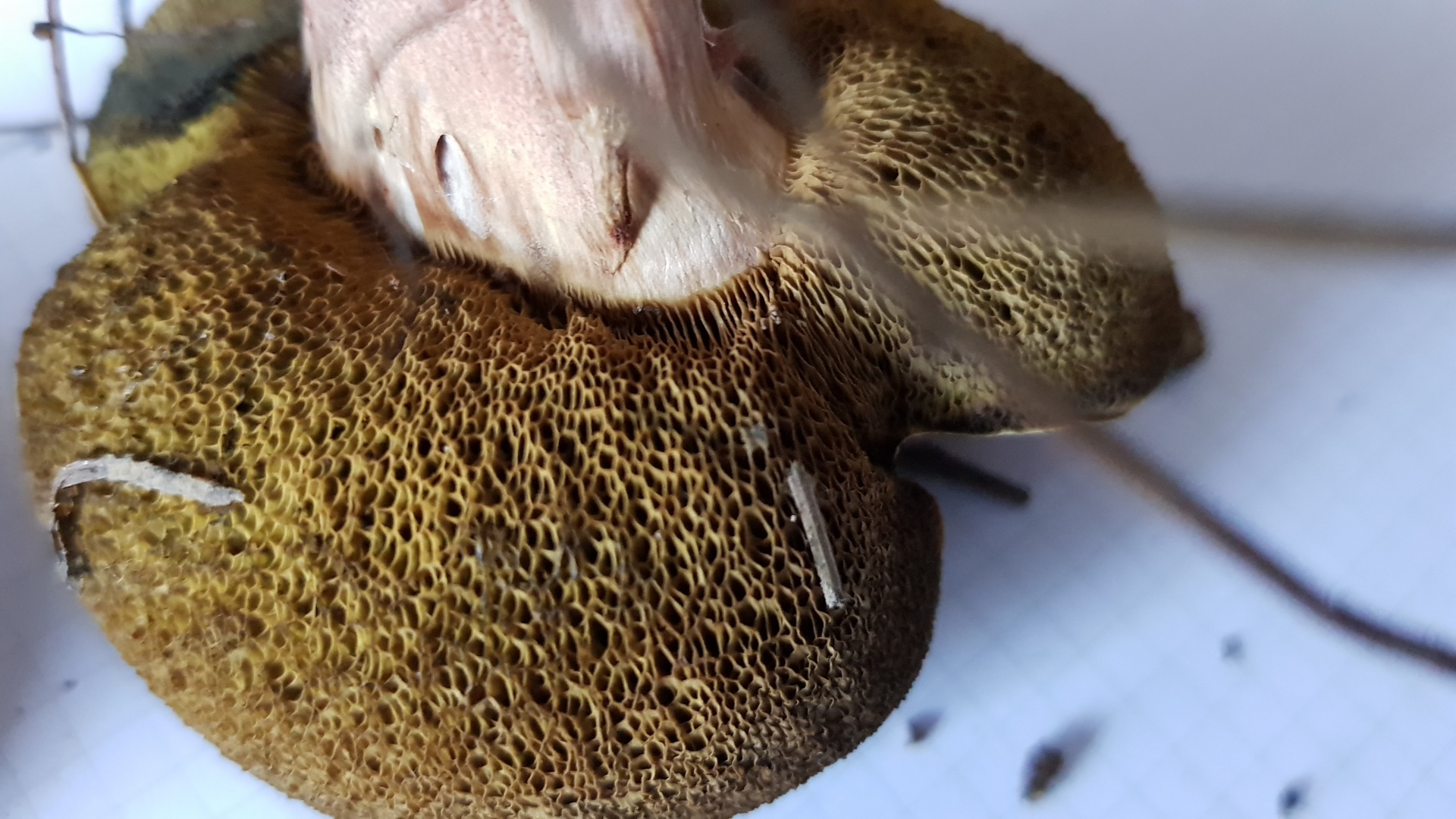 Obwohl ich eigentlich immer falsch mit meinen Bestimmungsversuchen liege, versuche ich es schon wieder. Die ersten Aufnahmen vor Ort brachten mich auf die Idee, dass es eine Ziegenlippe sein könnte. Die Poren sind mir aber zu wenig gelb, obwohl der Pilz wohl schon alt ist.