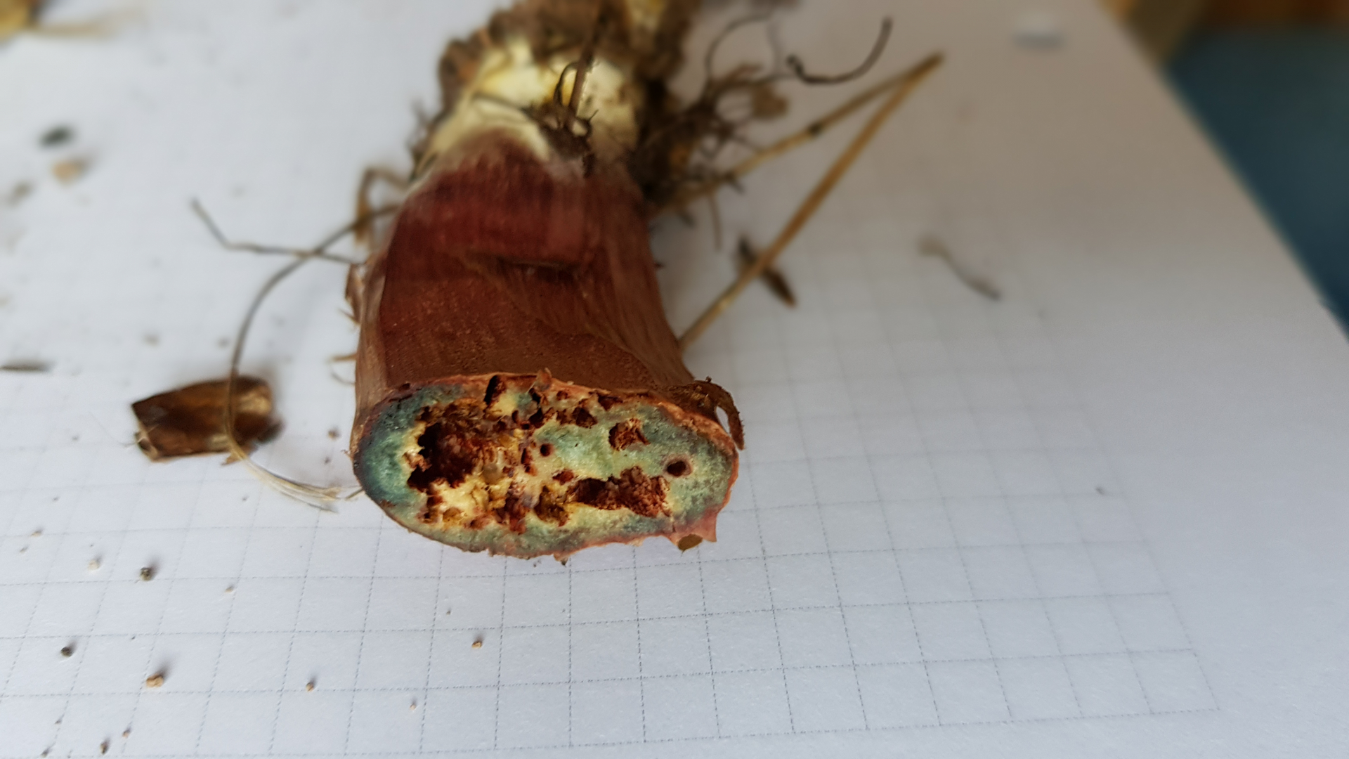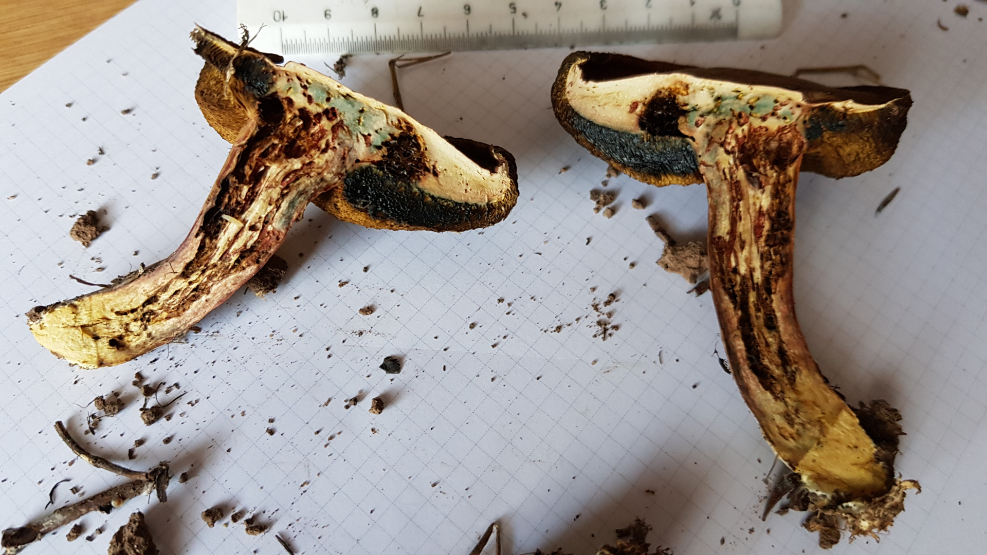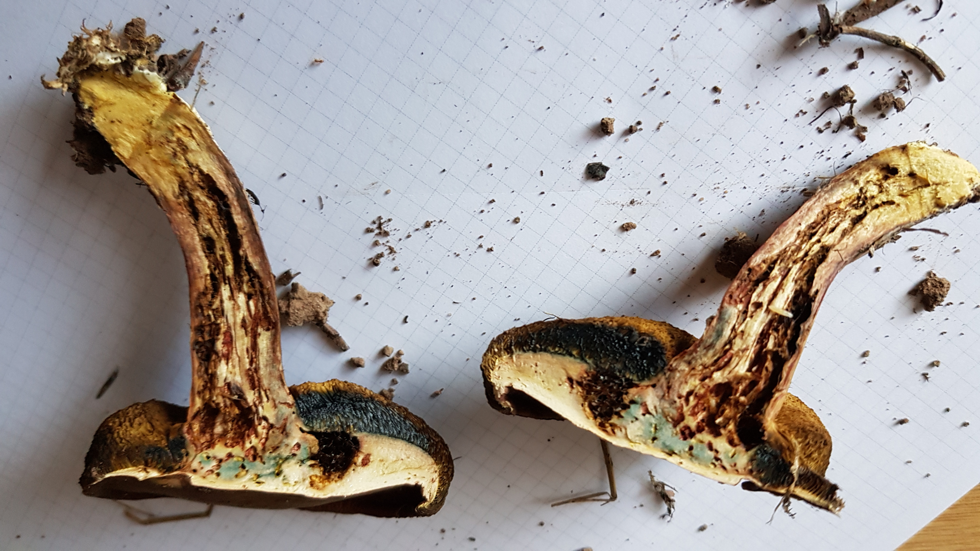 Fleisch in der Stielbasis rötlich; bei Verletzung grüngelblich verfärbend