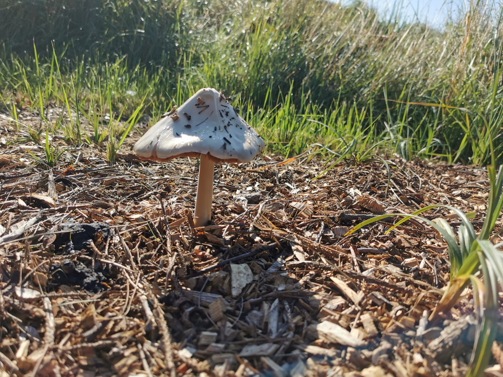 Im Urlaub in Norddaenemark fand ich diesen Pilz. Er wächst auf einem Haufen von Holzspänen. Der Hut hat einen Durchmesser von ca. 10 bis 12 cm und eine zartgrüne Farbe. Die Lamellen sind hellbraun und stehen weit auseinander. Vielen Dank im voraus.