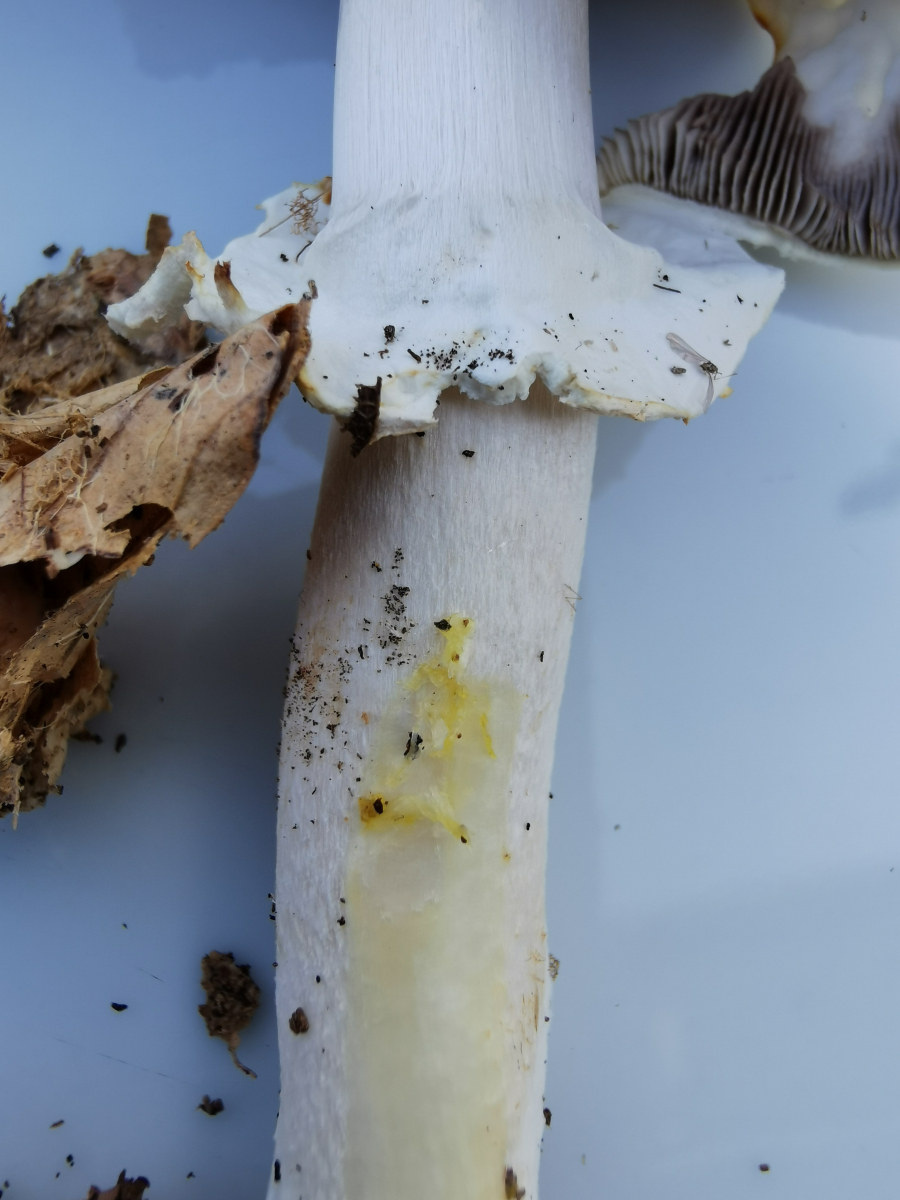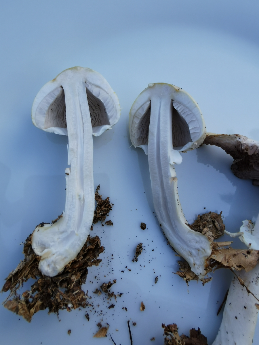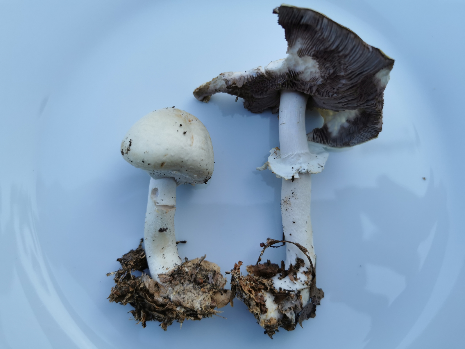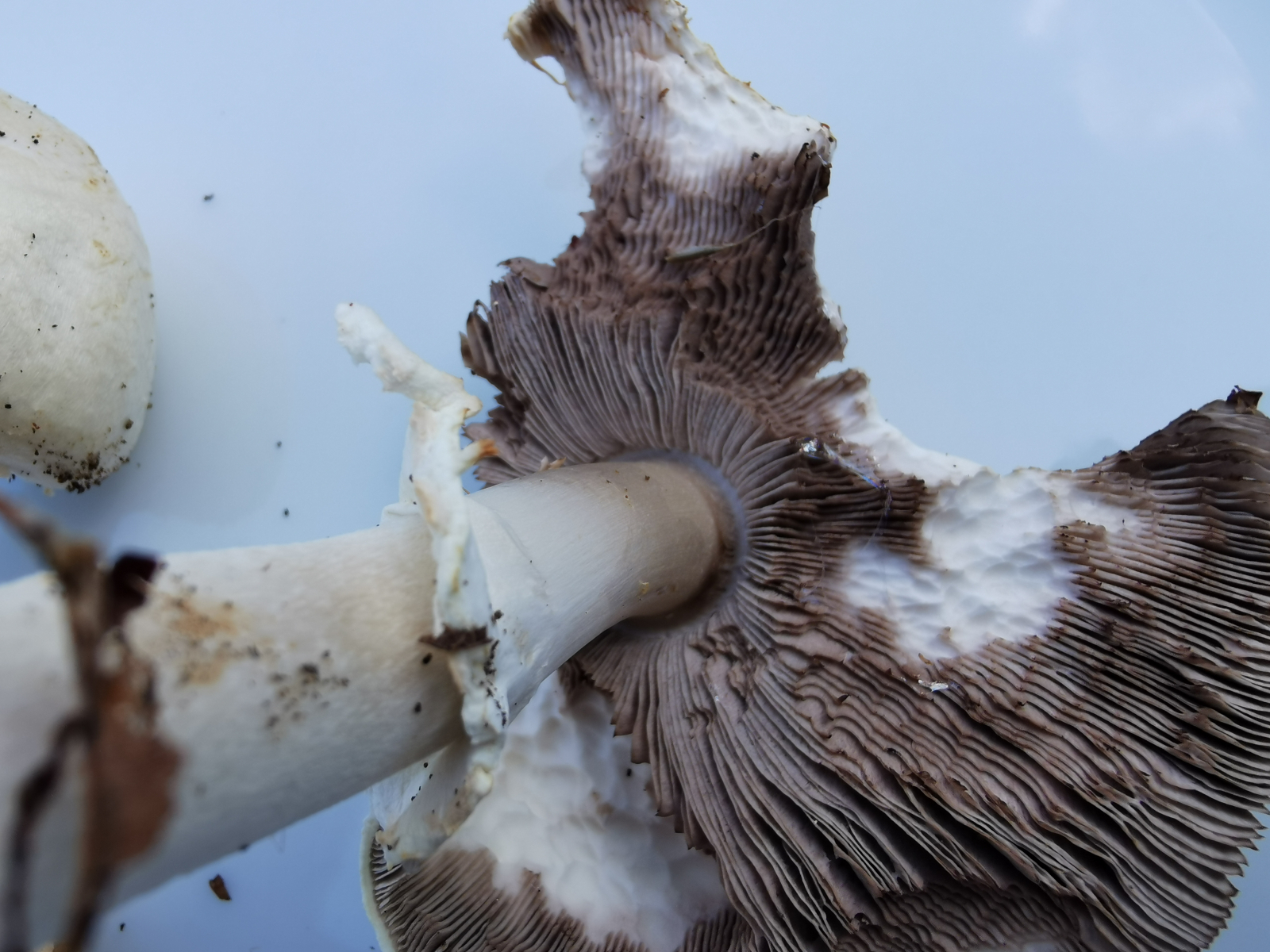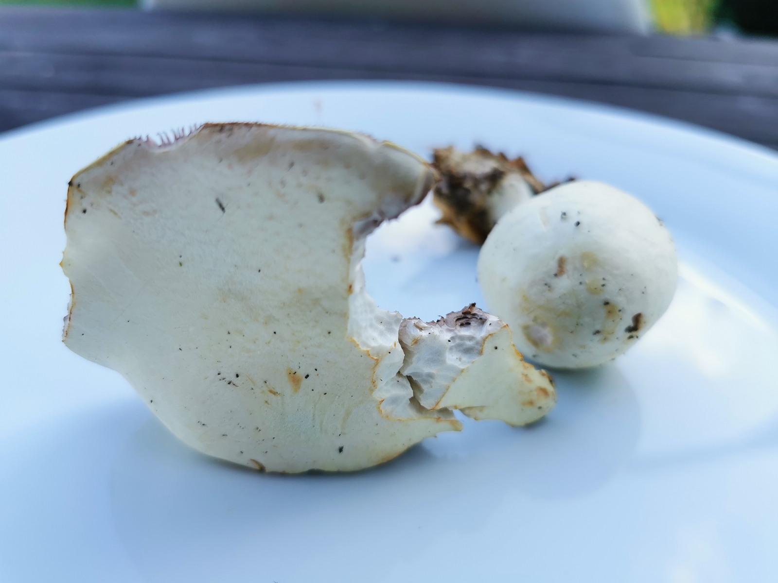 Beschreibung: weiß bis cremefarbener Pilz; Hüte bis 10cm Durchmesser; auf Waldboden wachsend; freistehende Lamellen; Manschette; Sporenpulver dunkel; Fleisch bei Verletzung gilbend; Stilbasis verdickt und abgewinkelt; Geruch lecker…Anis?