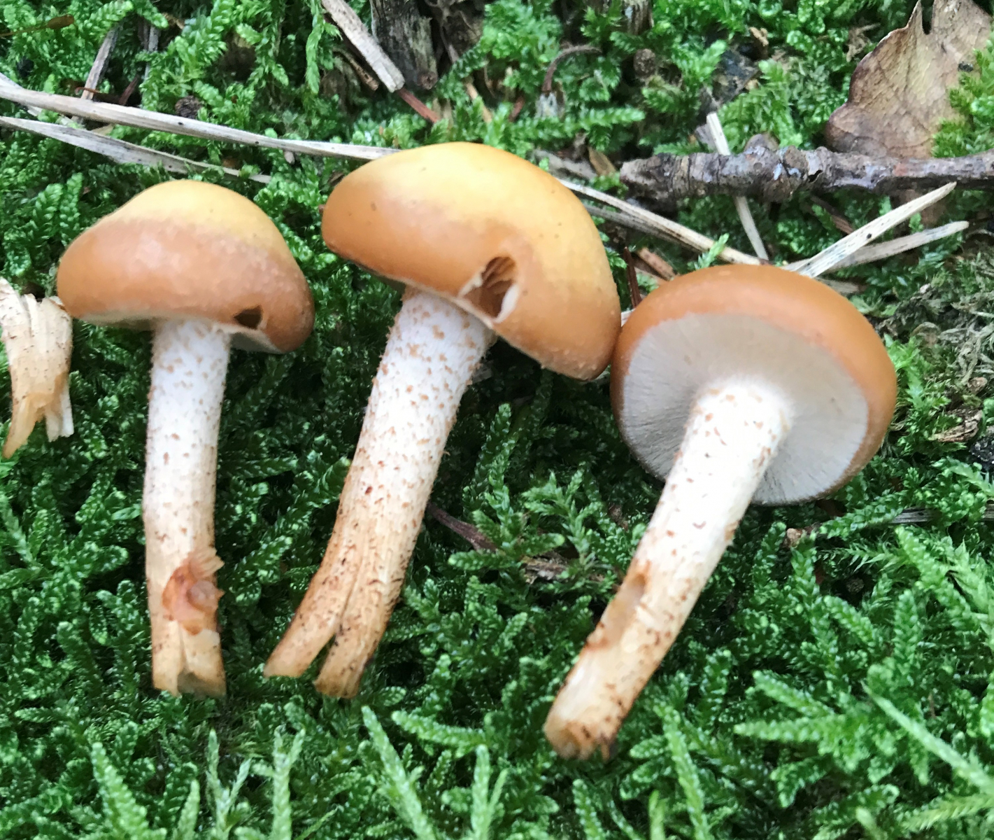 Bei Gifthäublingen ist der Stiel nur silbrig / weißlich überfasert - ohne Schüppchen