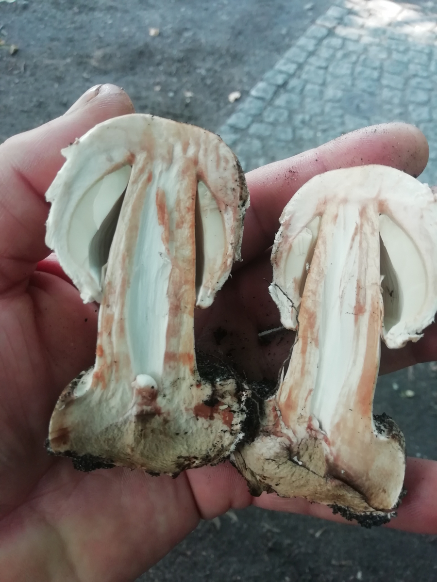 Das ist ein Pilz aus der Reihe der schirmpilze. Vielleicht ein junger Safranschirmpilz das rote beim anschnitt zeigt das an.